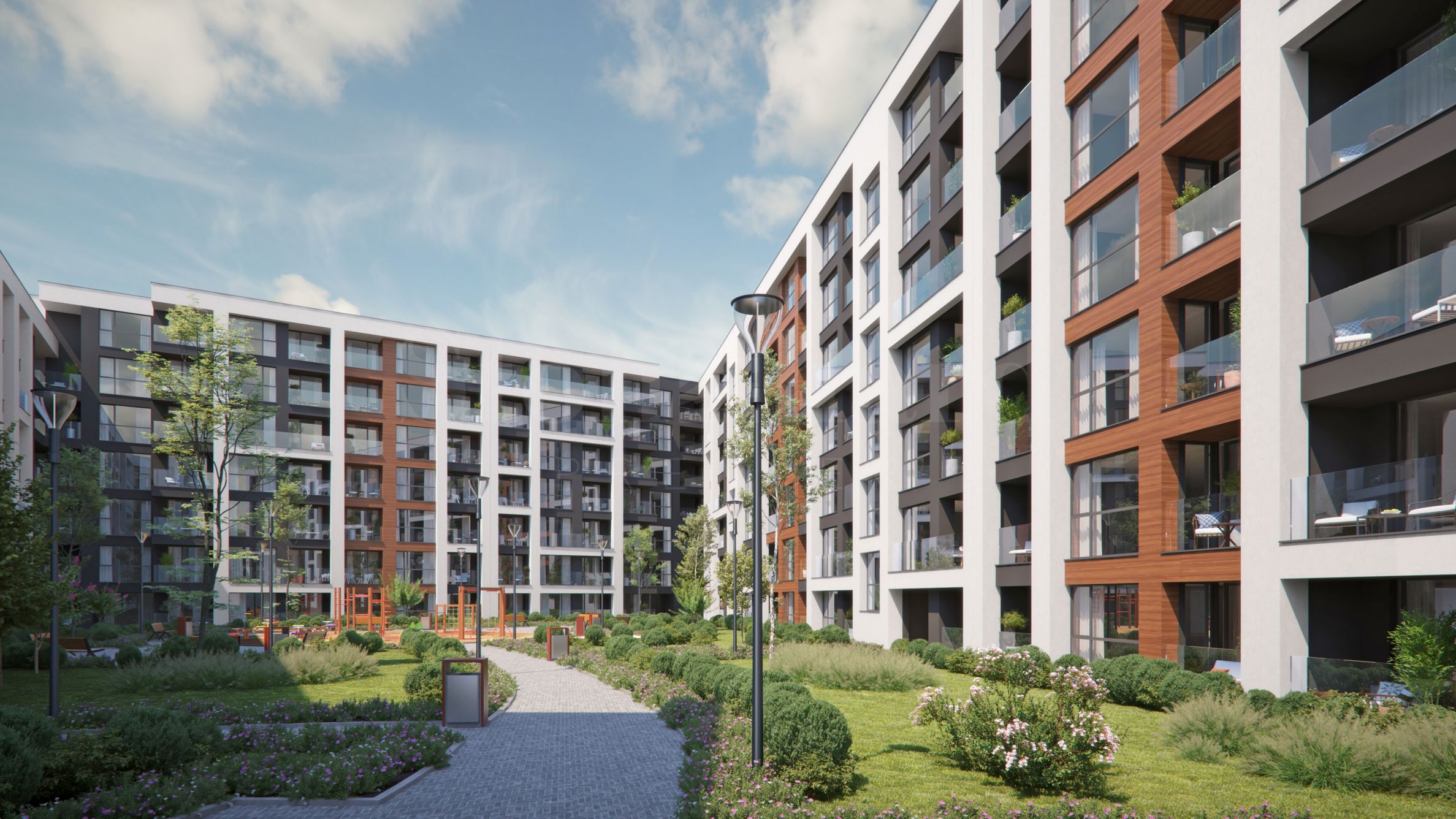 Нов жилищен комплекс с голям вътрешен двор до паркове и удобства