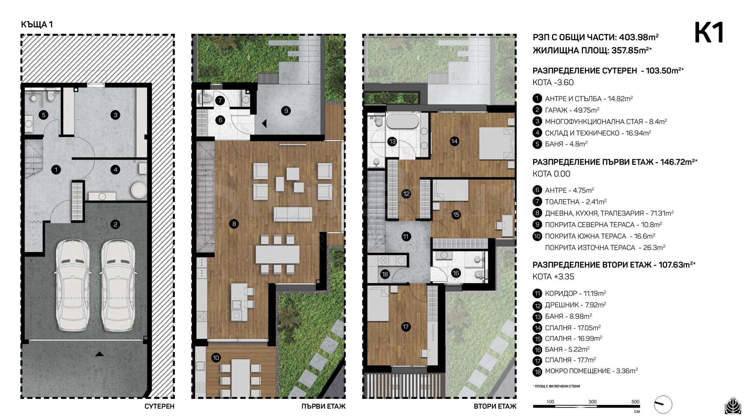 Площи на жилищата: 379.60 м2 - 575.66 м2