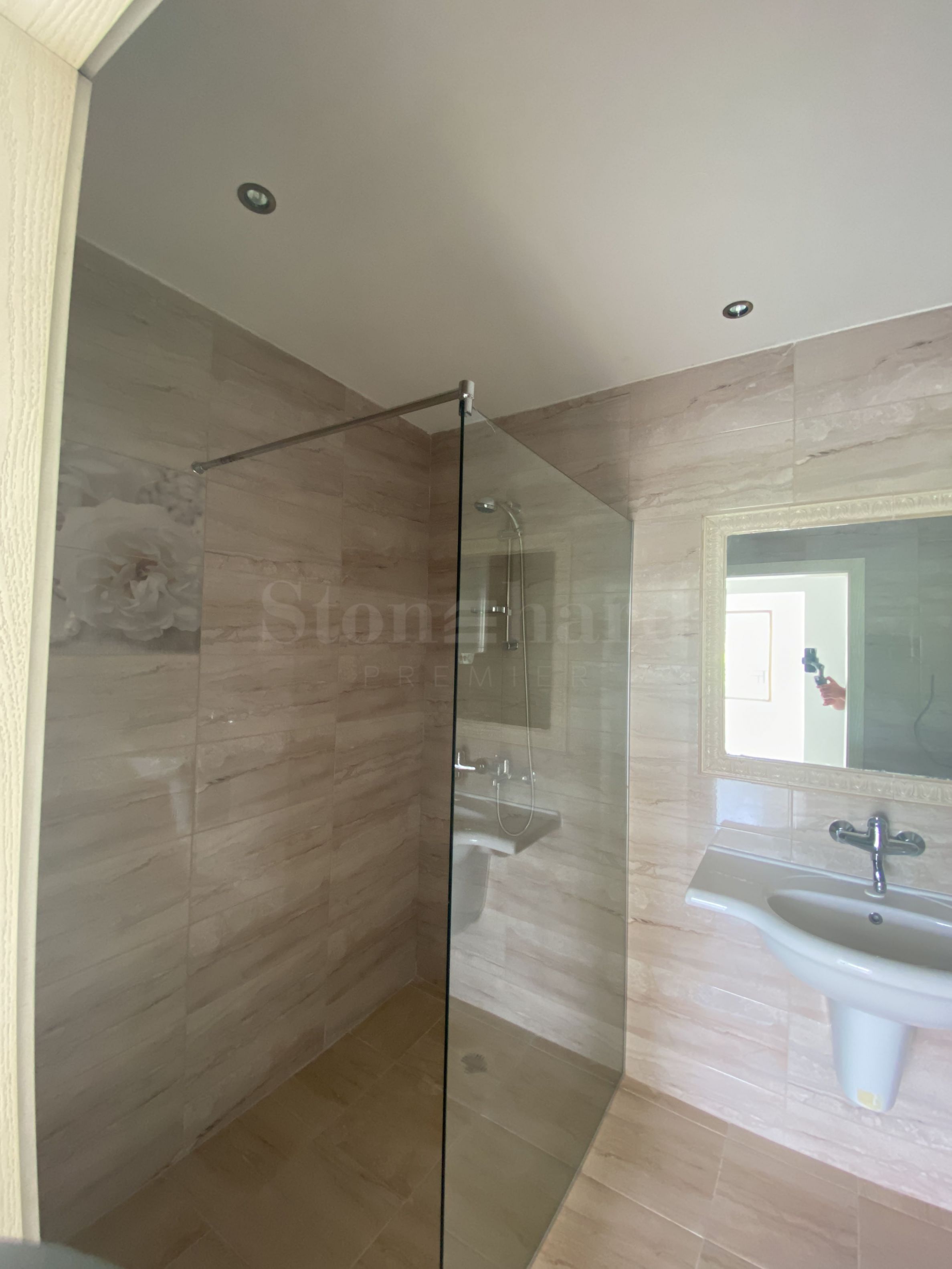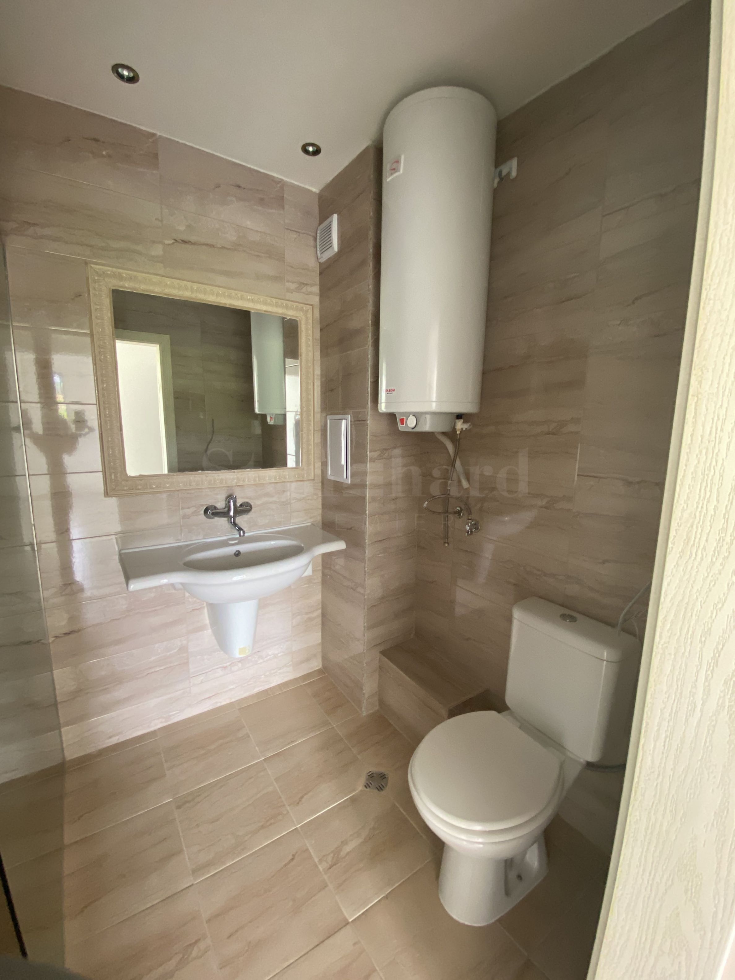 баня – под – теракот, стени – фаянс, душ батерия, моноблок, мивка, душ кабина и бойлер.
