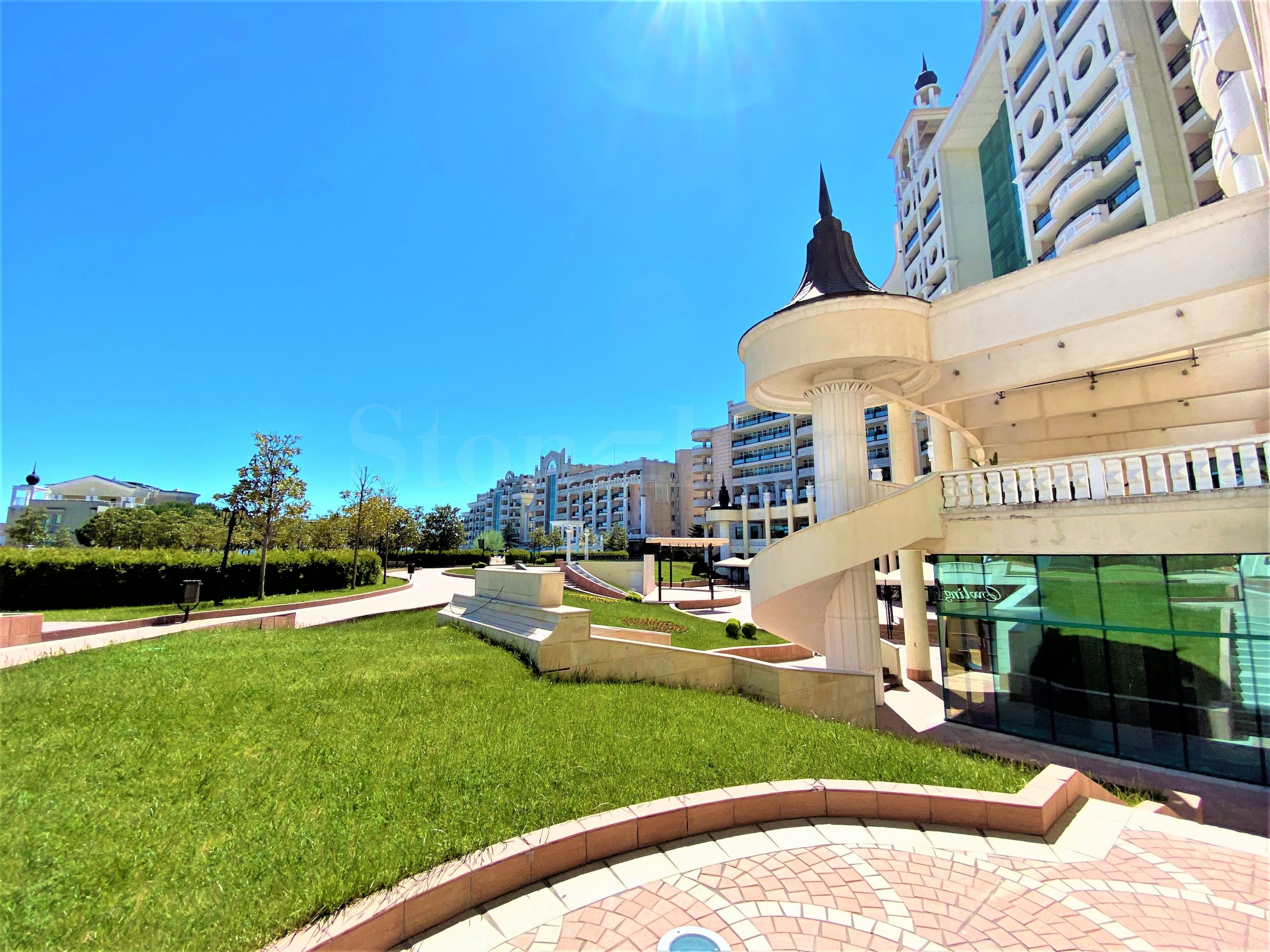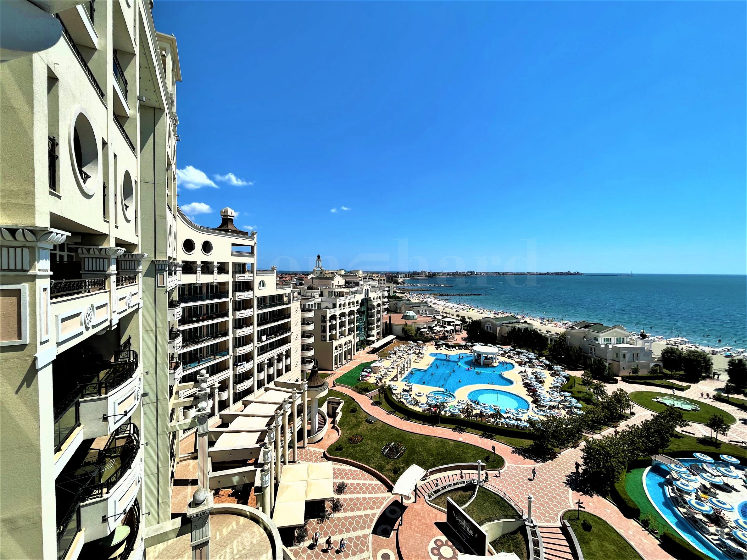 Имотът е с площ от 88 кв.м и се намира на 8-ми етаж в най-голямата и луксозна сграда на комплекса. От терасата му се разкриват превъзходни гледки към морето, плажа и водните атракции на комплекса.