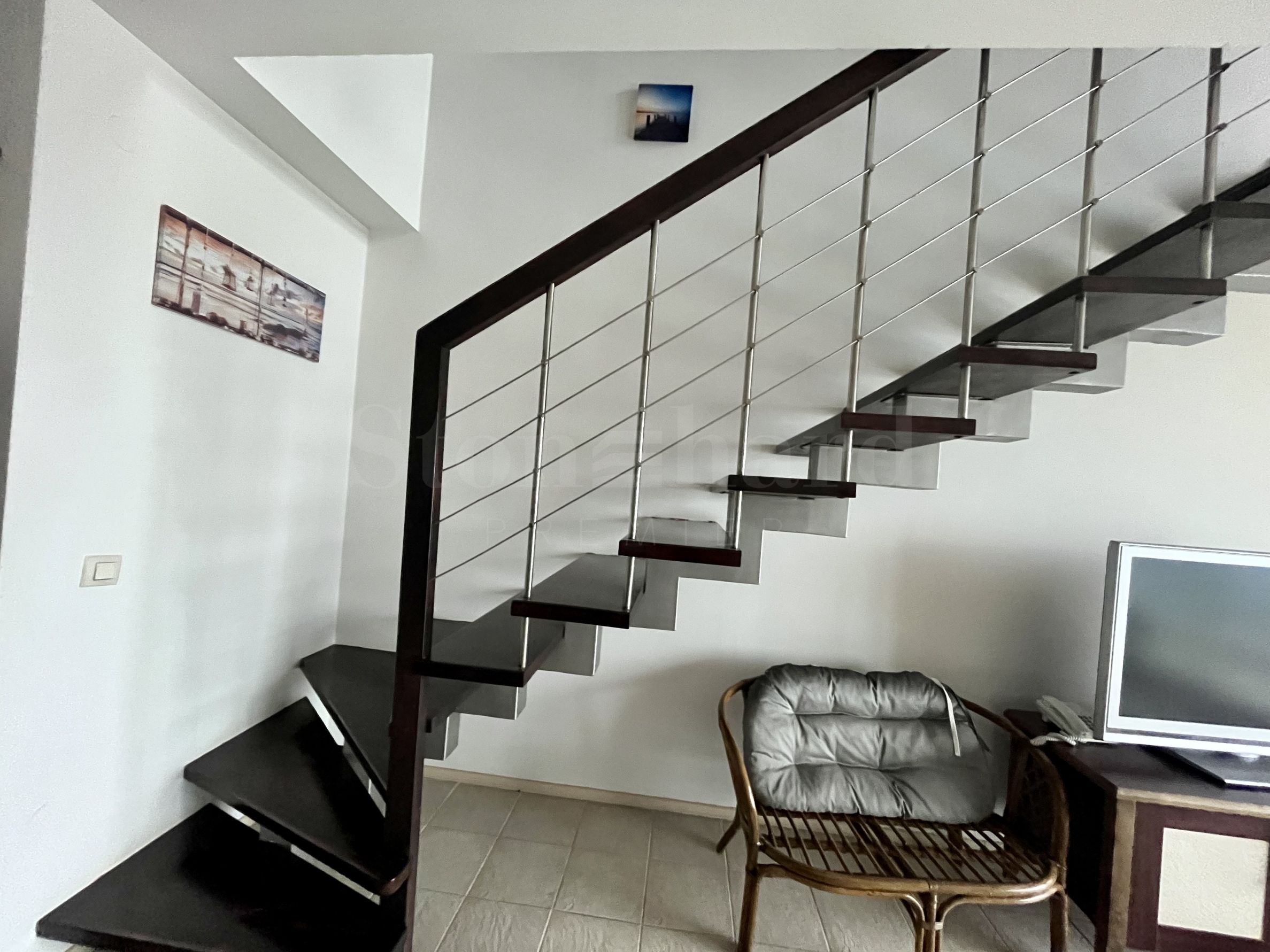 Апартаментът се намира на 1-ви и 2-ри етаж и се състои от всекидневна с кухненски бокс, две спални и две бани. Продава се с наличното обзавеждане и оборудване.