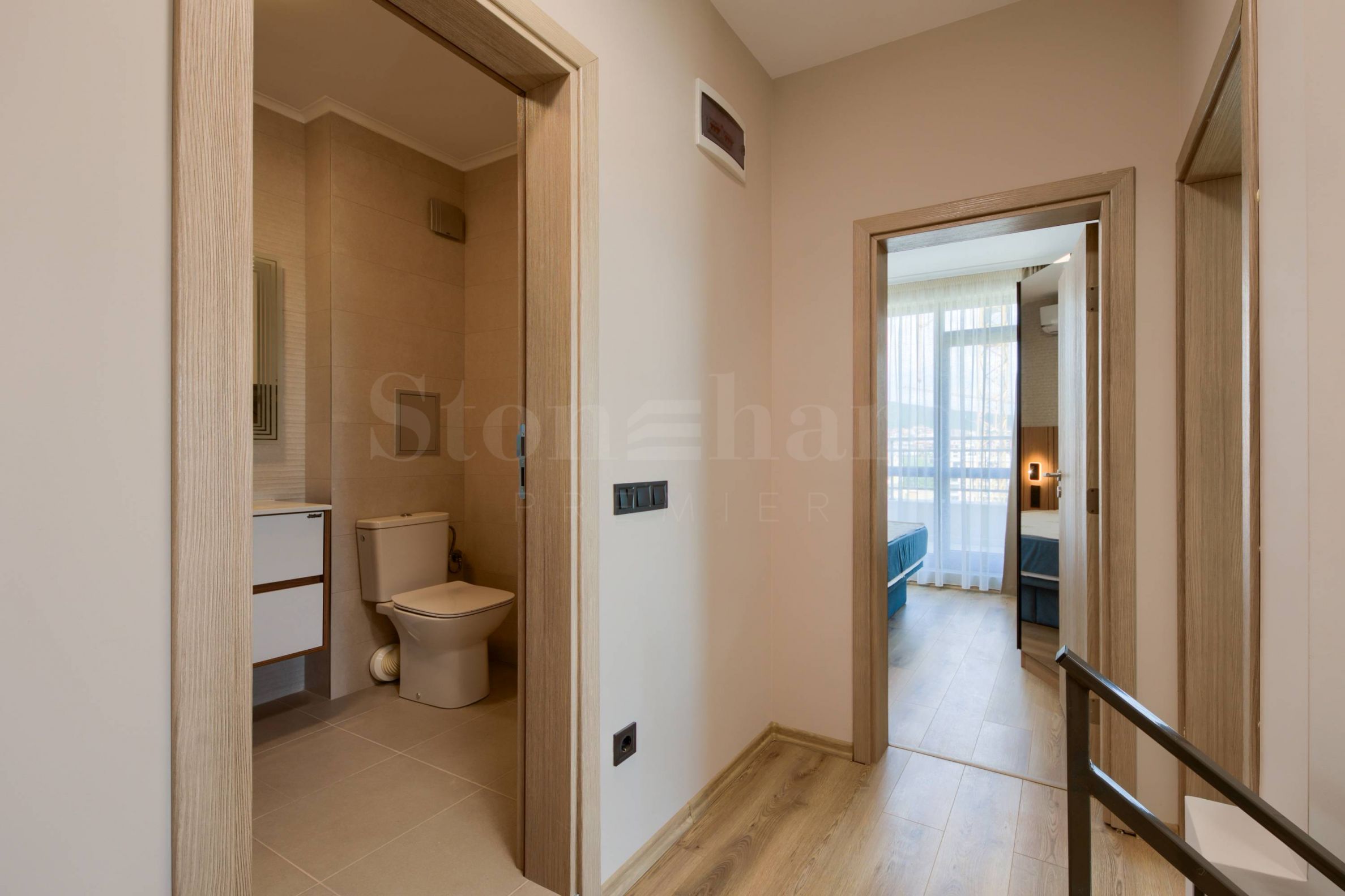 под с ламинат, стени и тавани – шпакловани и боядисани с латекс, декоративен тапет, монтирани ключове, контакти и стенни фасунги, извод за кабелна телевизия, индивидуален климатик;
