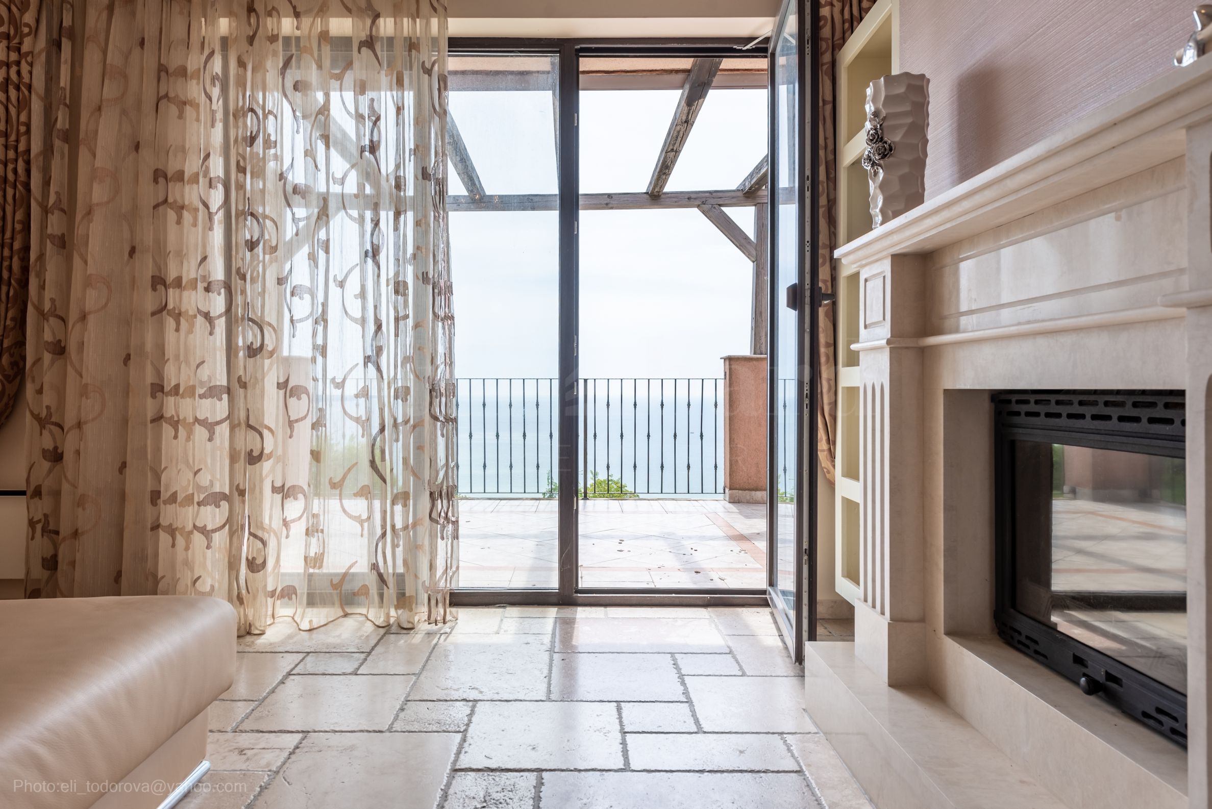 слънчева дневна с мраморна камина;
