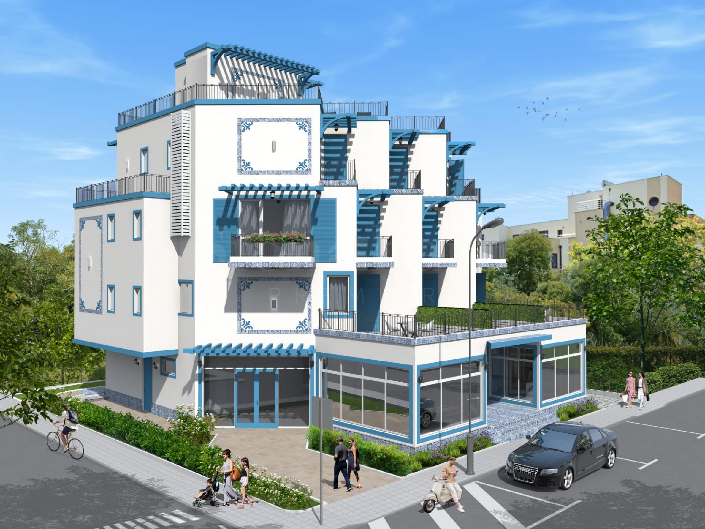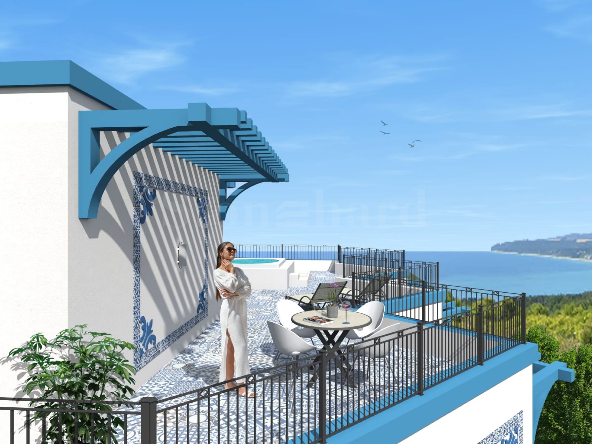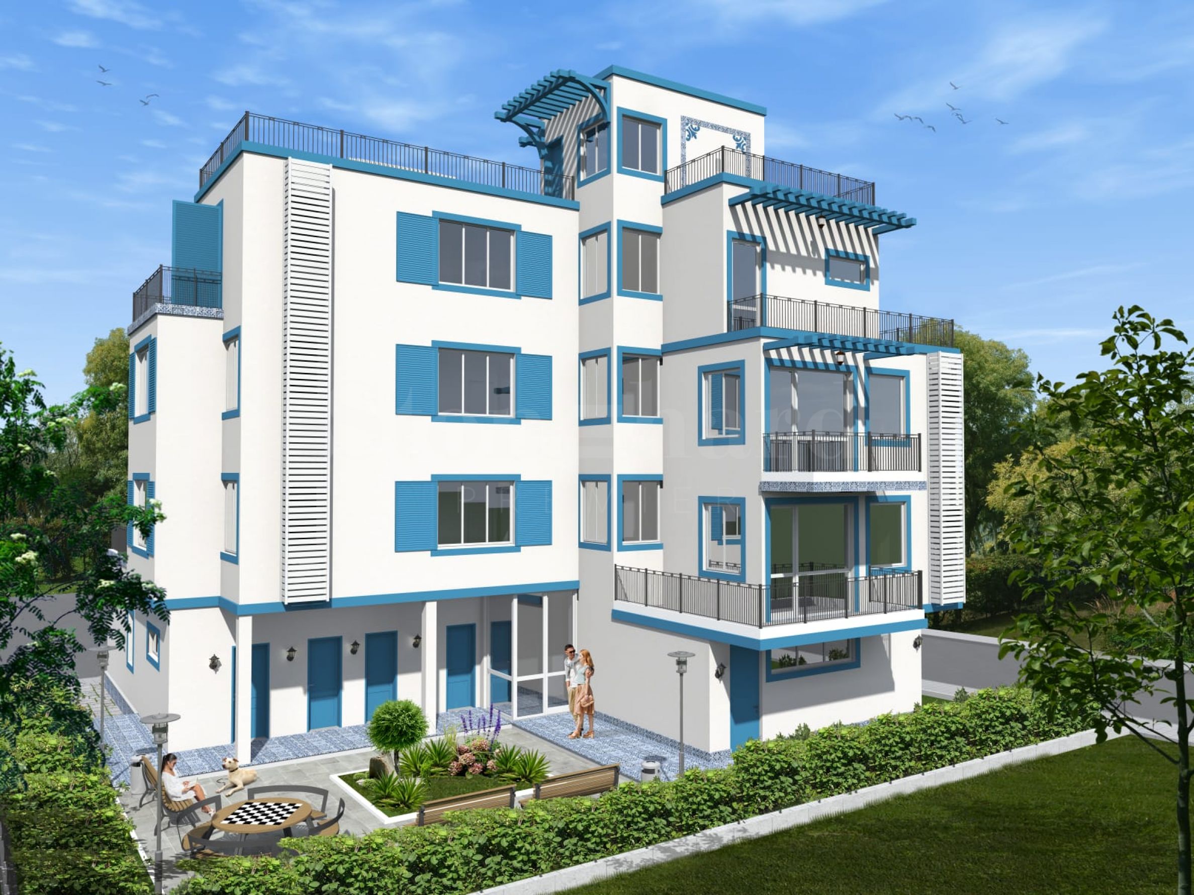 Комплексът предлага двустайни апартаменти, тристаен пентхаус, аптека и кафене на партера, и тераса на покрива с джакузи - удобно място за слънчеви бани и почивка с добра гледка.