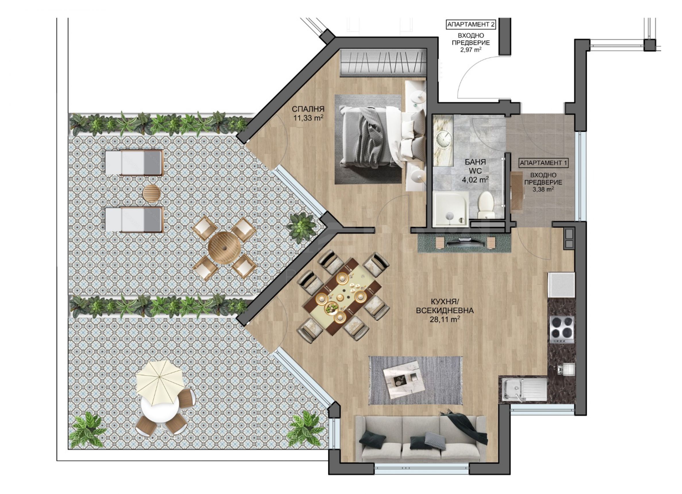 Типове имоти в сградата/комплекса: Двустайни апартаменти