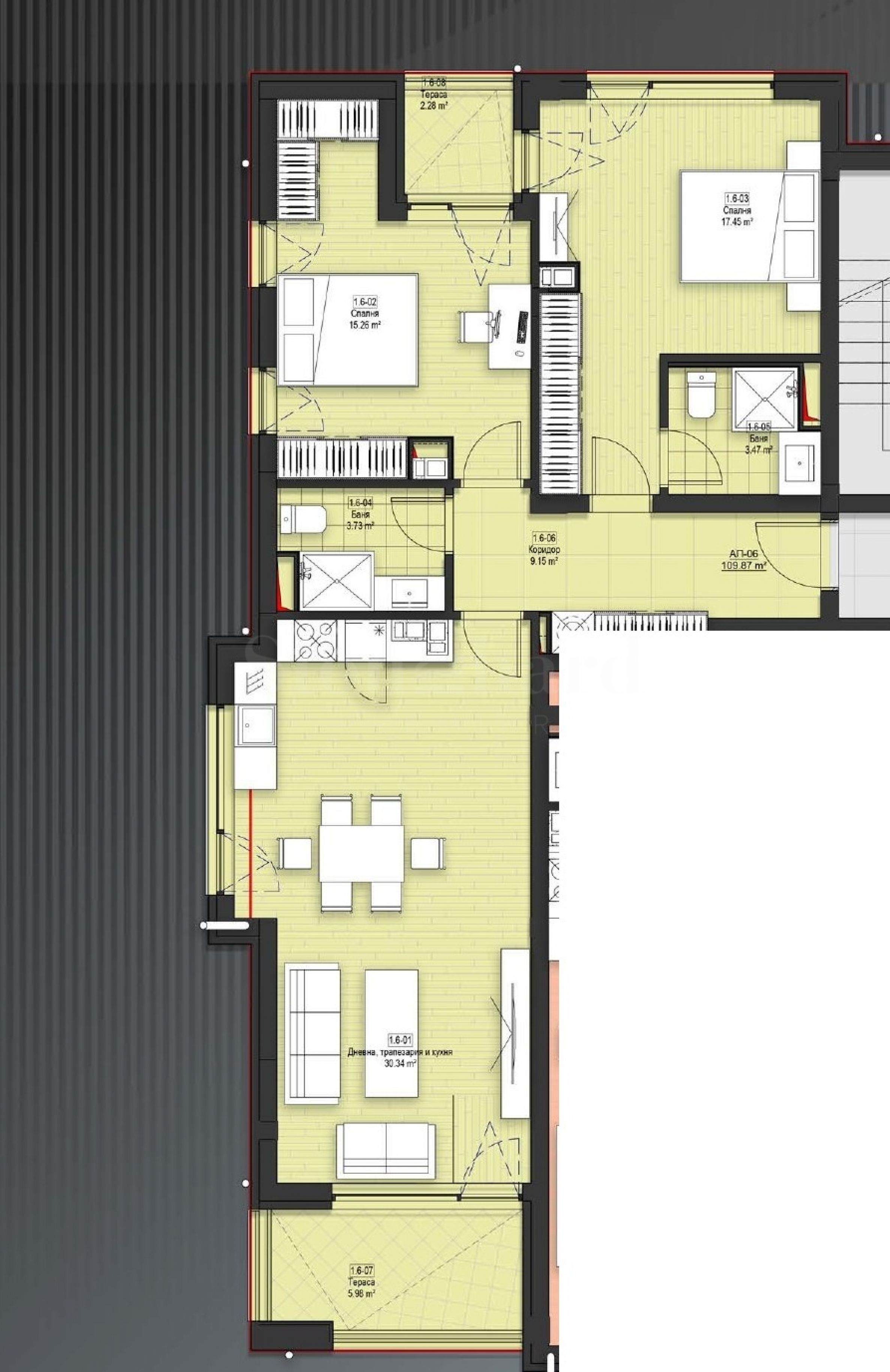 Апартаментът се предава на шпакловка и замазка и предоставя възможност за персонализация и избор на материали и интериорни решения.