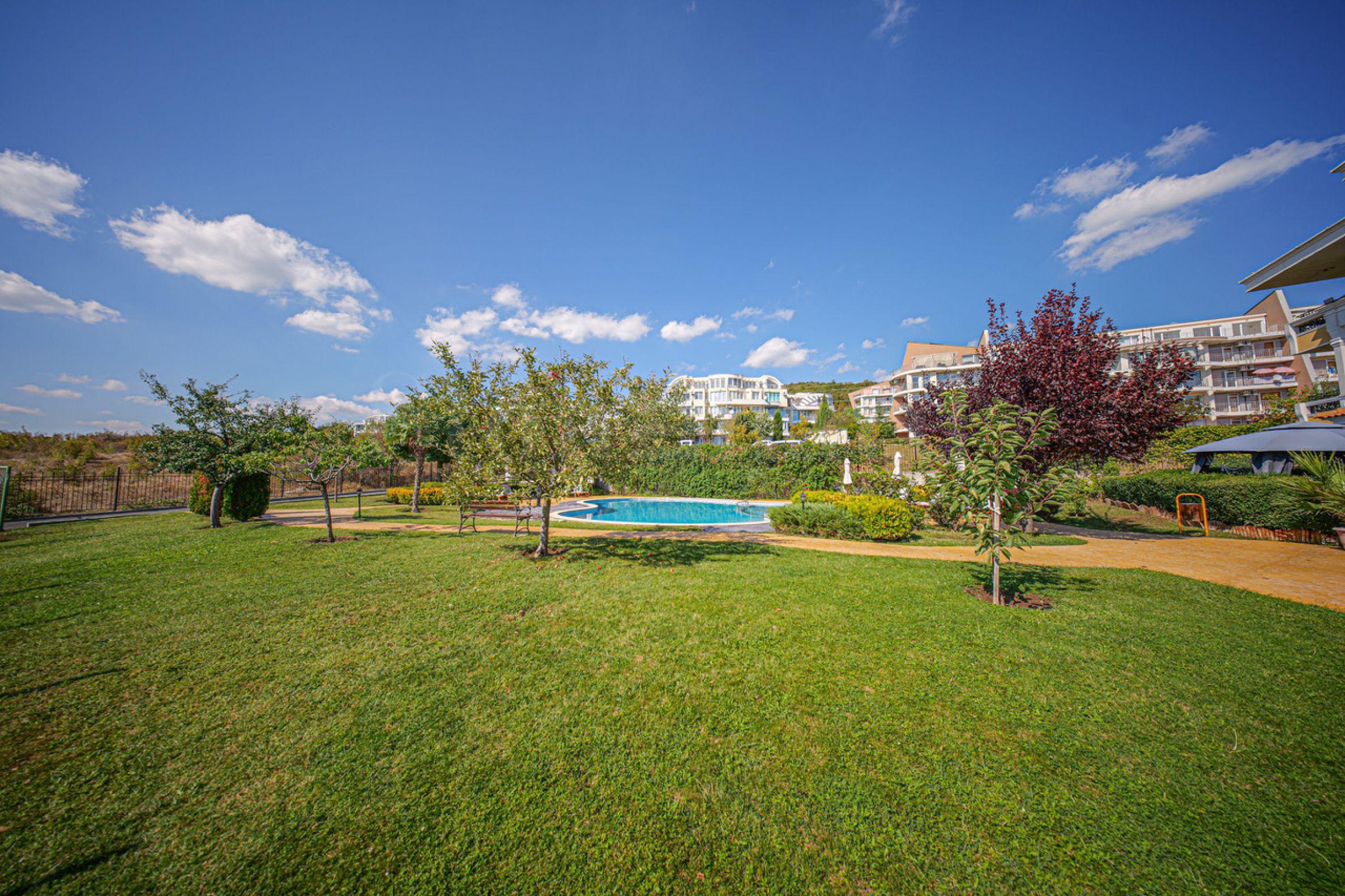 Имотът е разположен на 2-ри етаж, има 32.98 кв.м обща площ и разполага с балкон с гледка към басейна на комплекса.