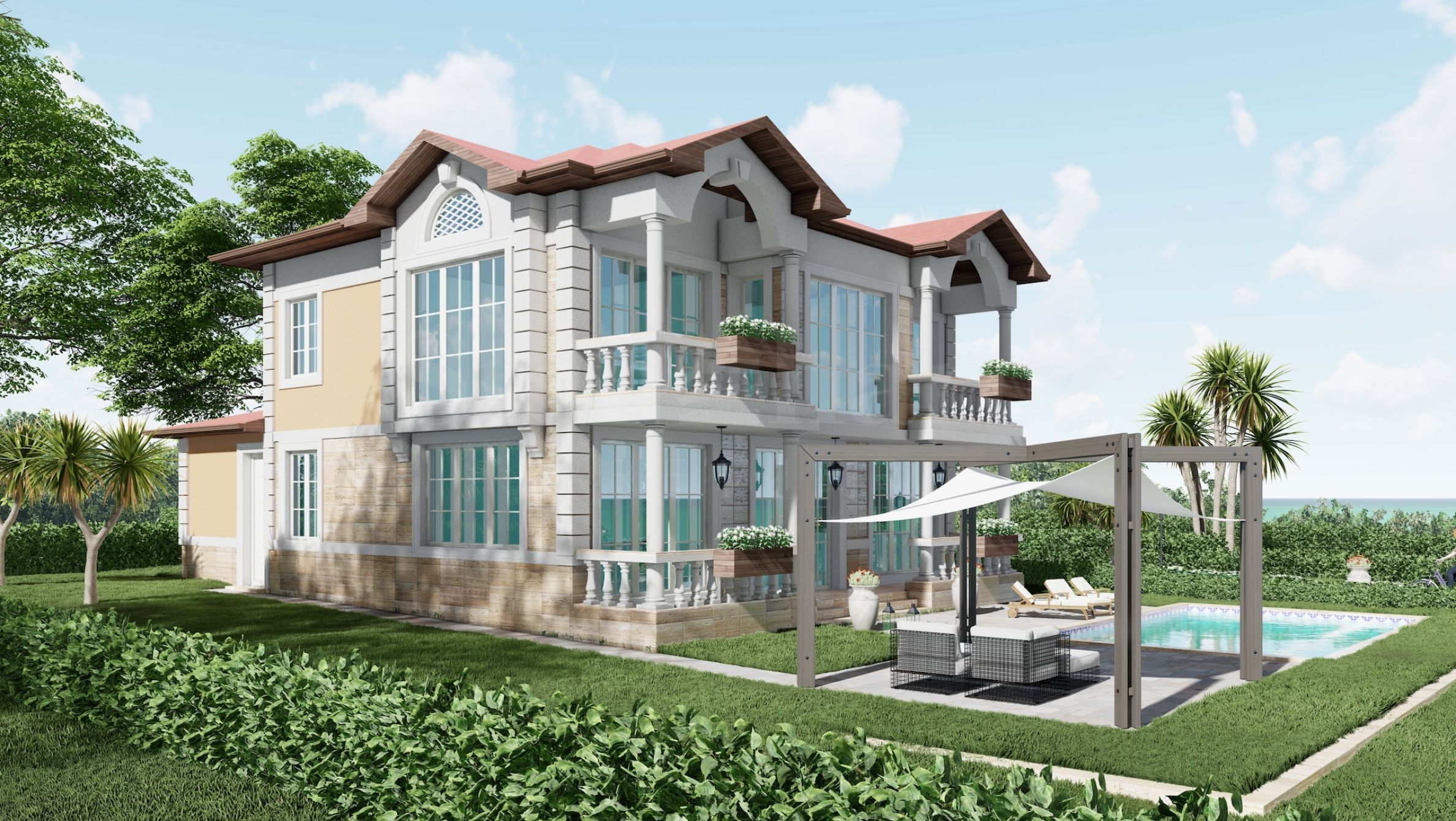 Комплексът се състои от вили и таунхауси с просторни, самостоятелни дворове, паркоместа, басейни, гаражи, веранди с красиви гледки към морето и залива на Слънчев бряг.