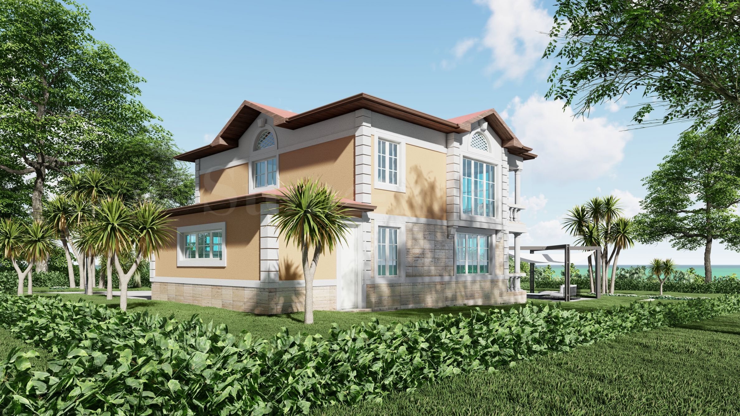 Вилата е на два етажа, с РЗП - 282 кв.м, разположена върху парцел от 540 кв.м, разполага с голям хол с камина, 3 спални, панорамна веранда с гледка море и планина. Издава се в степен на завършеност "до ключ", с най- високо качество на материали и изработка.