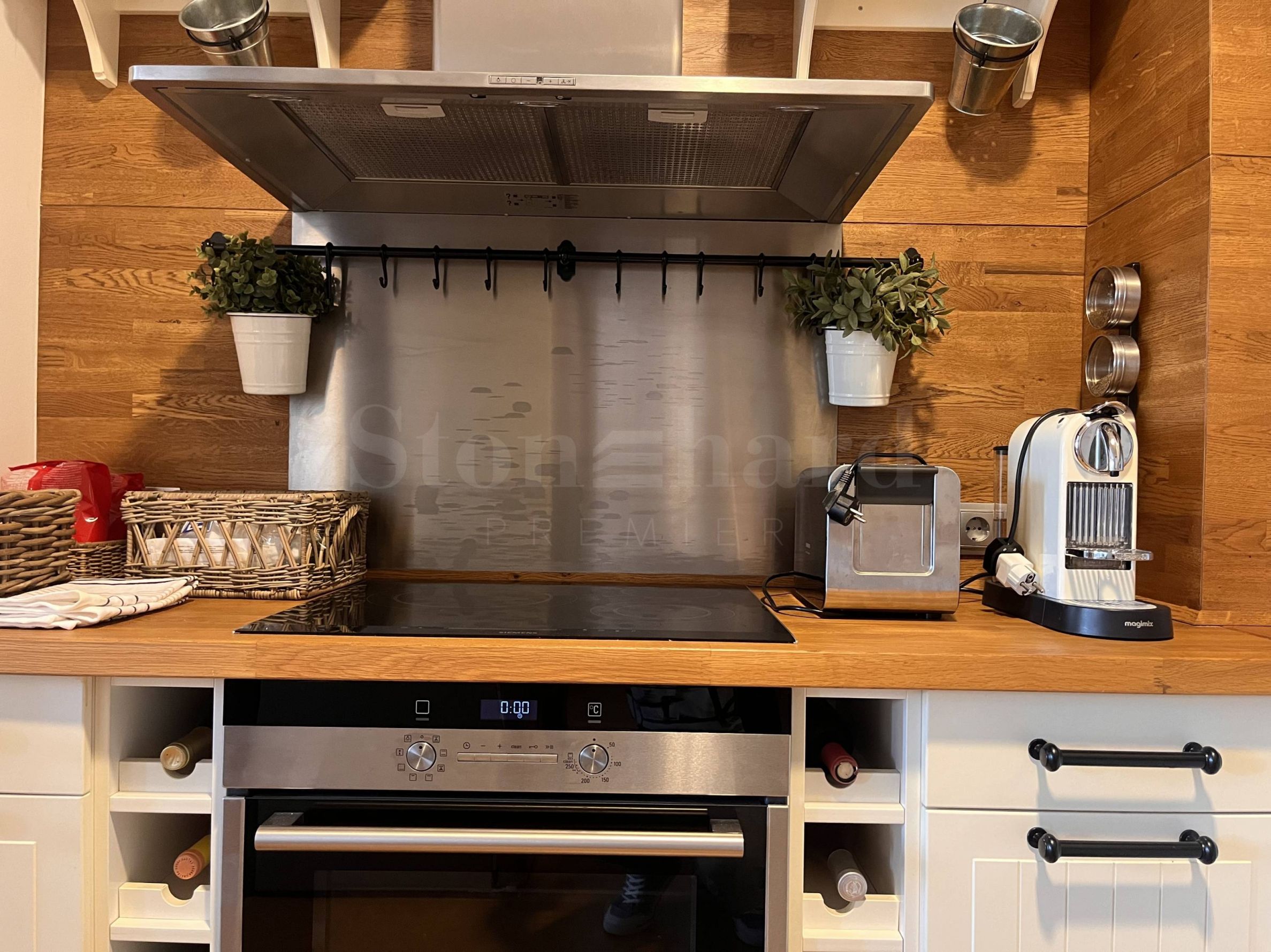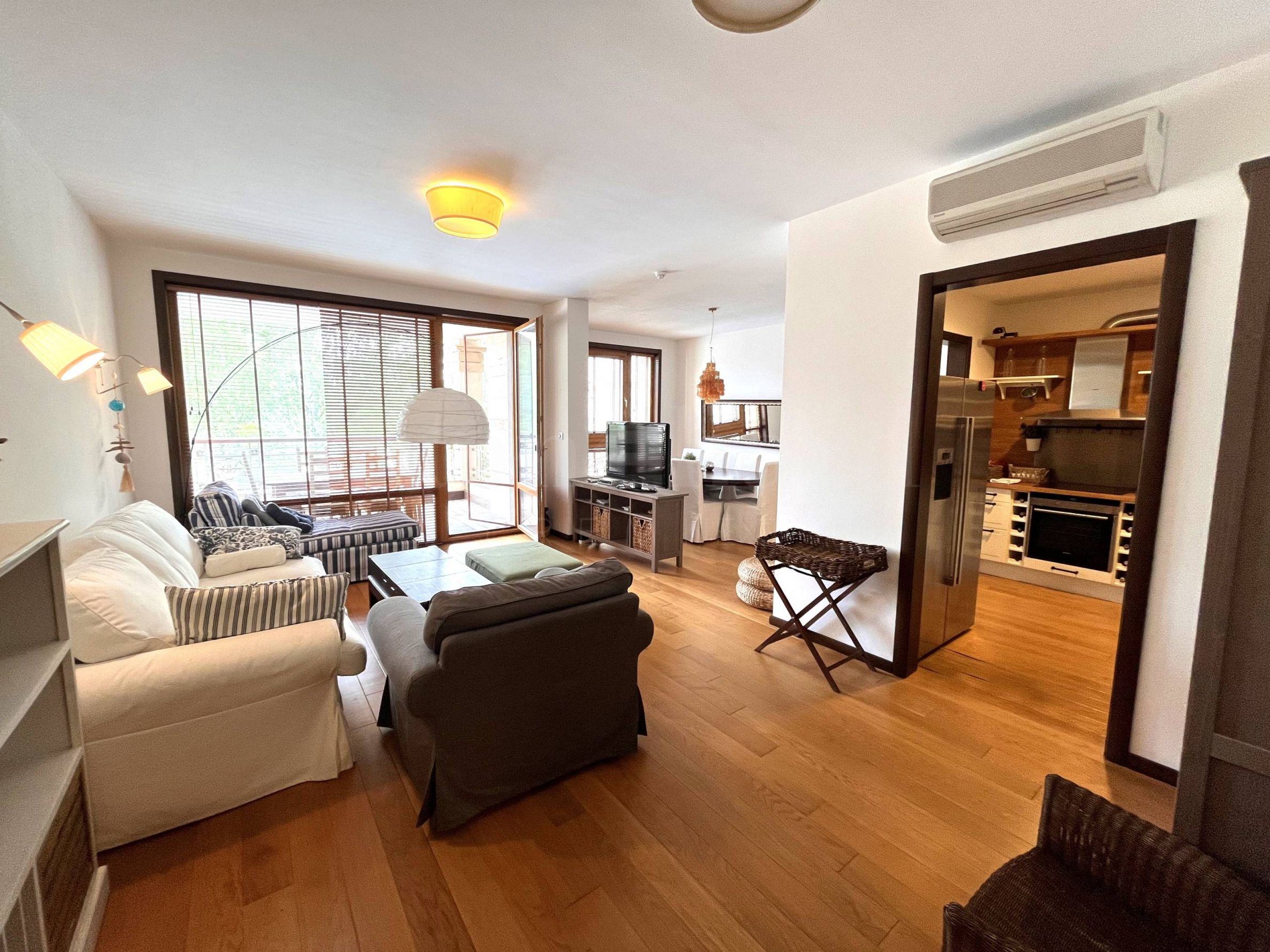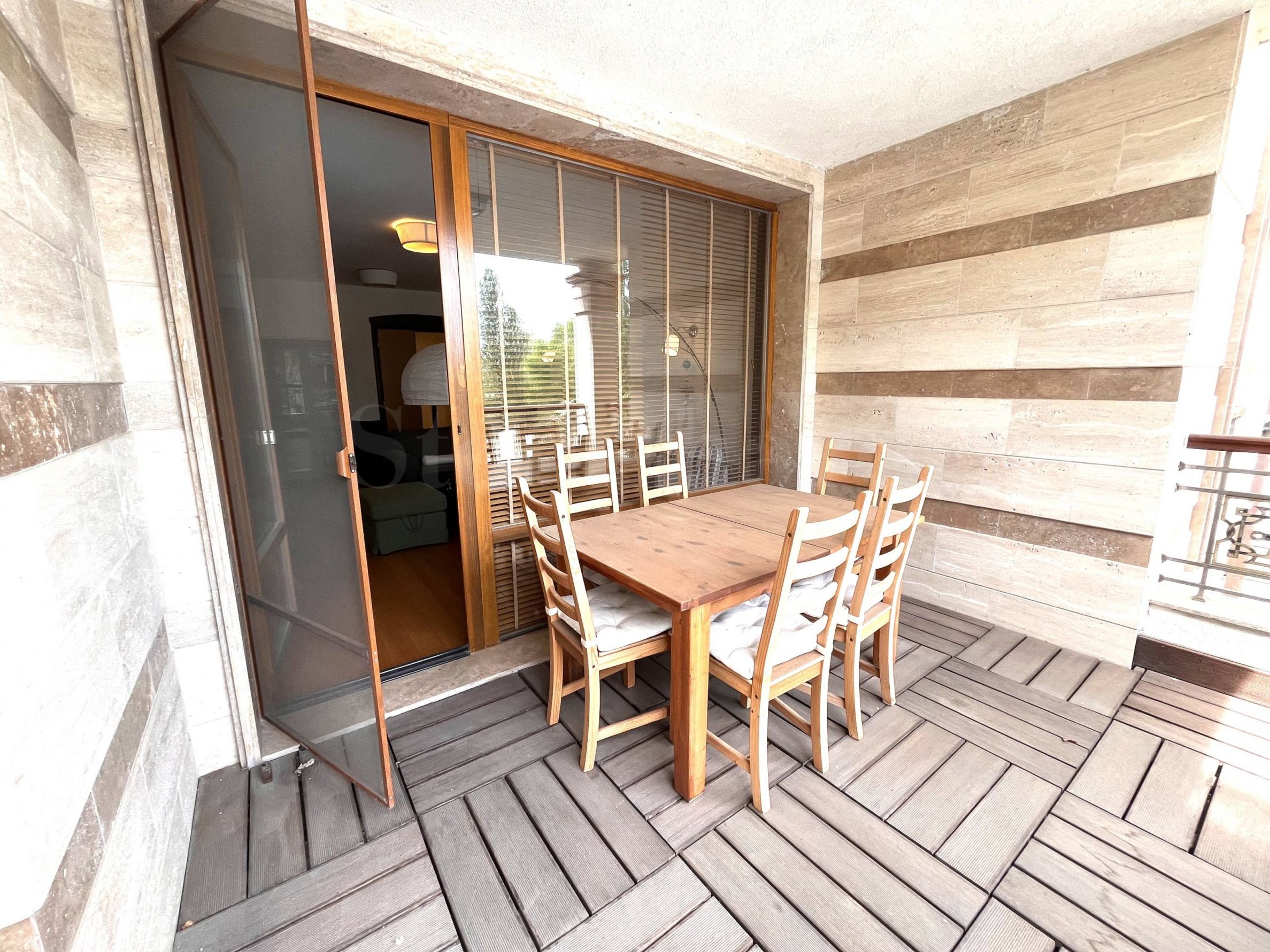 две тераси. Жилището е напълно обзаведено и оборудвано с модерни и комфортни мебели, висок клас уреди и с внимание към всеки детайл. Дограмата е от евкалиптово дърво и предлага отлична шумоизолация, а подът е с трислоен естествен паркет.