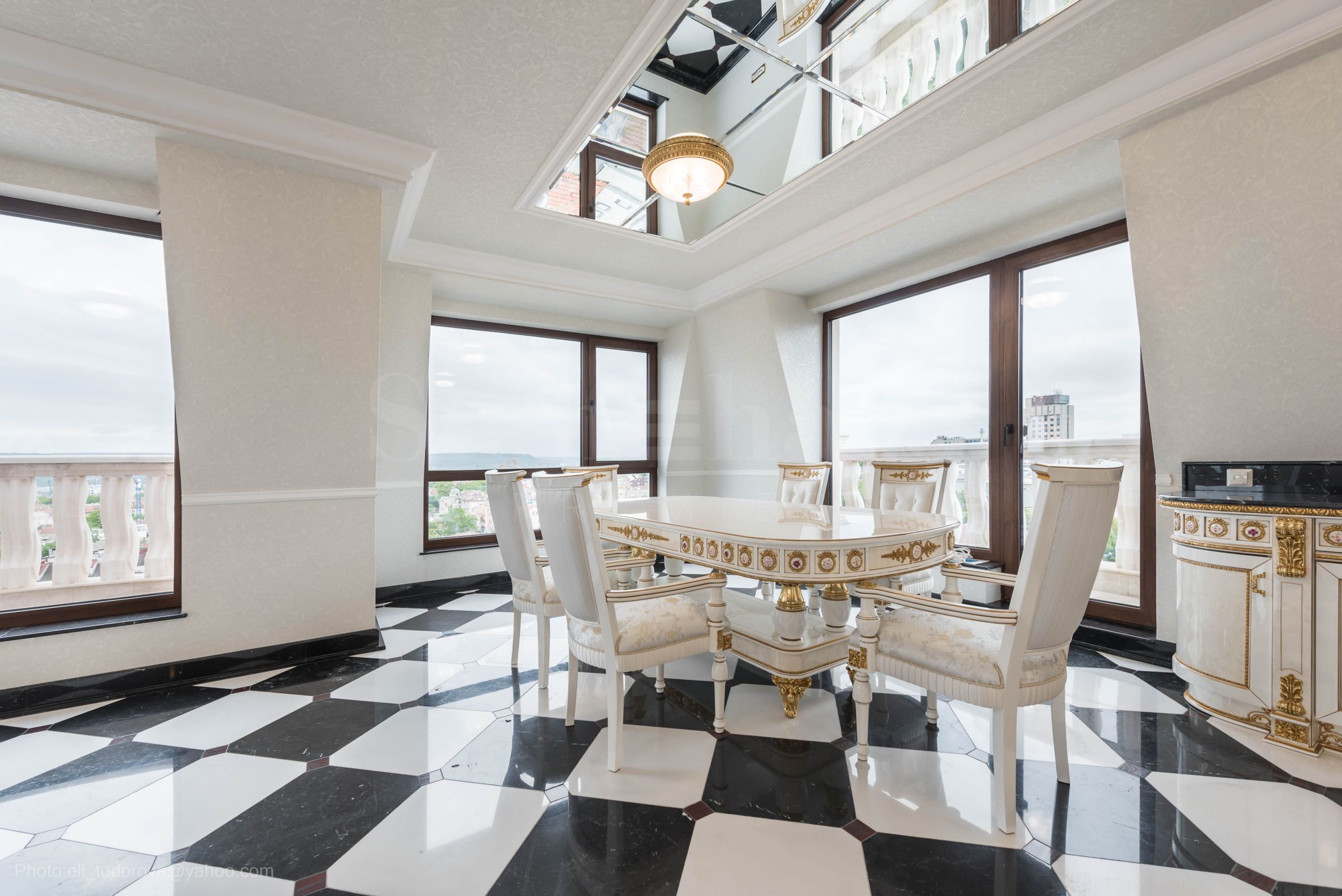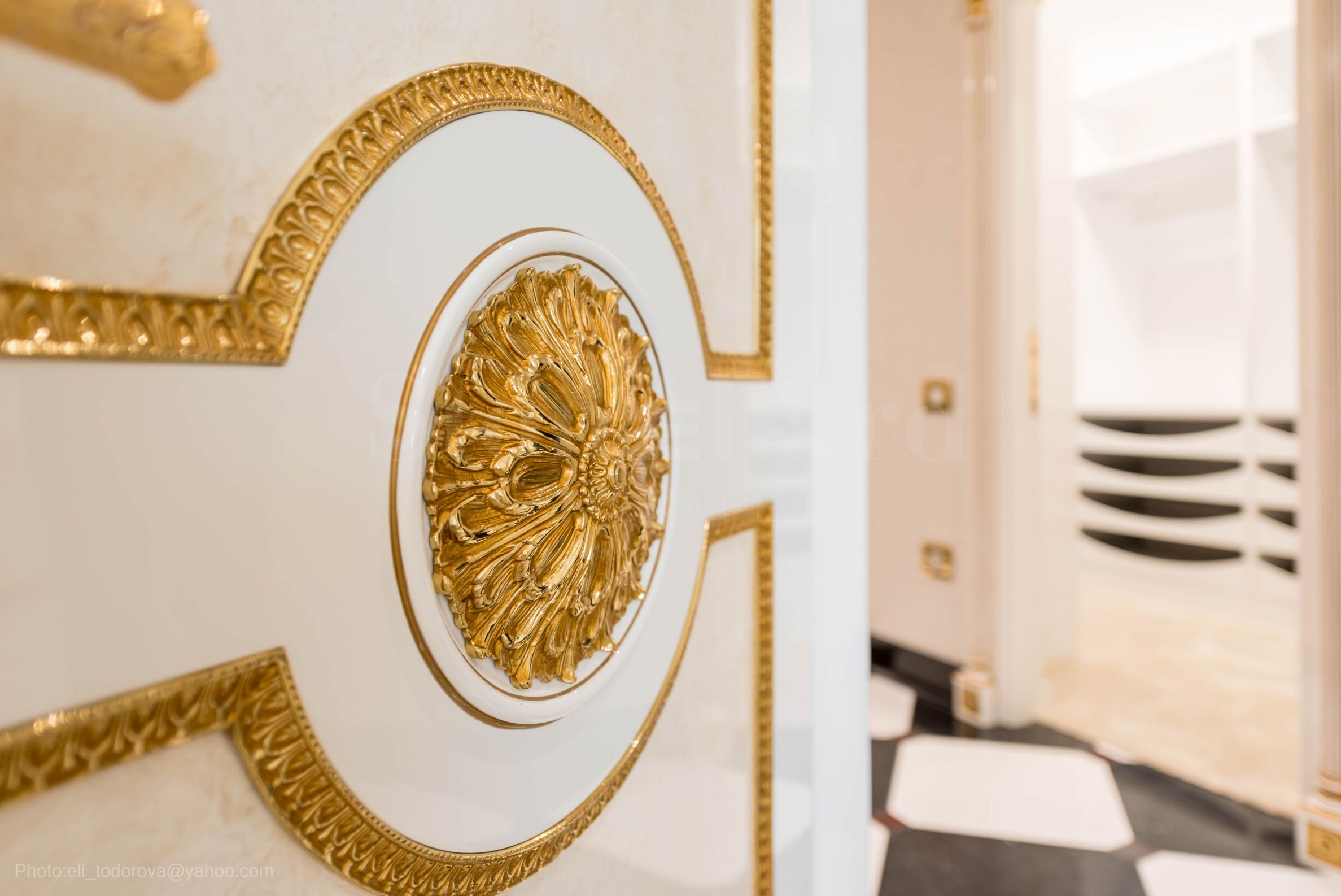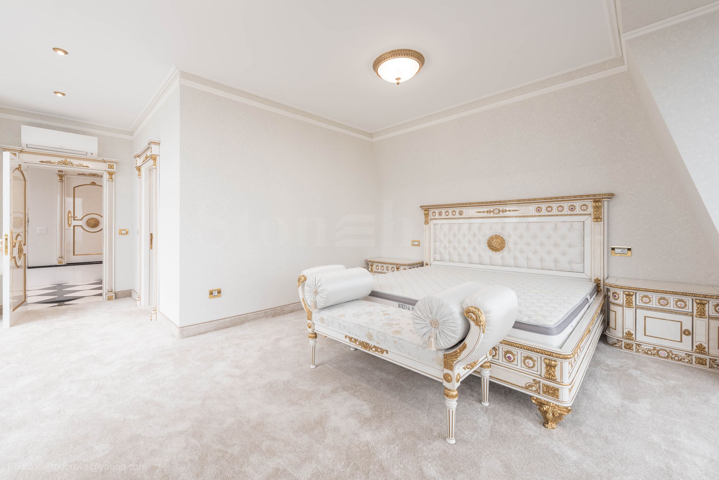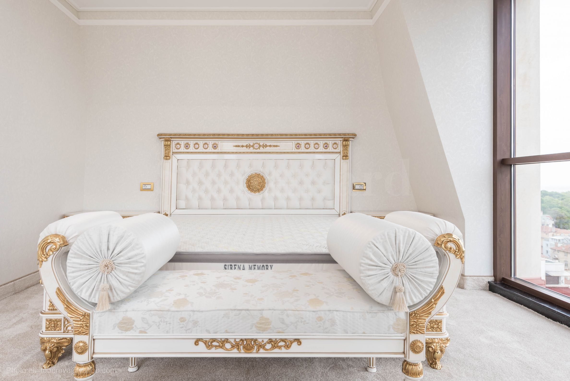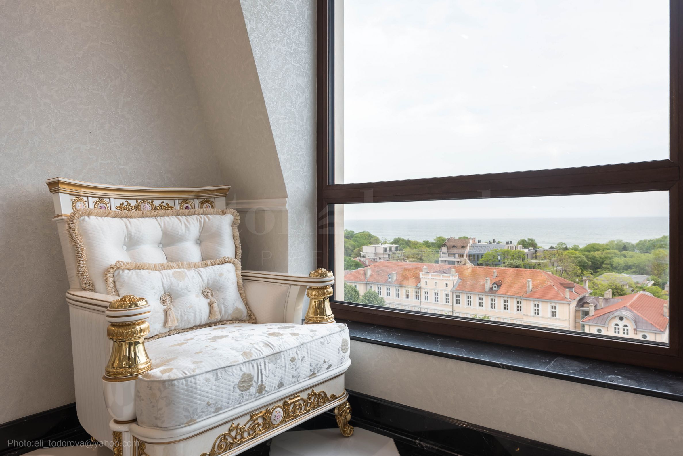 Интериорът е изящен, светъл и хармоничен, истинско вдъхновение от френската класика, предлагащ невероятна "бяла симфония", с преобладаваща в целия имот златната украса на мебелите и стените. Това е ексклузивен имот с характер - истински аристократичен ансамбъл между историческия дух на епохата и модерен свят.