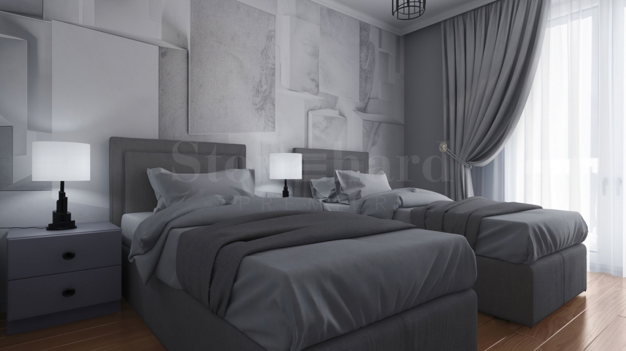 две тераси.Жилището се издава в степен на завършеност "до ключ", готово за обзавеждане, с оборудвани бани. Има опции за няколко варианта бутиково обзавеждане по проект.