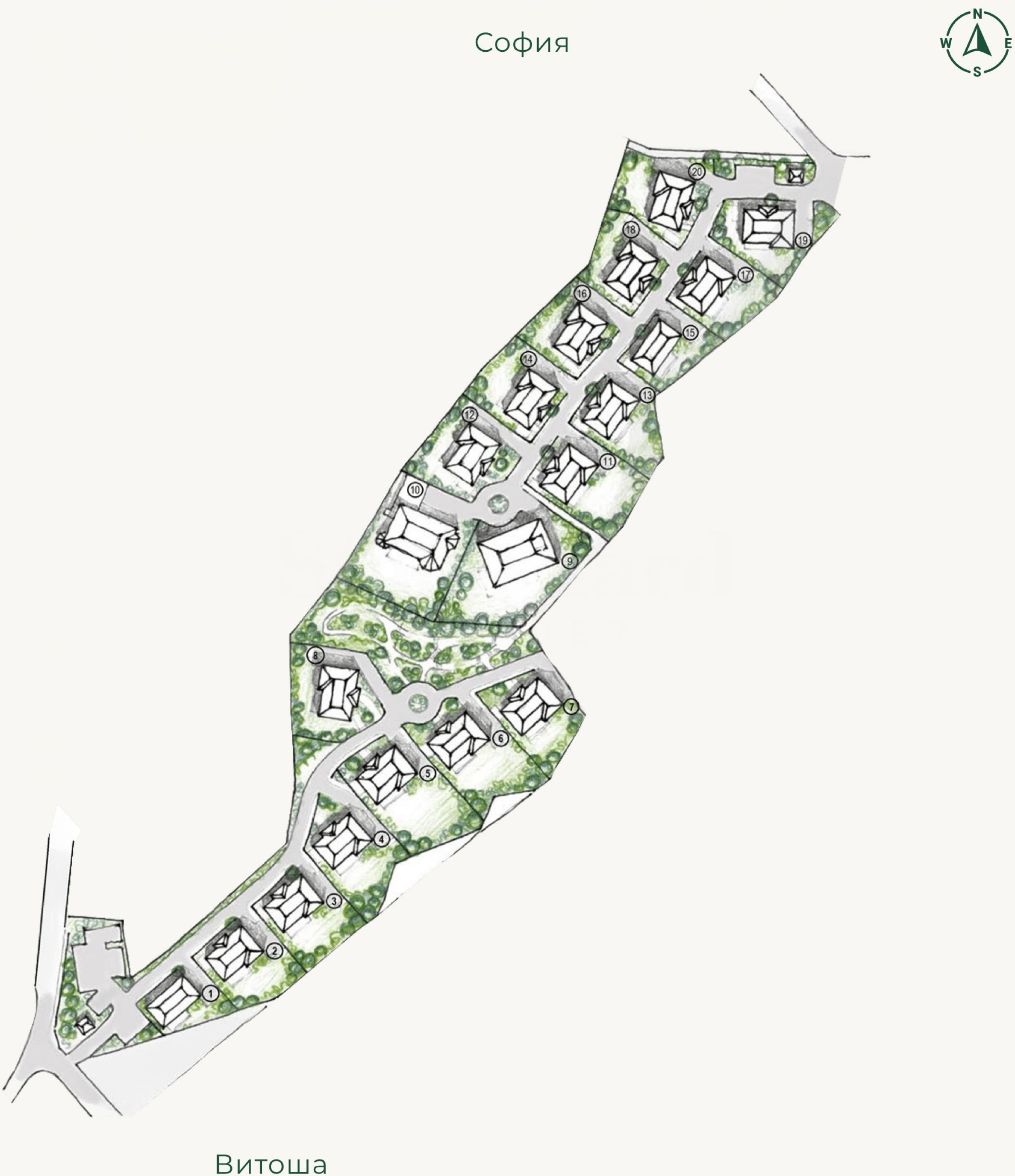 Комплексът се състои от 20 луксозни еднофамилни къщи, всяка изградена върху самостоятелен парцел с площ от 420 до 1300 кв.м. Къщите са с разгъната застроена площ между 340 и 825 кв.м, функционално проектирана и разпределена по начин, целящ постигане на максимален комфорт и качество на живот. Елегантните фасади с непреходна визия, високите тавани, просторни спални със собствени бани, обширните дневни с прилежащи трапезарии, слънчевите, професионално озеленени дворове и безупречно качество на изпълнение са само малка част от това, което прави този имот специален.