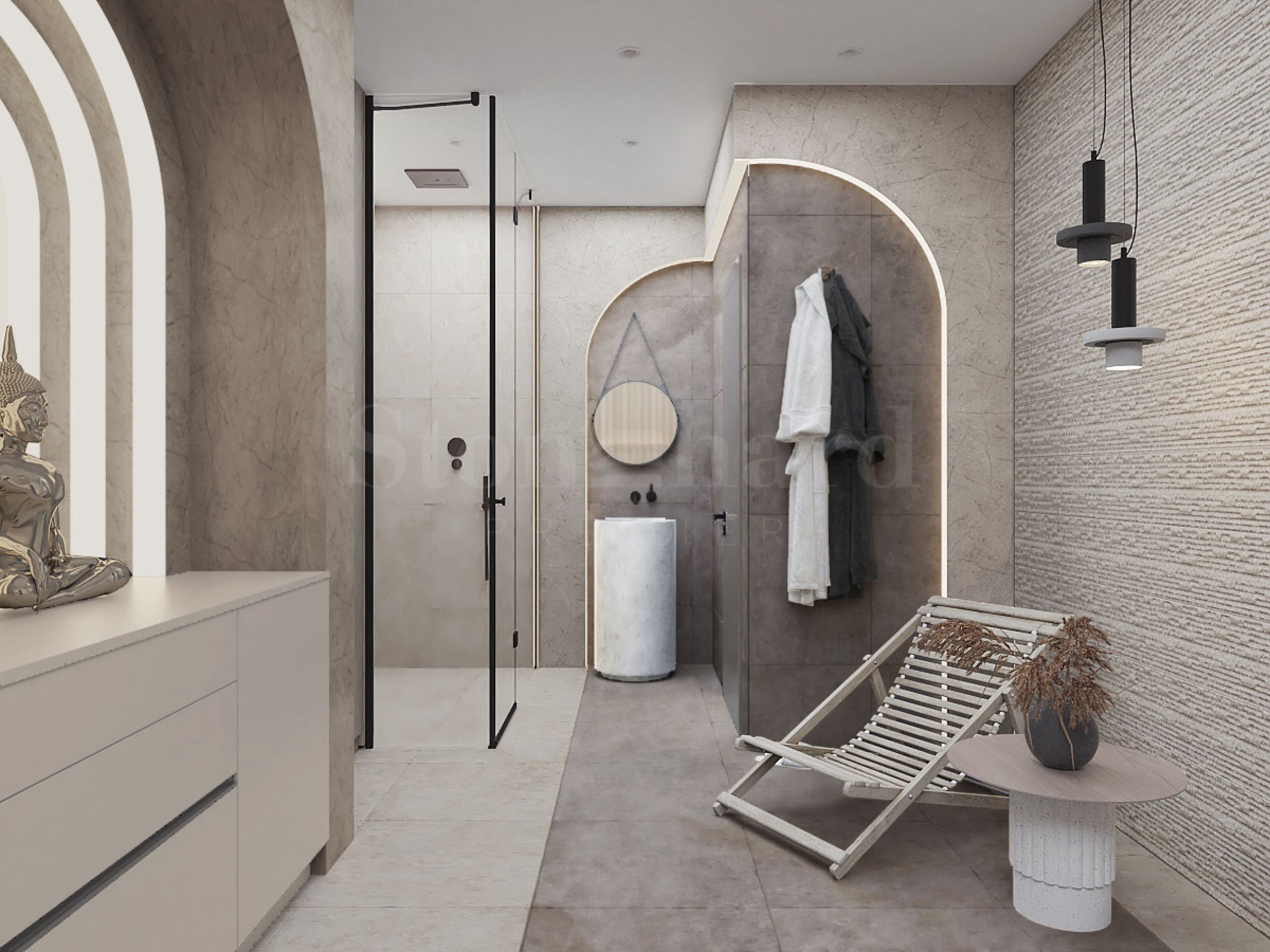 Сутерен: Техническо помещение, санитарен възел и пространство за спалня, фитнес или винарна, според нуждите на собствениците.