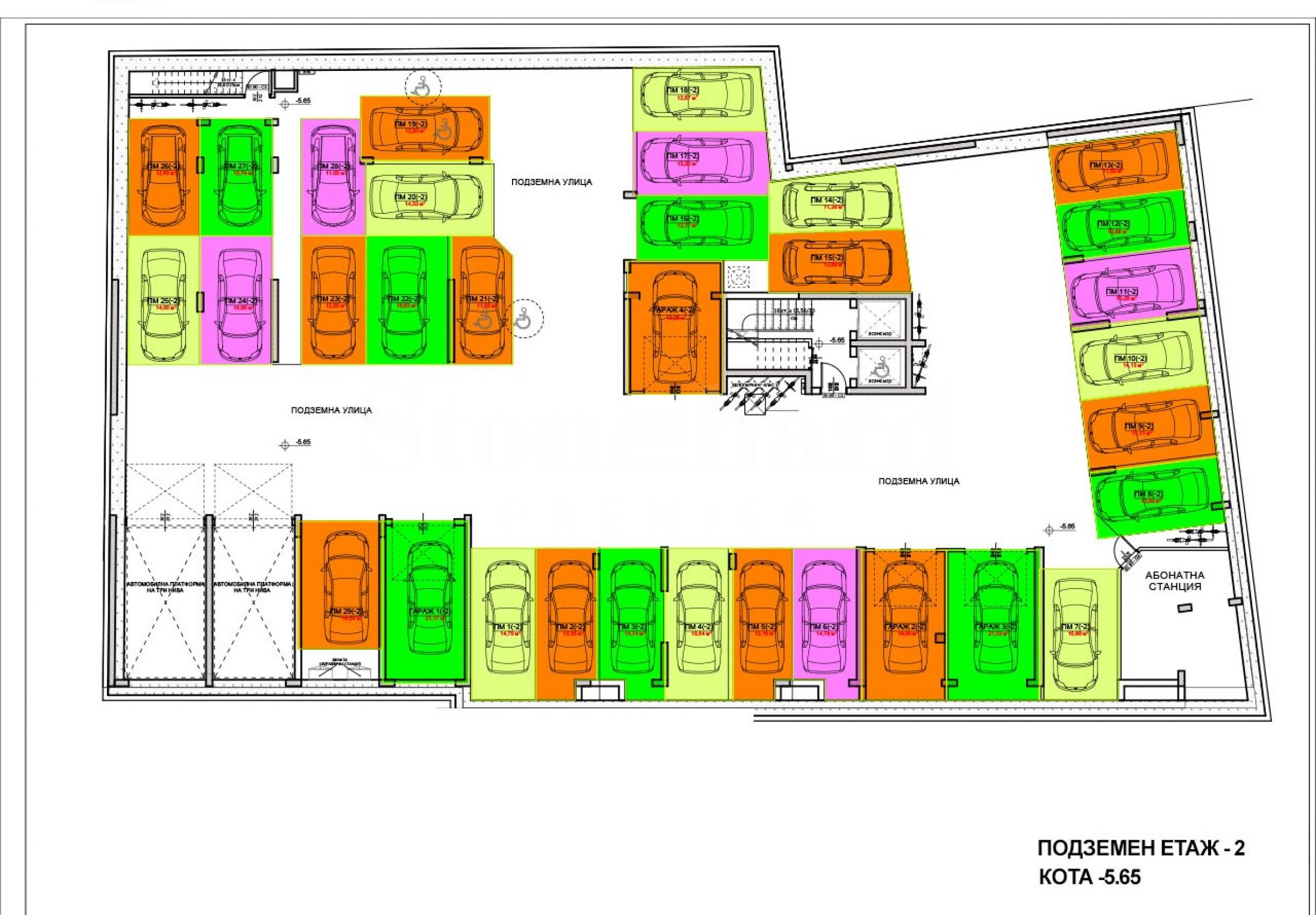 две подземни нива с паркоместа, гаражи и помещение за трафопост;