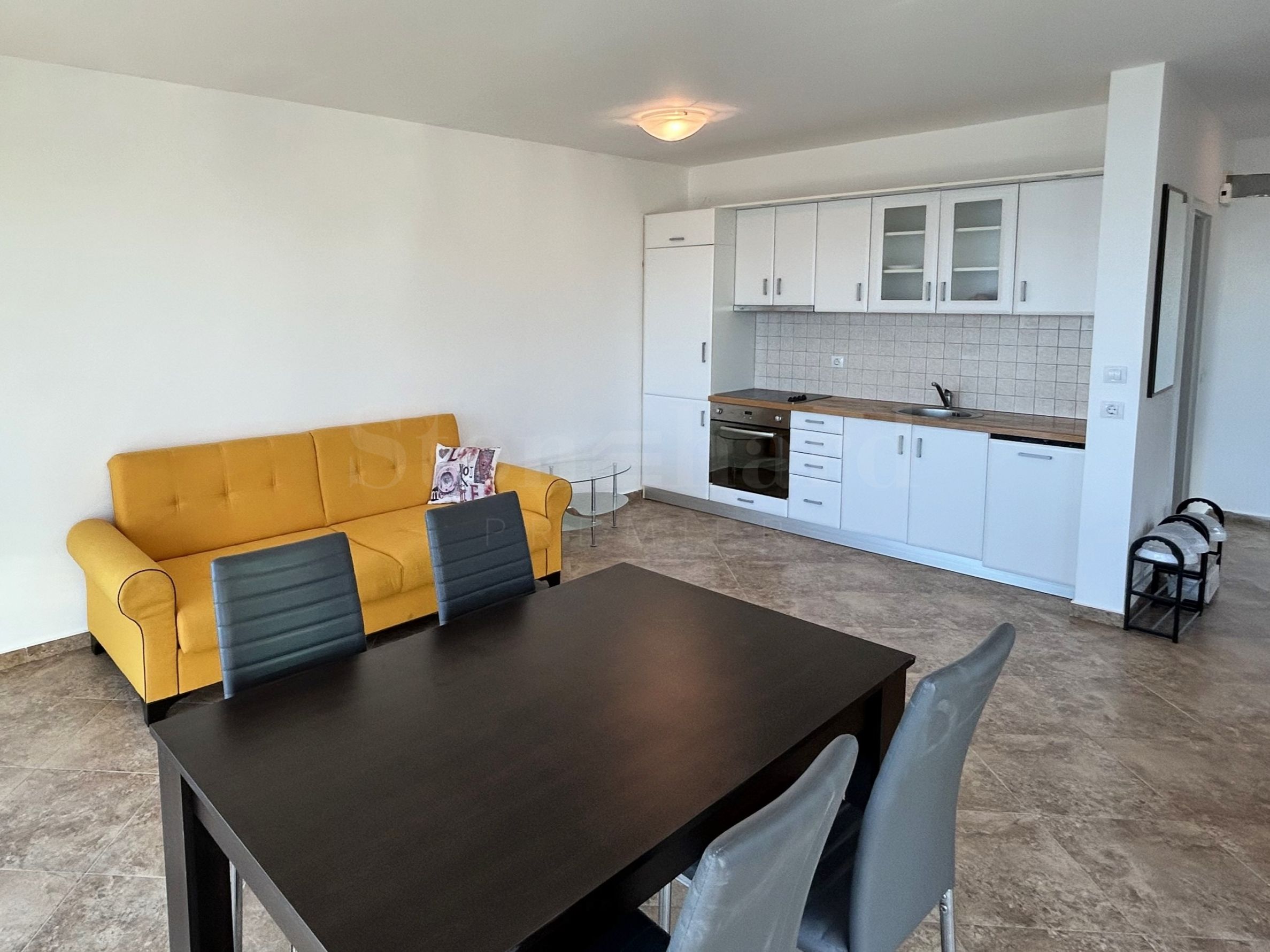 светлата всекидневна е с удобна зона с диван, трапезарен комплект;