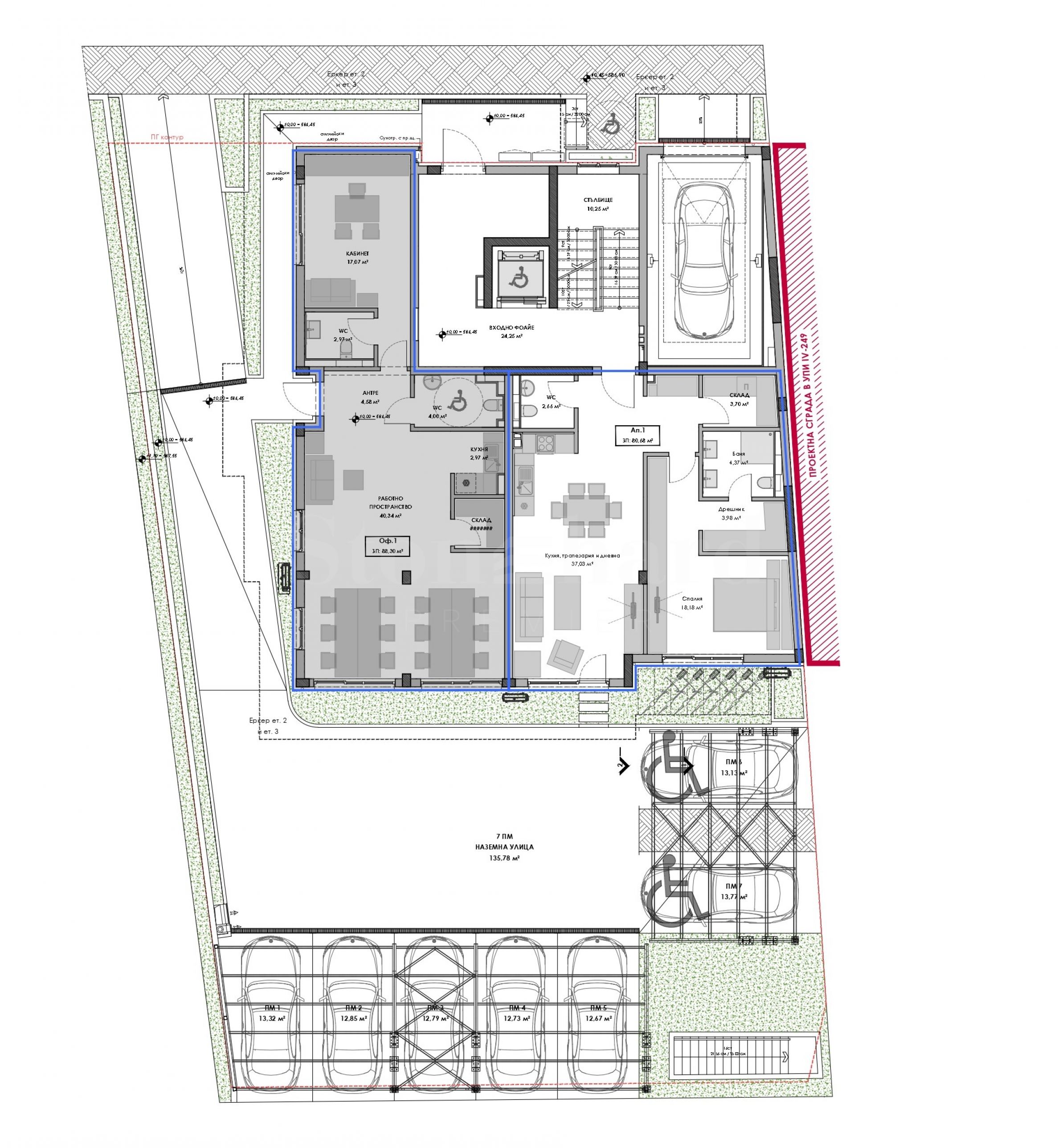 Гаражи: достъп с автоматична врата, асансьор и топла връзка; под - шлайфан бетон. Очакваме Вашето запитване