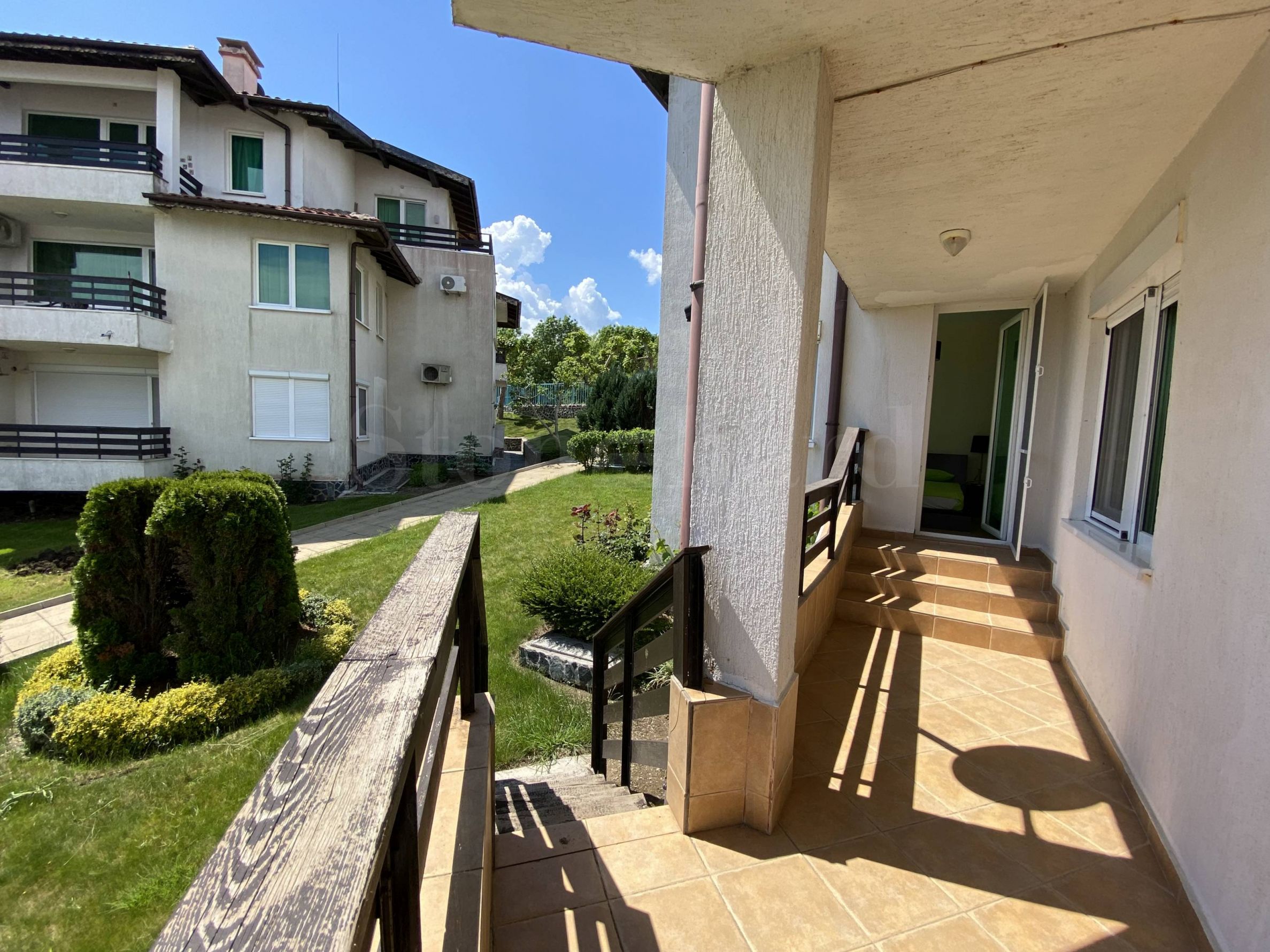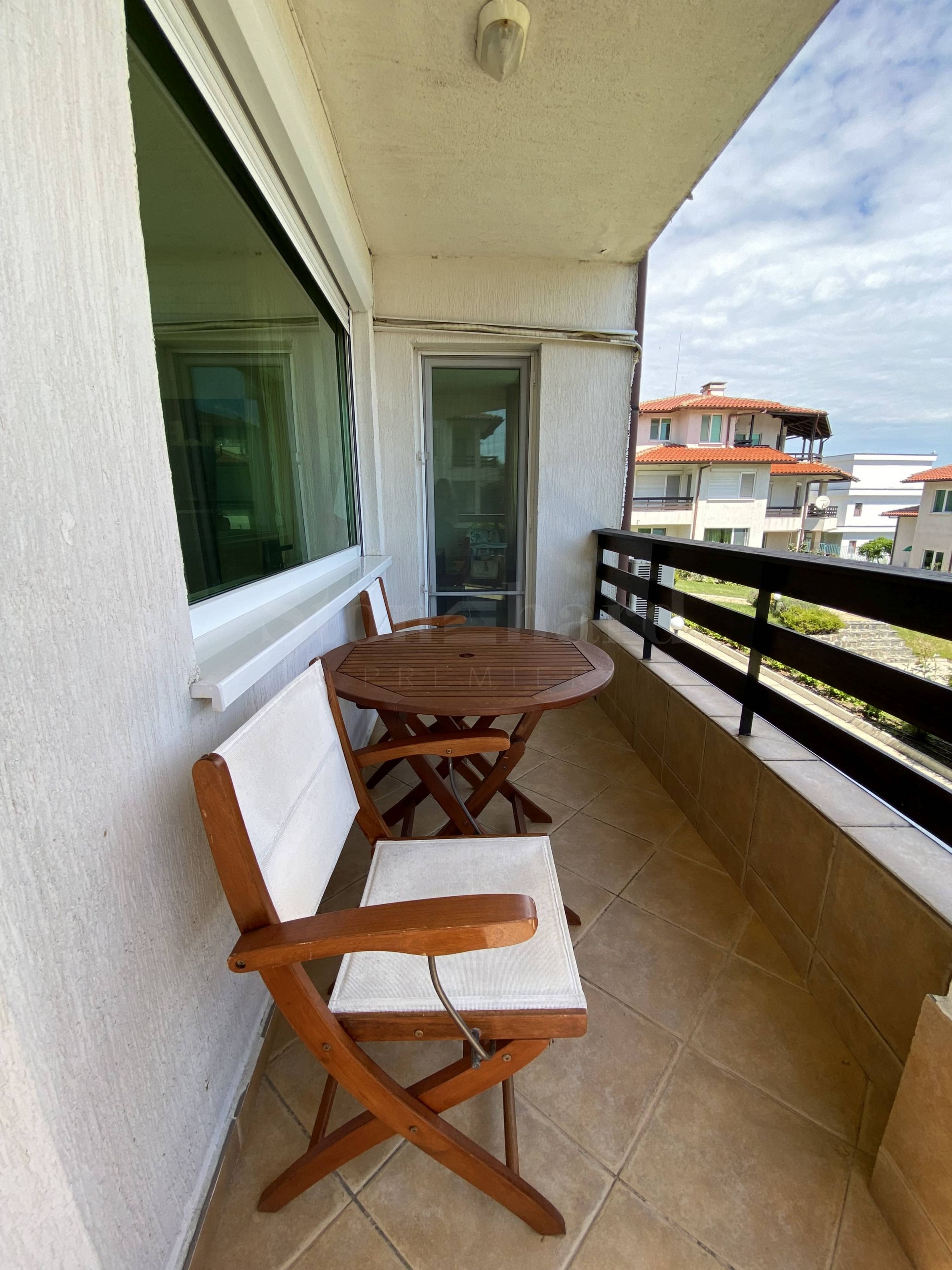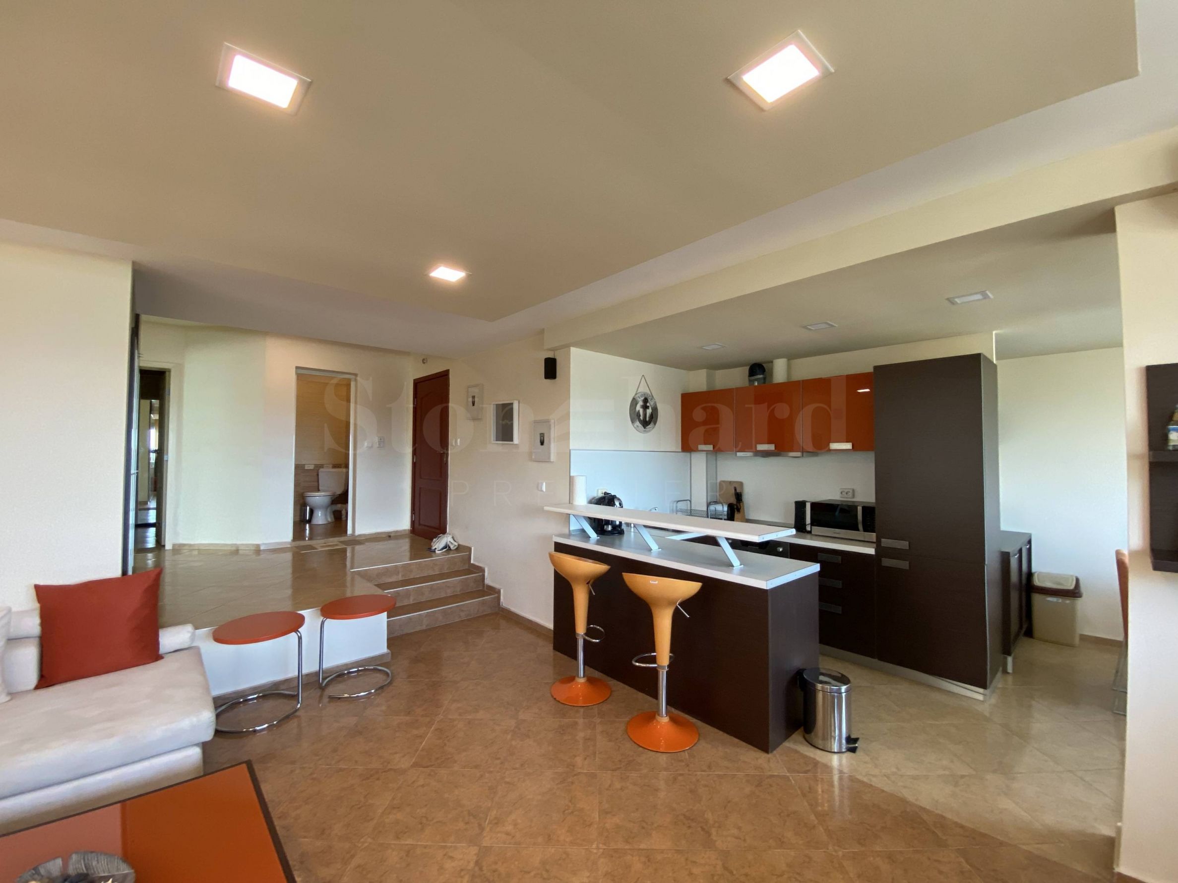 Жилището е елегантно и добре обзаведено, оборудвано с висок клас техника. Има поставени външни ролетни щори. На терасата е монтирана външна стълба водеща към двора и басейна на комплекса. Подходящо е както за лично ползване, сезонно или целогодишно, така и за отдаване под наем.