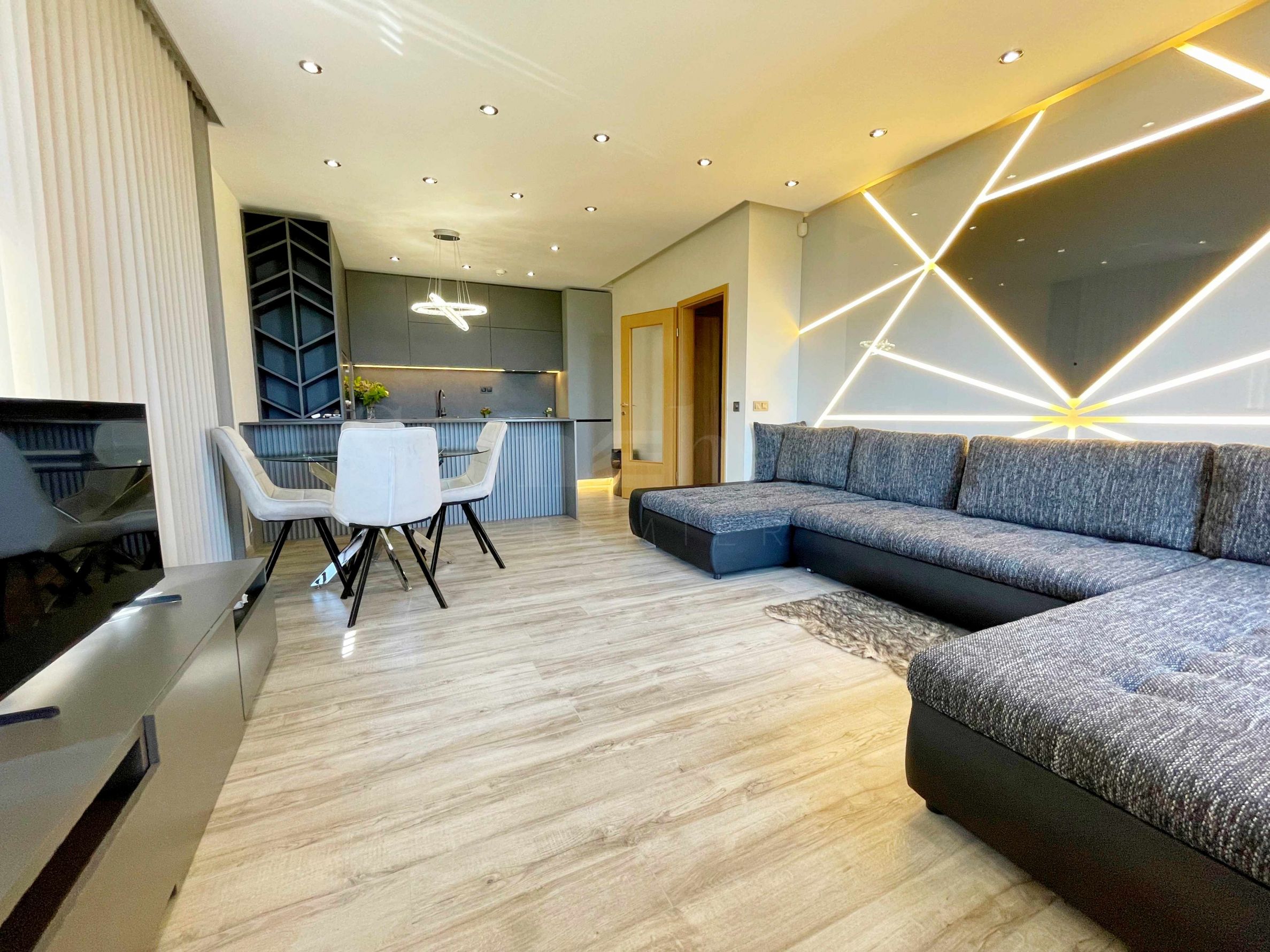 прекрасна тераса с площ от около 35 кв.м, която е ориентирана на юг и с гледка към красива смесена гора.Апартаментът е напълно обзаведен с много вкус като са използвани висококачествени материали, мебели и електроуреди. Кухнята е напълно оборудвана с вградени уреди на елитни марки и разполага с лед подсветка, каквато има и на декоративното пано на стената зад меката мебел. Всички стаи са климатизирани.