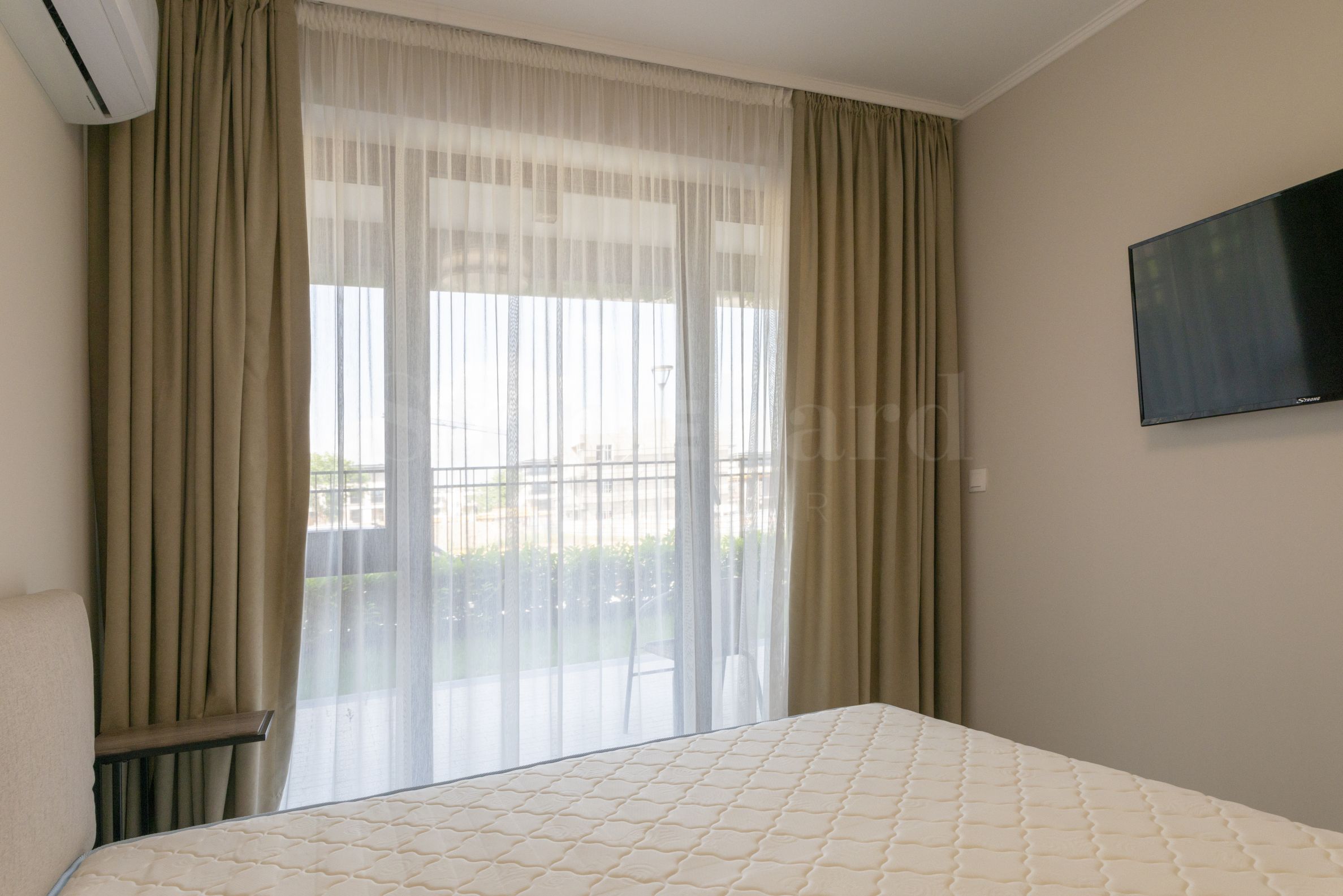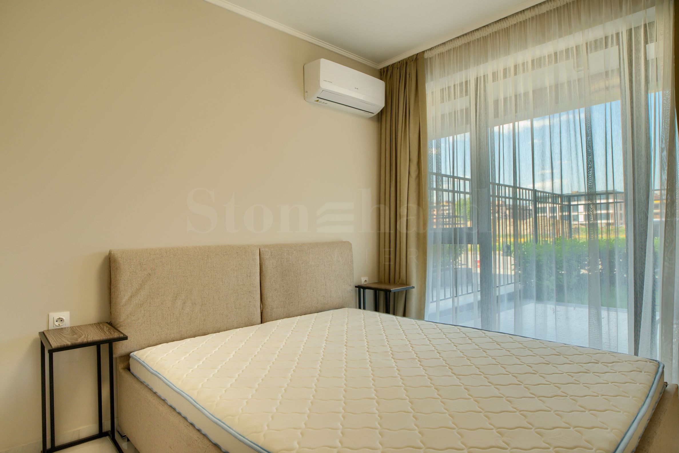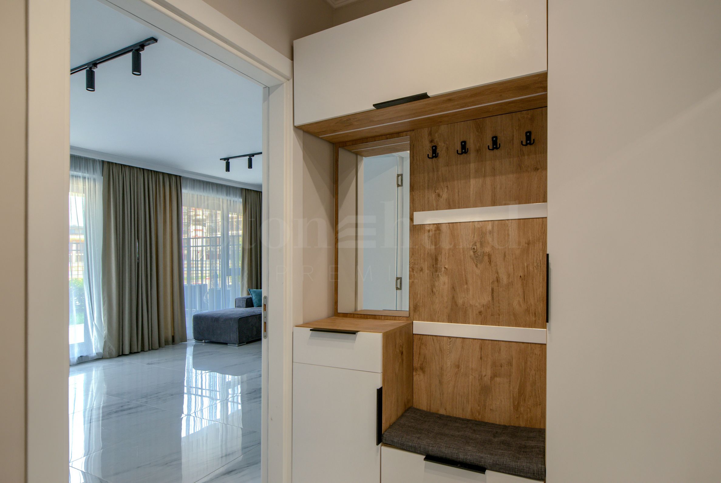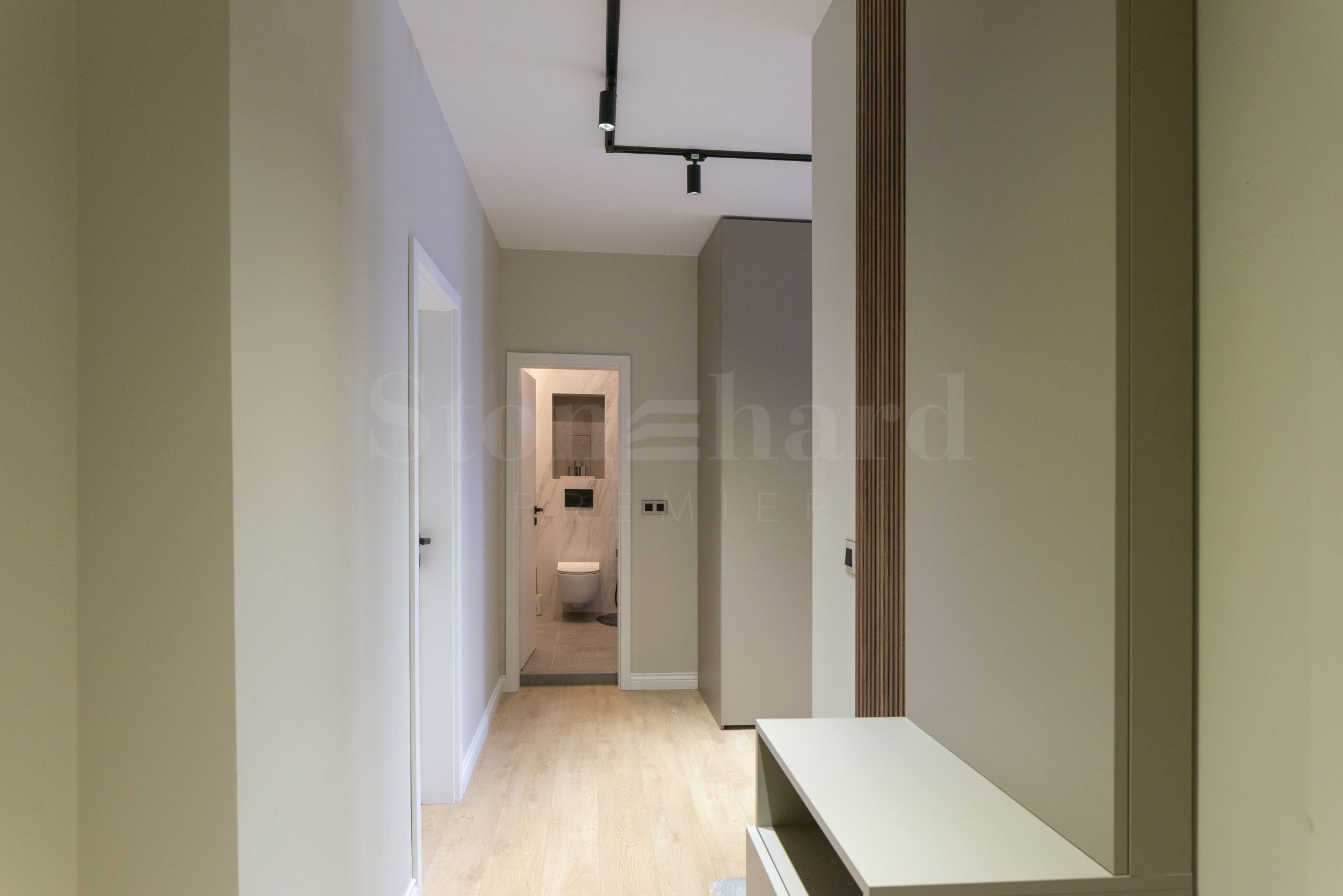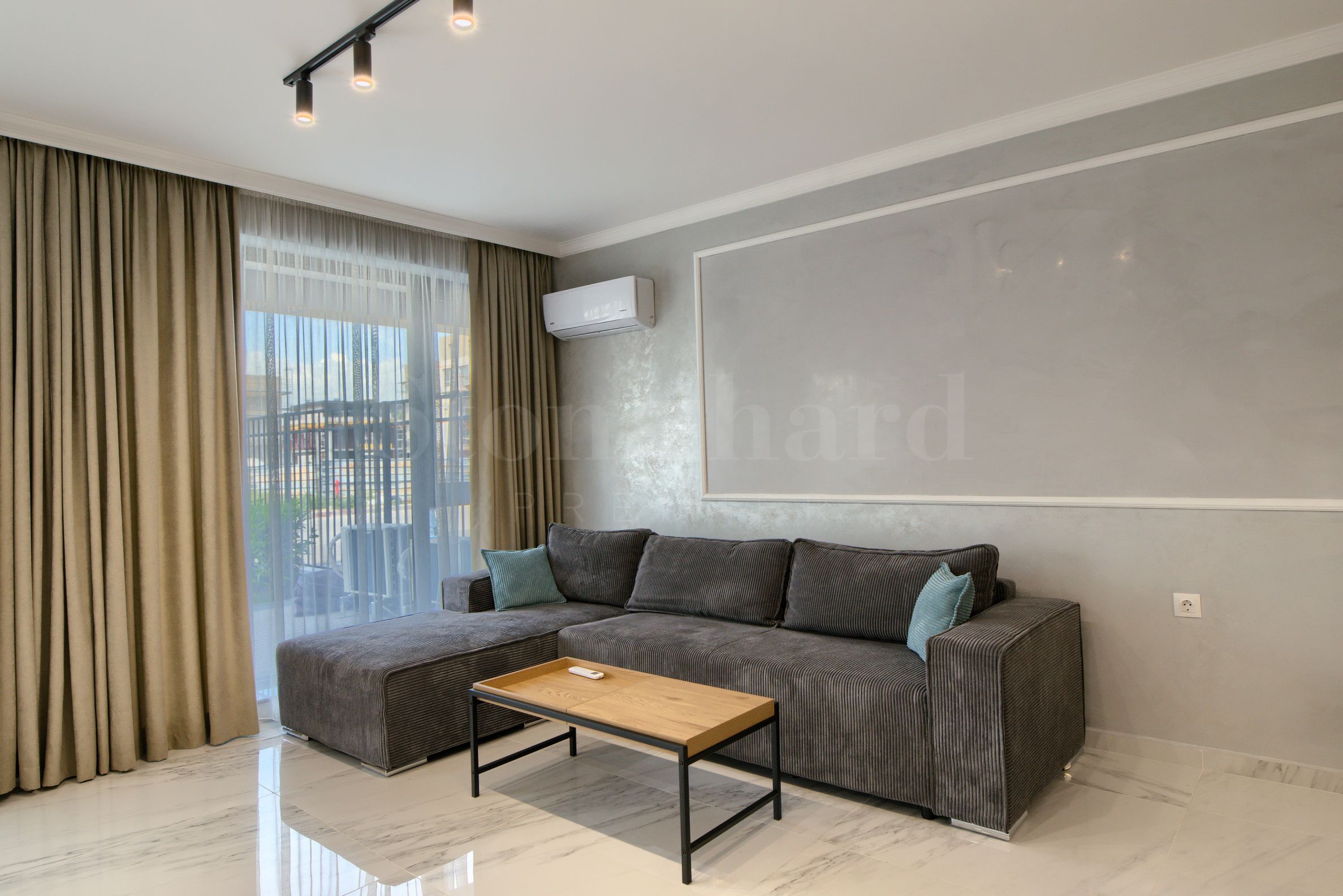 баня с тоалетна.Апартаментът е изключително уютен и елегантен, завършен с внимание към всеки детайл. Интериорът е решен в светли и топли тонове, които придават усещане за простор и хармония във всяко помещение.