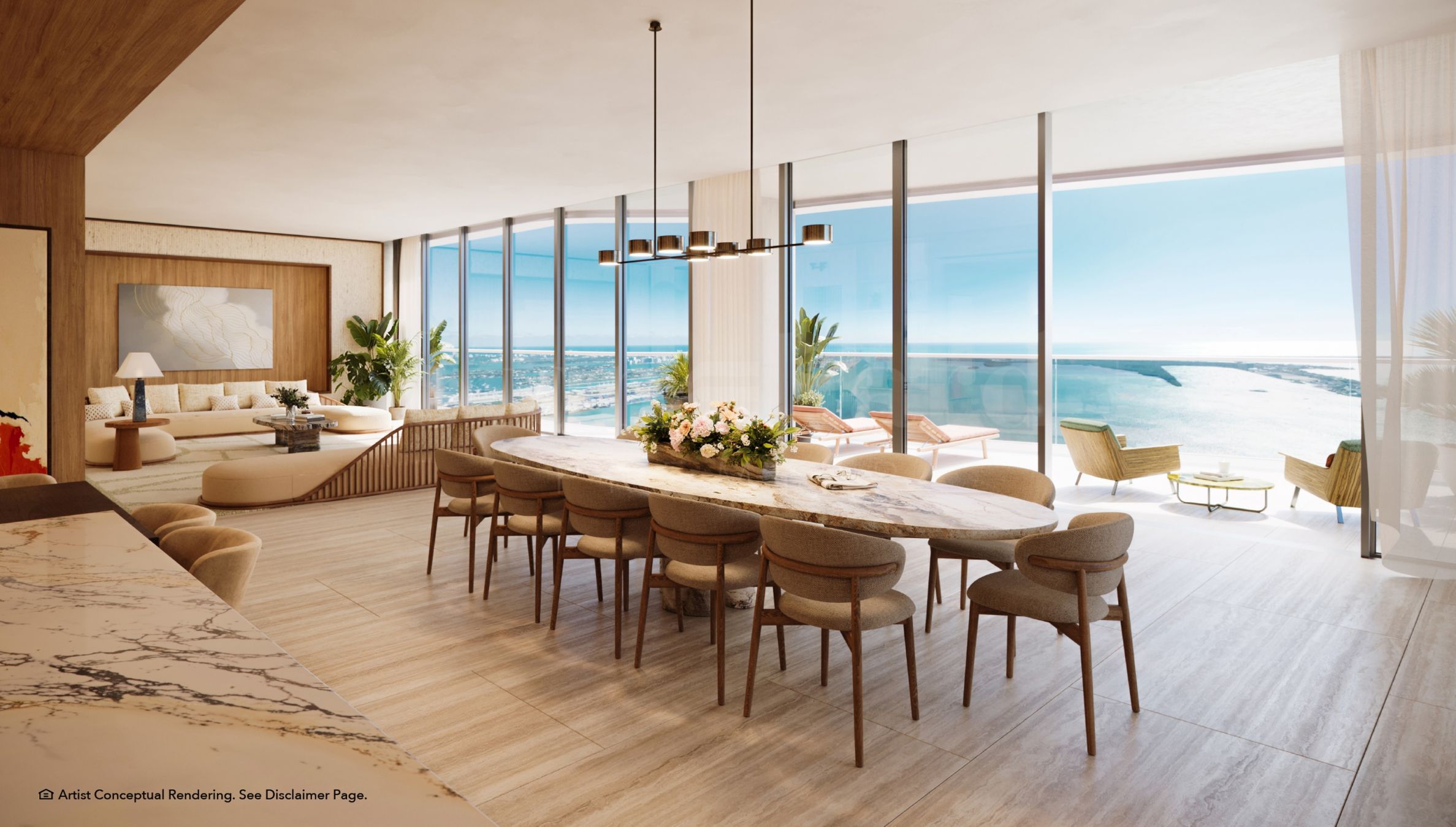 • ъглови резиденции с двойно изложение, частен асансьор и фоайе, три спални със собствени бани и гардеробни, просторна всекидневна с кухня и трапезария, тоалетна за гости, перално помещение, складово помещение, обширна опасваща тераса с вграден външен бар, външна трапезария и зони за отдих;