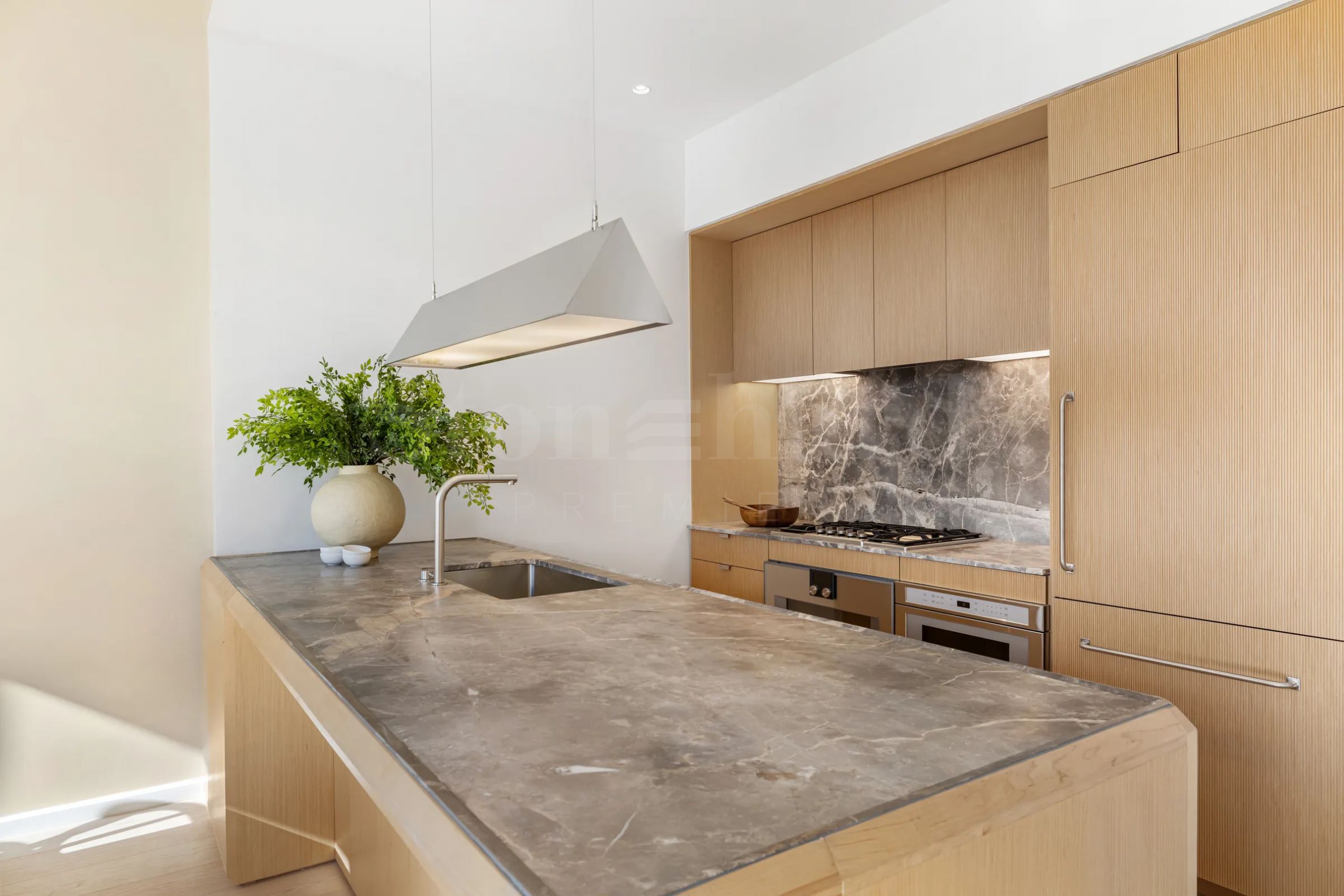 Прецизно проектираната кухня, създадена от Workstead, разполага с полуостров с плот и гръб от естествен камък Fior di Bosco, шкафове и дървени елементи от клен с изразена текстура, съчетани с никелови дръжки и електроуреди от най-висок клас на Gaggenau. Просторното отворено помещение за дневна и трапезария е изпълнено със светлина благодарение на големите прозорци с южно изложение.