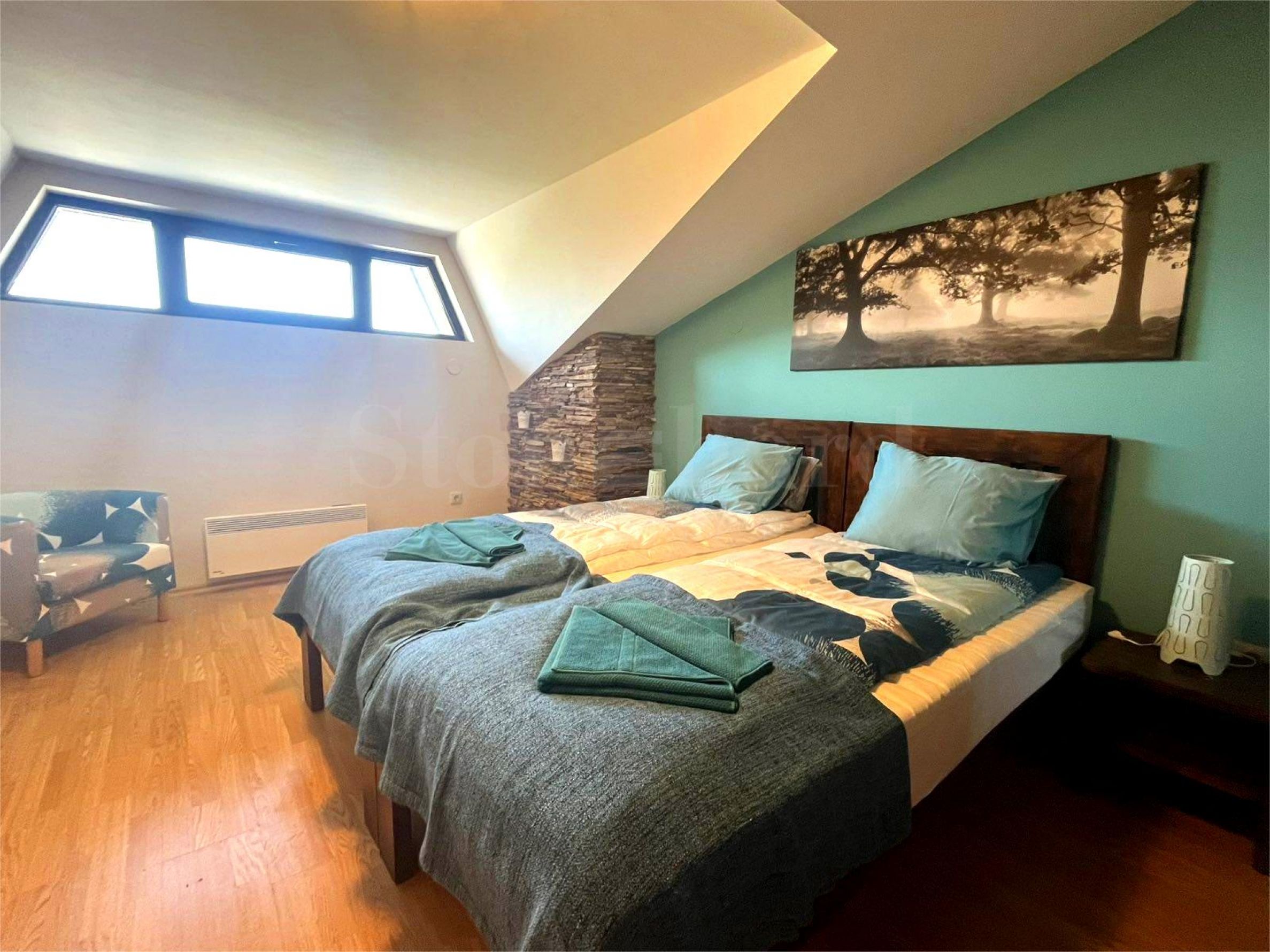 Жилището се намира в поддържан комплекс и впечатлява със своите висококачествени довършителни работи, сред които се откроява естественият камък, използван като декоративен елемент по стените.