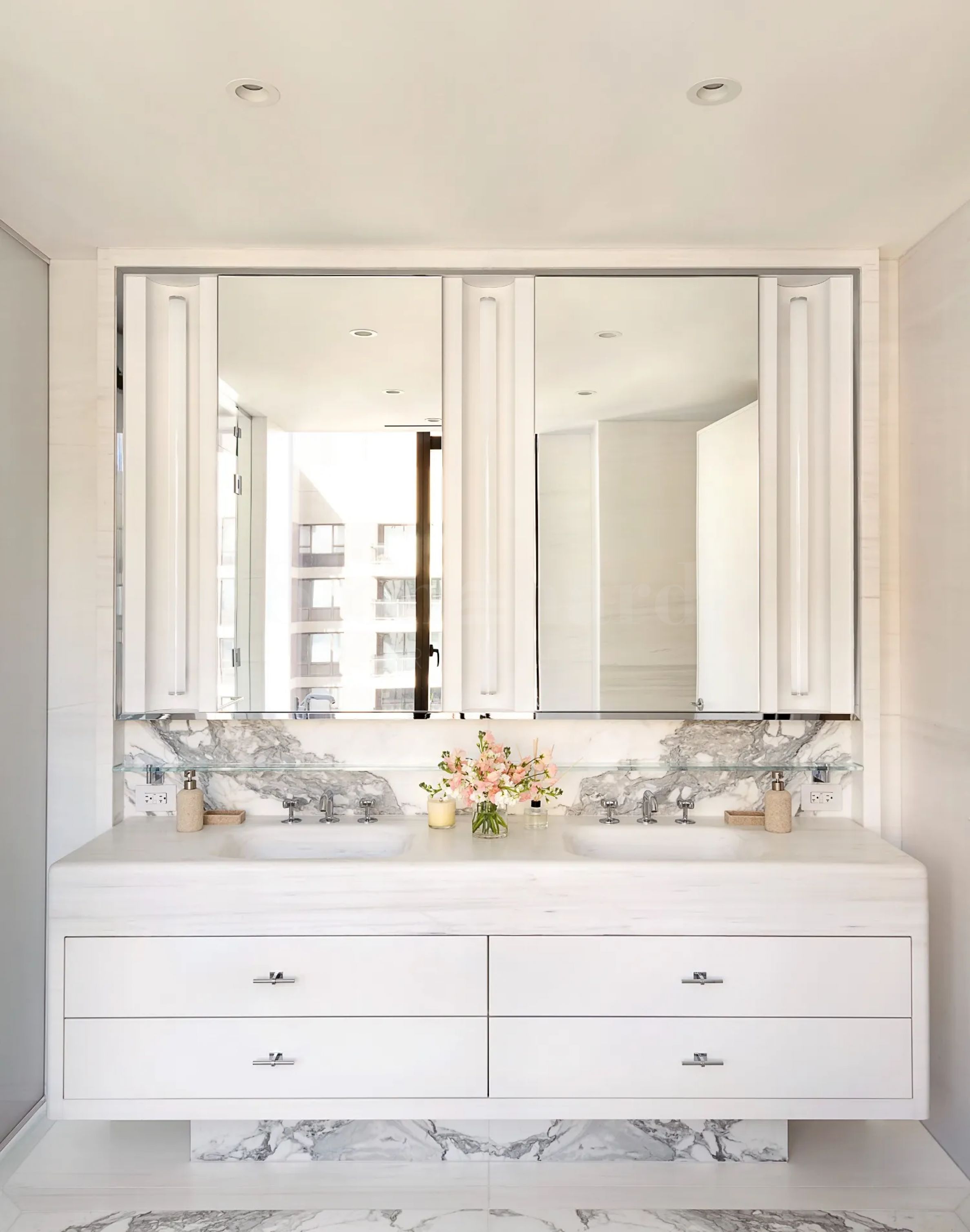 Баните са изцяло облицовани с фино подбран мрамор Bianco Dolomiti, с артистични акценти от Calacatta Gold, подредени в огледален стил. Всяка мивка е изваяна от монолитен блок мрамор – скулптурен акцент и доказателство за безкомпромисен лукс.