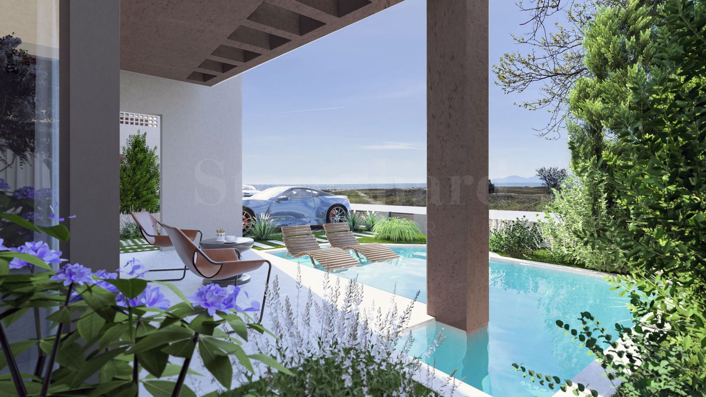 В строителството на сградите е заложено на внимателно подбрани, висококачествени материали, както и на характерни за модерното строителство големи прозорци и остъклени тераси. В дворното пространство има специални каменни детайли и щателно озеленяване, създаващи атмосфера, идеална за релаксация. Голям външен басейн за общо ползване пък гарантира прохлада и приятни мигове с близки и приятели около него. Около басейна ще откриете зони за релакс, както и детска площадка, където най-малките обитатели могат да се забавляват, докато Вие релаксирате. Не на последно място, дворът на сградите разполага с паркоместа за всеки от апартаментите, което се явява голямо предимство за курортното селце.
