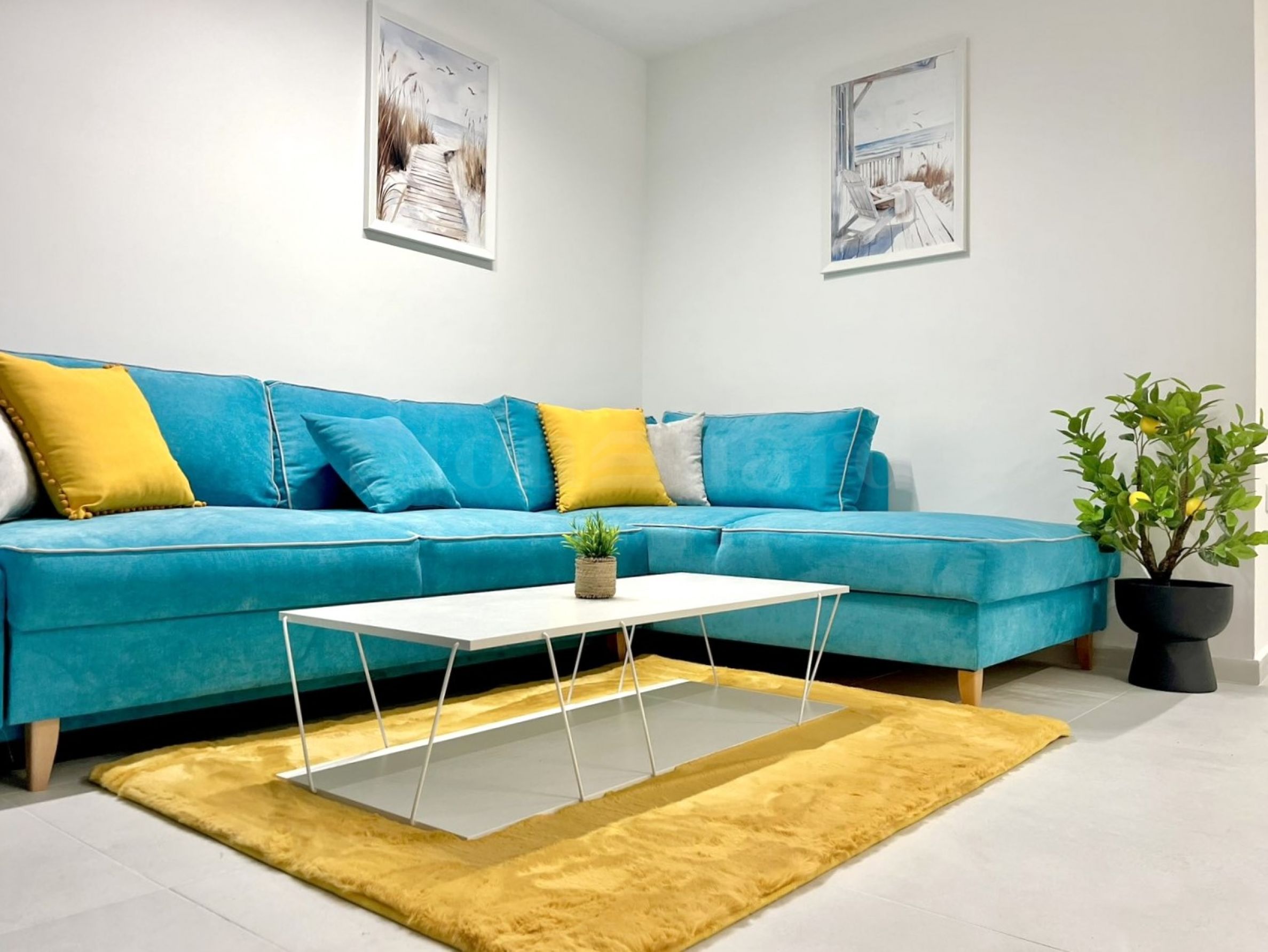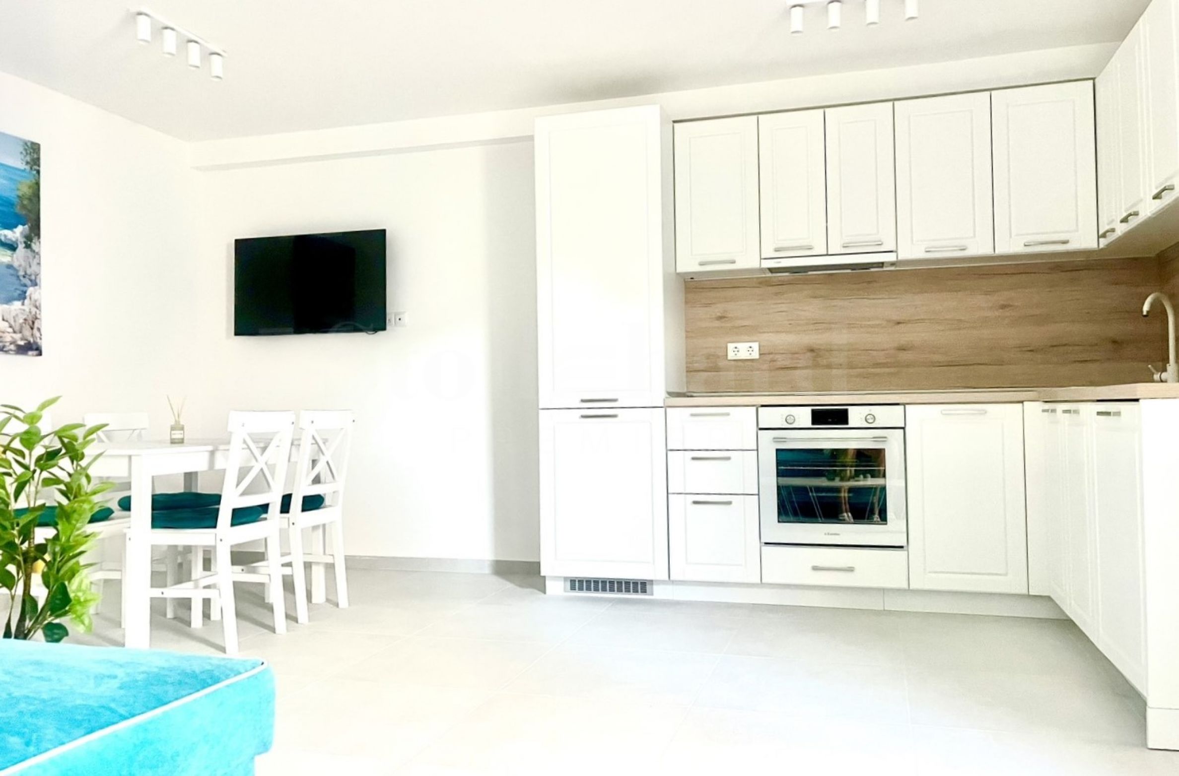 Апартаментът се намира на 1-ви етаж с обща площ 60 кв.м и следното разпределение: всекидневна с кухня, спалня, баня с тоалет и веранда. Жилището е напълно обзаведено и оборудвано с нови мебели и техника, готово е за нанасяне.