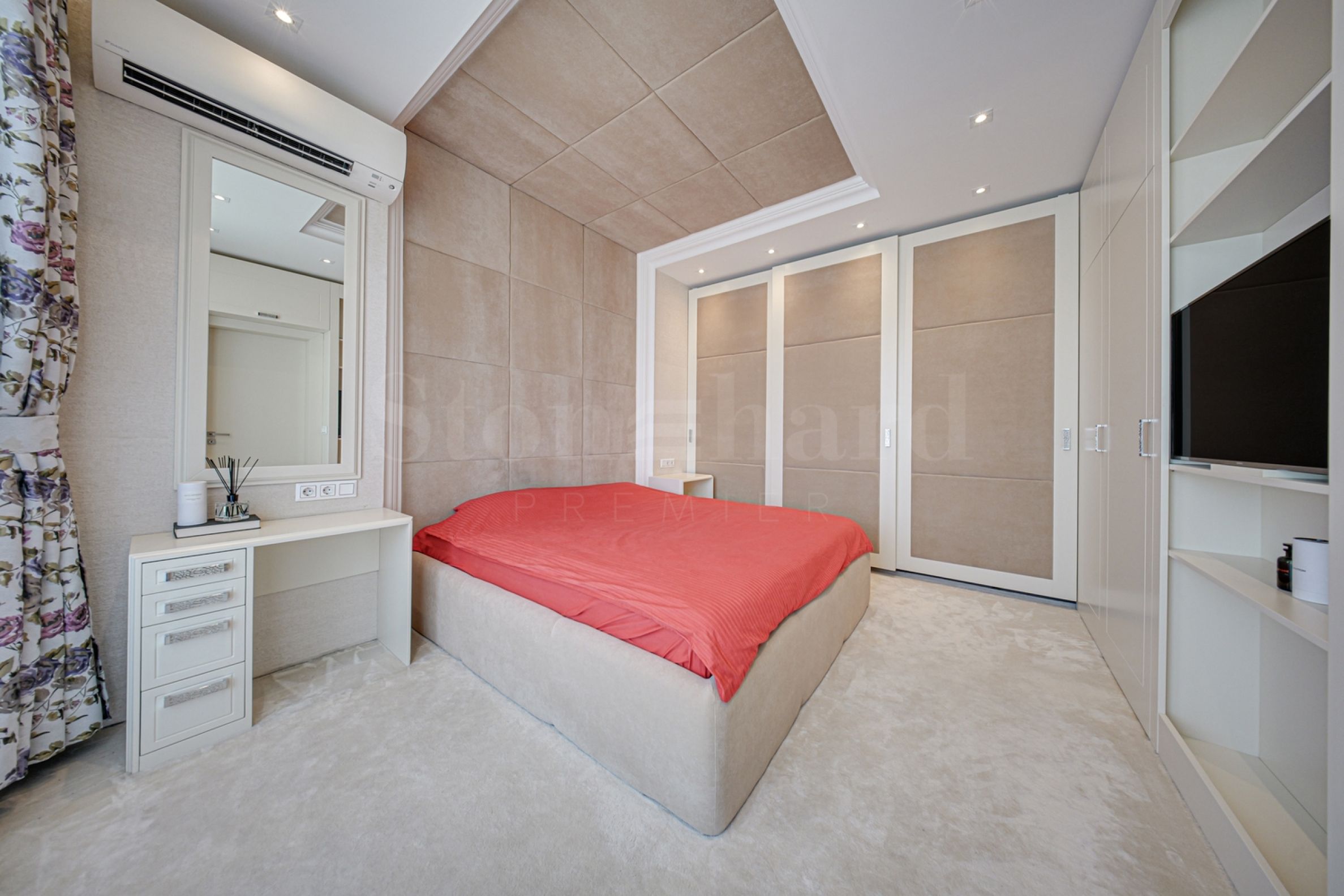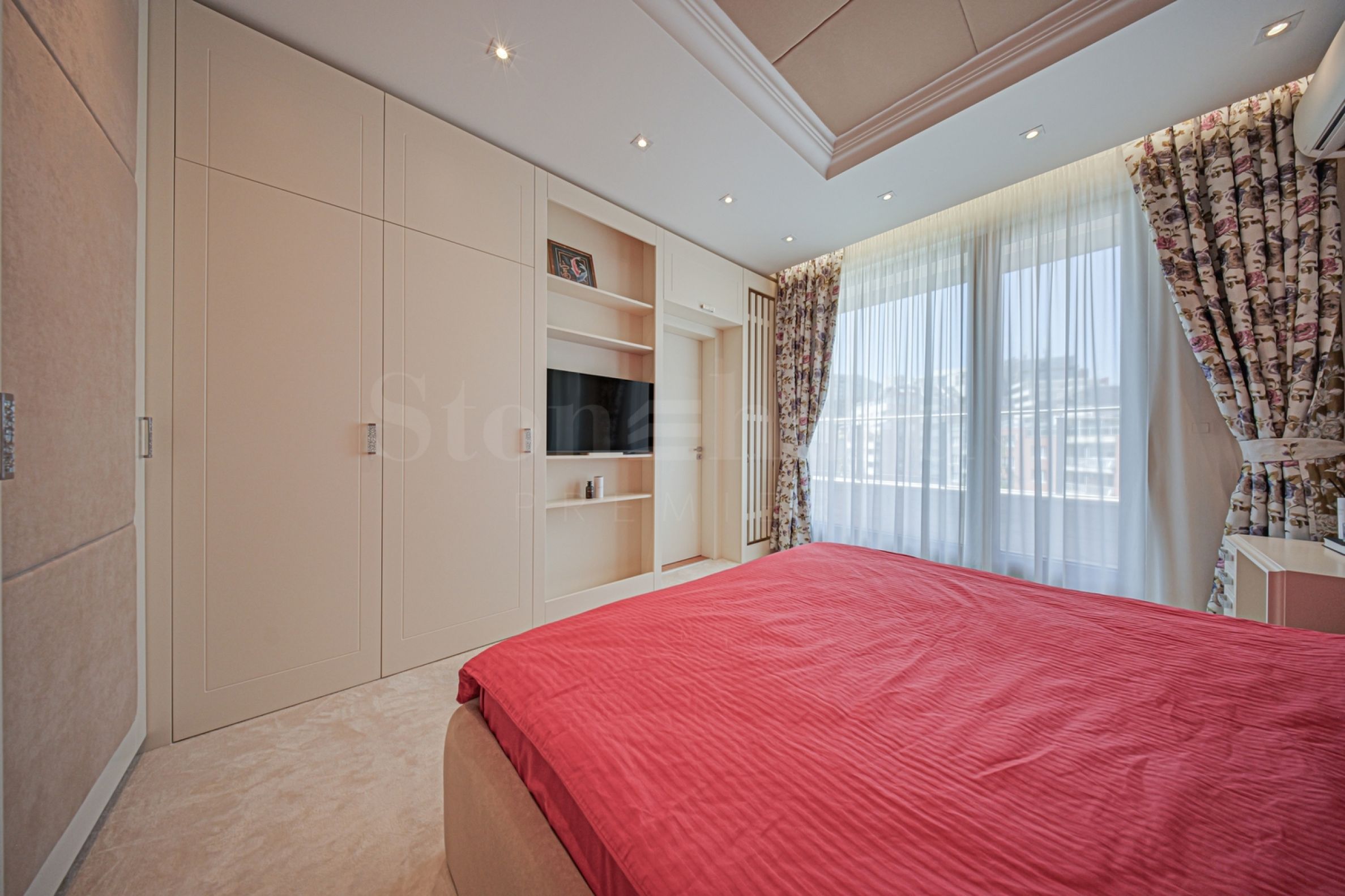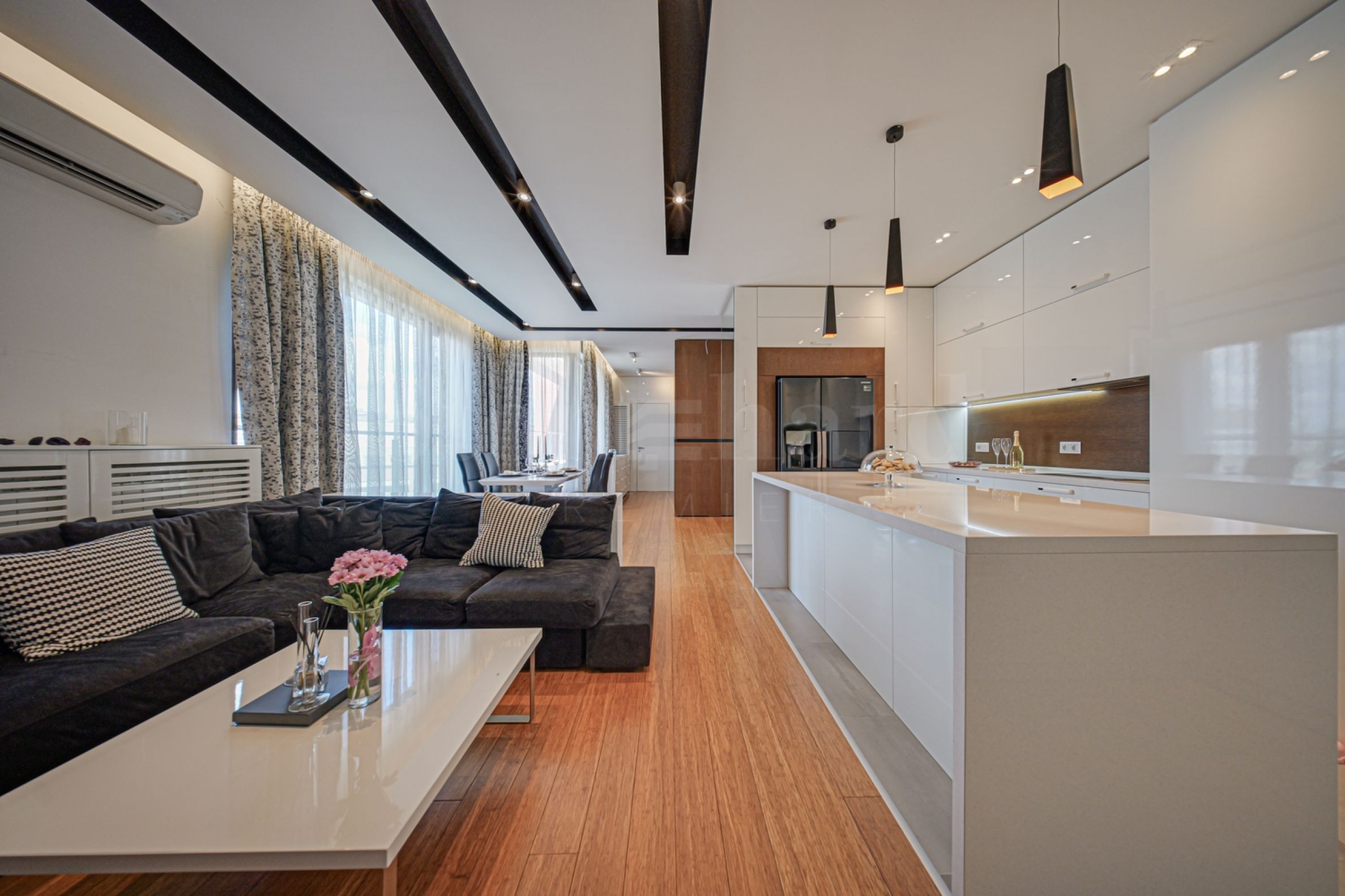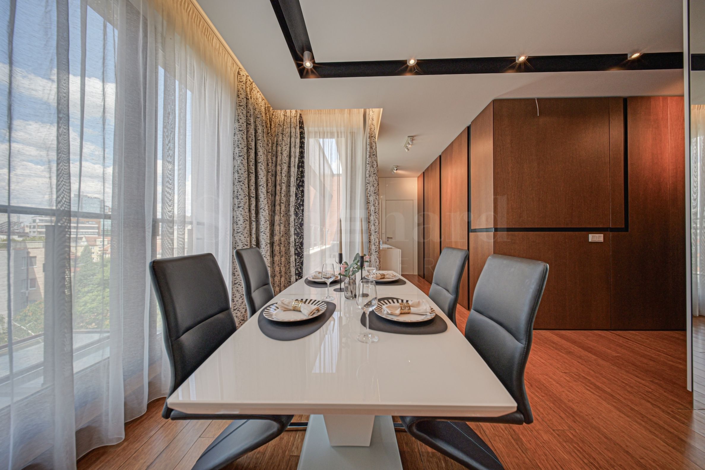 Жилището е с площ 176,36 кв.м и се намира на шести етаж, с панорамни прозорци и прекрасни гледки както към Витоша, така и към парковата среда на комплекса. Имотът е светъл, предлага модерна визия и интериор с изчистени линии. Големите прозорци допринасят за изобилие на простор и светлина, а качествените материали и изискани мебели допринасят за уют и елегантност.