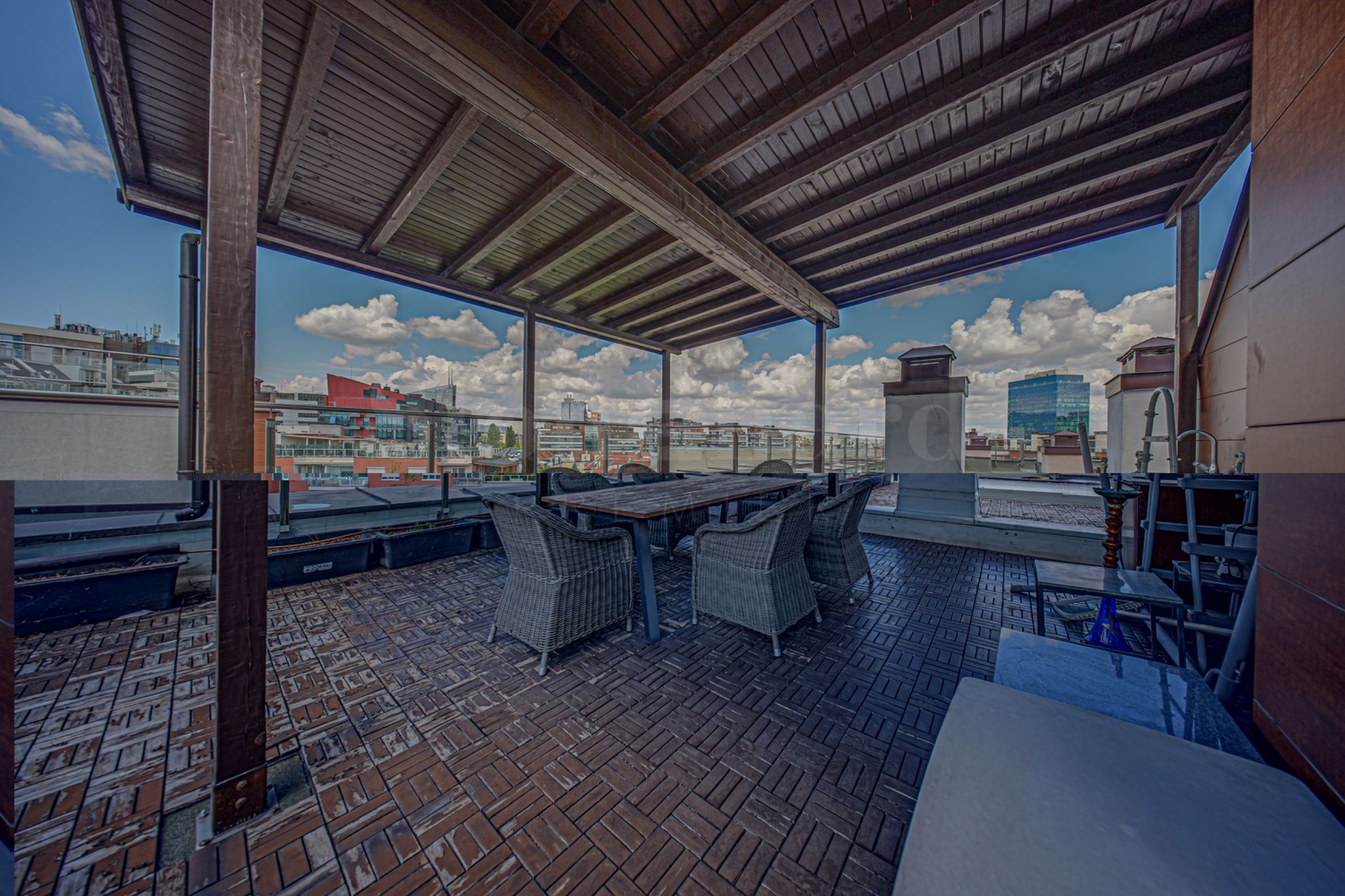 Aпартаментът разполага с покривна тераса с барбекю, около 110 кв.м, представляваща 33.9% от идеалните части от покривна тераса с площ 306.30 кв.м. На една от терасите разполага със сауна с инфраред, джакузи и тоалетна с душ, и е с площ от 27,68 кв.м.