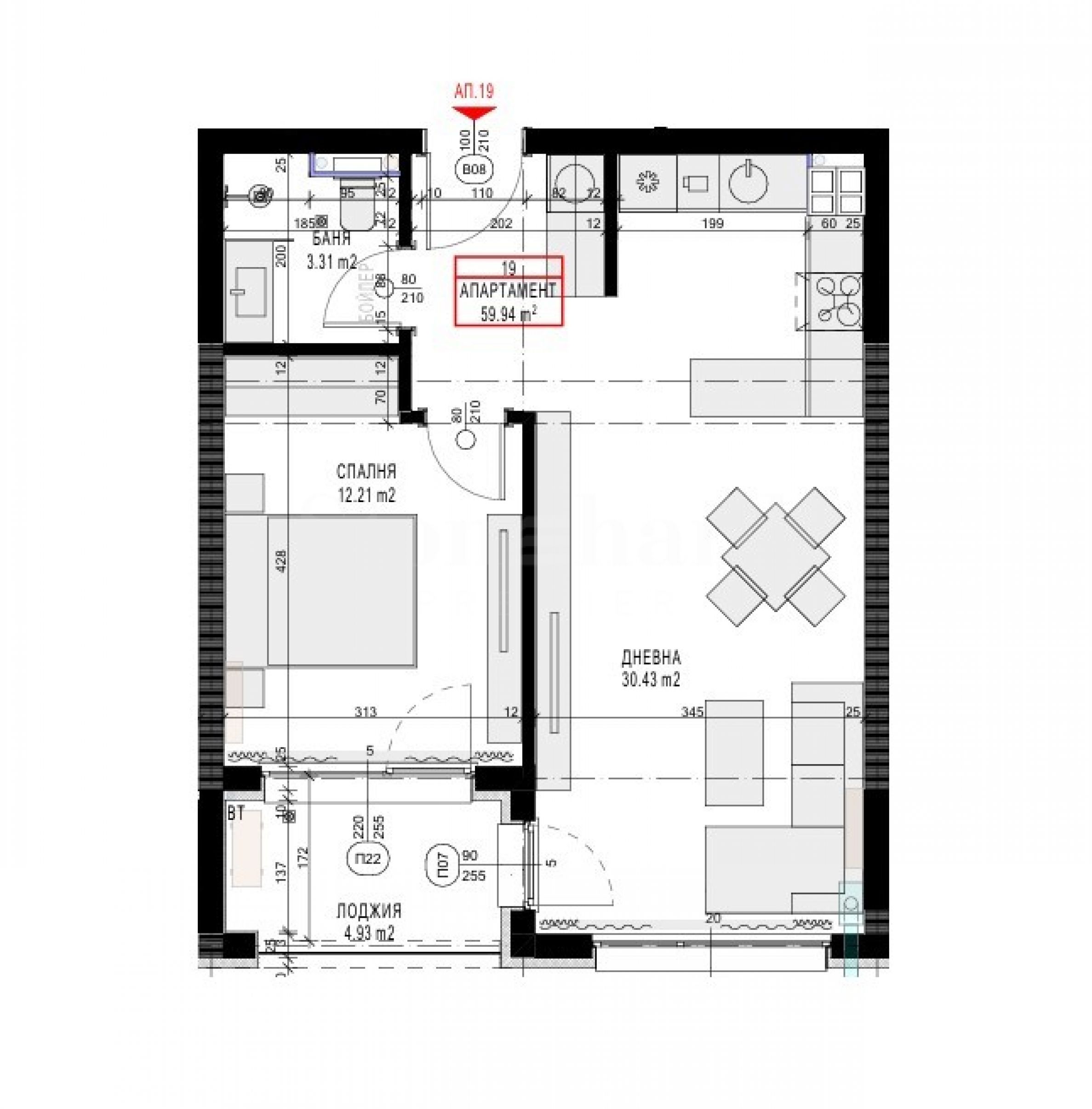 Апартамент №19 е разположен на 2-ри етаж в сградата и има застроена площ от 59.94 кв.м, с разпределение: антре, баня/тоалетна, дневна с кухня и трапезария, спалня, тераса тип лоджия. Жилището е с включен в цената склад - 3.38 кв.м.
