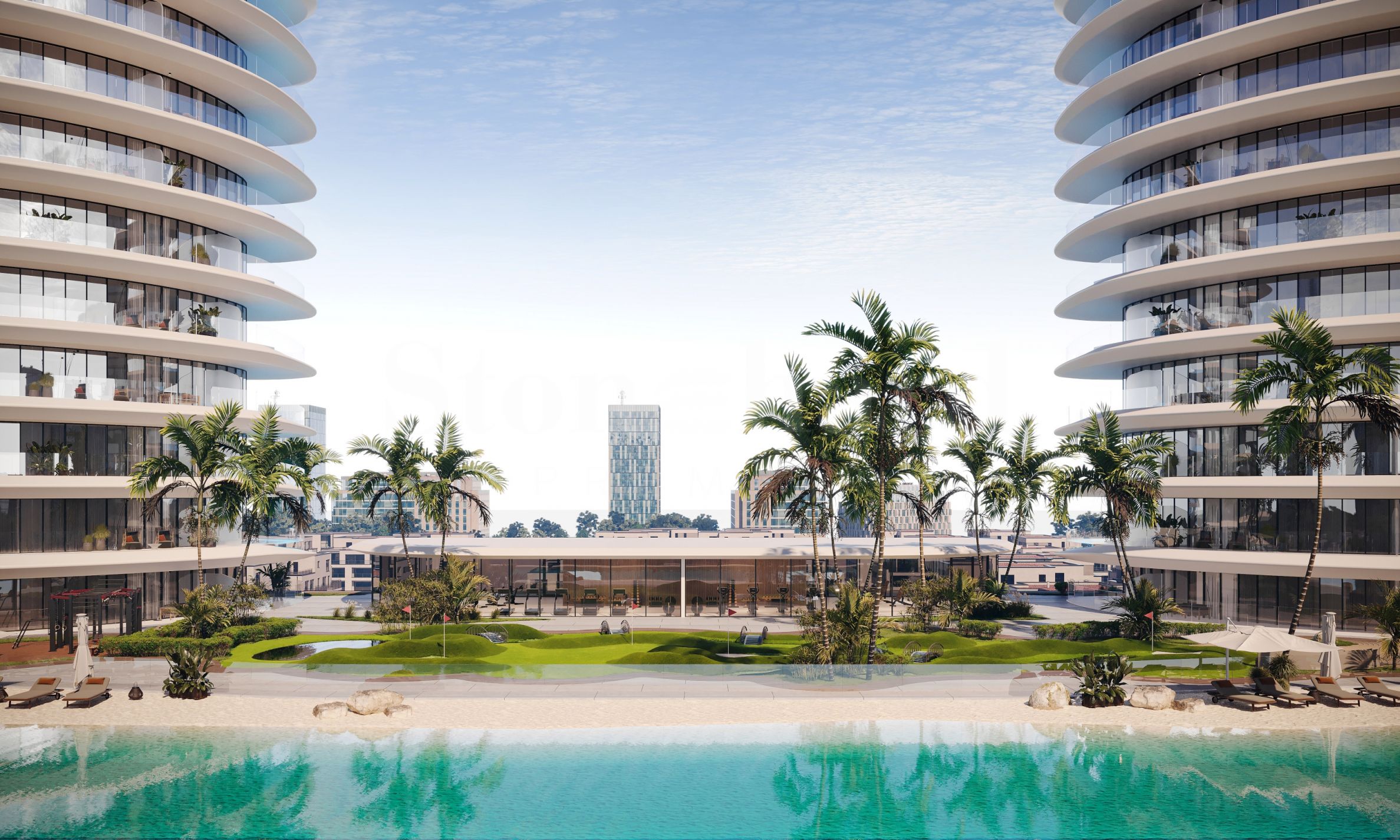 Покривът на подиумните етажи е превърнат в прекрасна градина на открито – с басейн с дължина 100 метра, кътове за релакс, барбекю зони и изискани пространства за хранене. Тук ще откриете и пътека за бягане и джогинг с дължина 350 метра, която създава възможност за активен начин на живот в сърцето на комплекса.