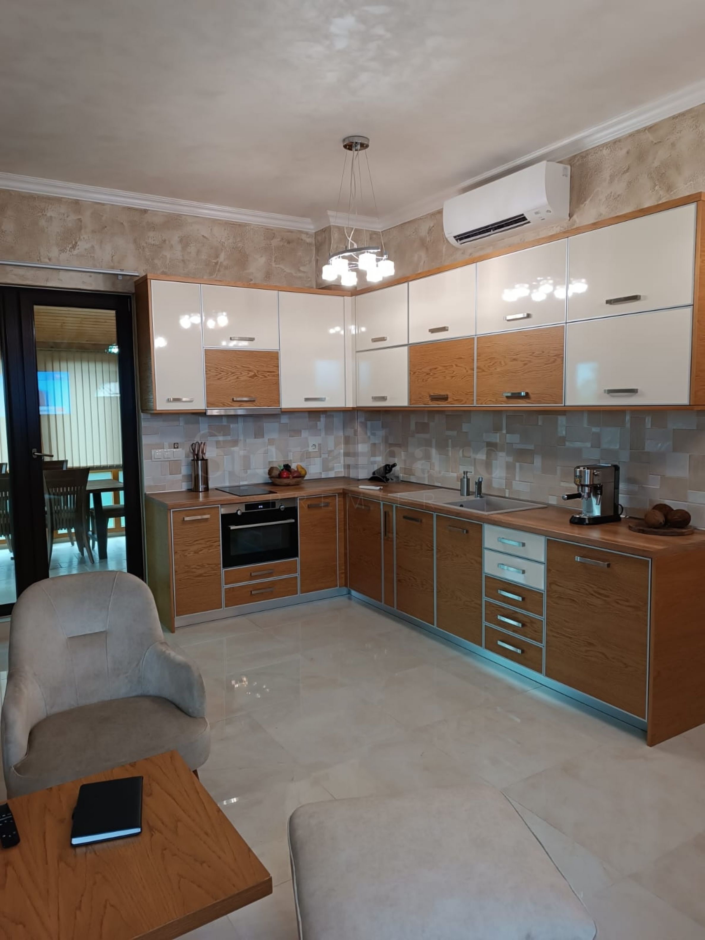 • Етаж 1: закрито остъклено антре, просторна всекидневна с кухня и трапезария с висок клас поръчково обзавеждане, мокро помещение, баня с тоалетна, закрита веранда тип зимна градина, склад/килер и закрито паркомясто.