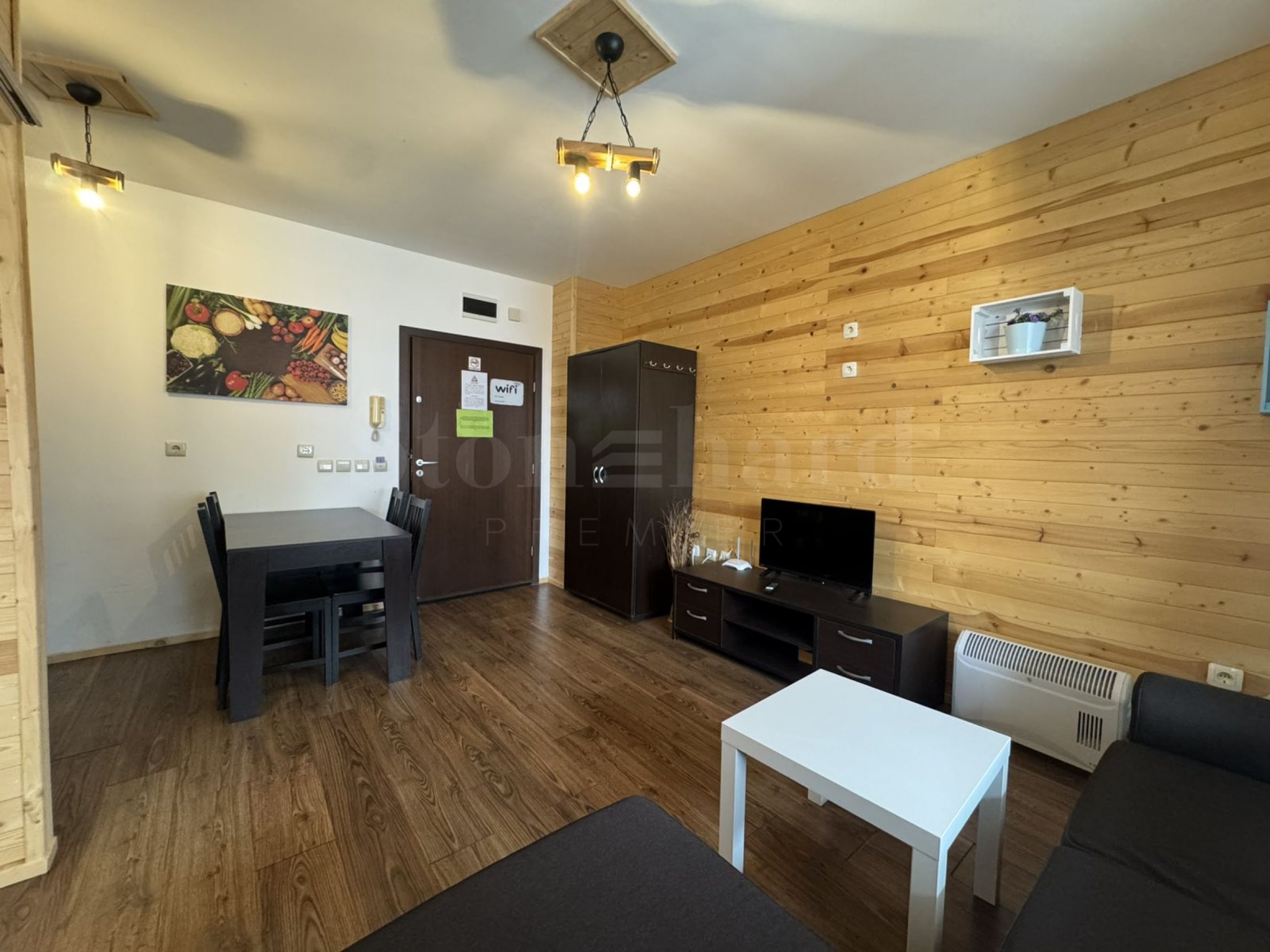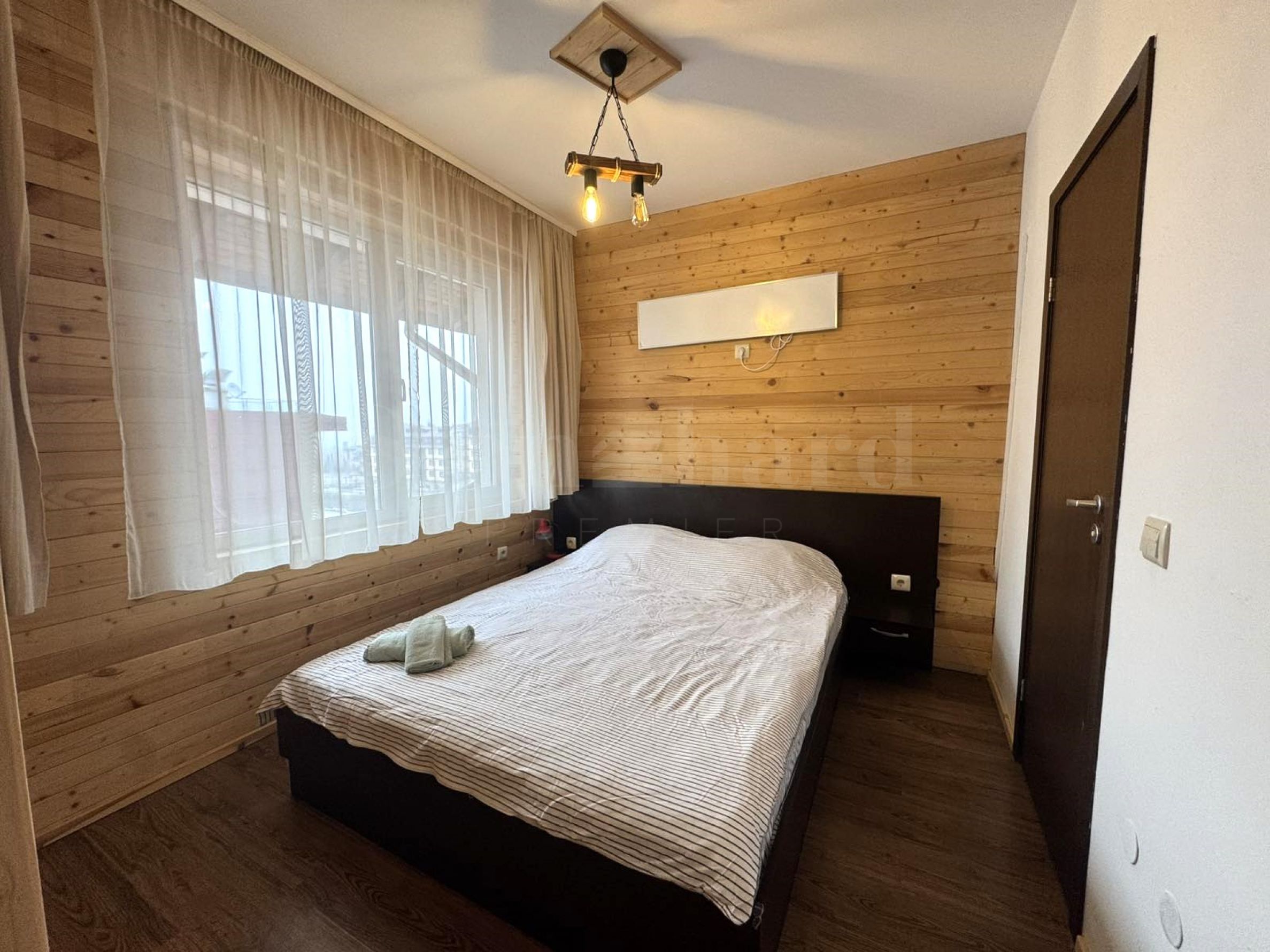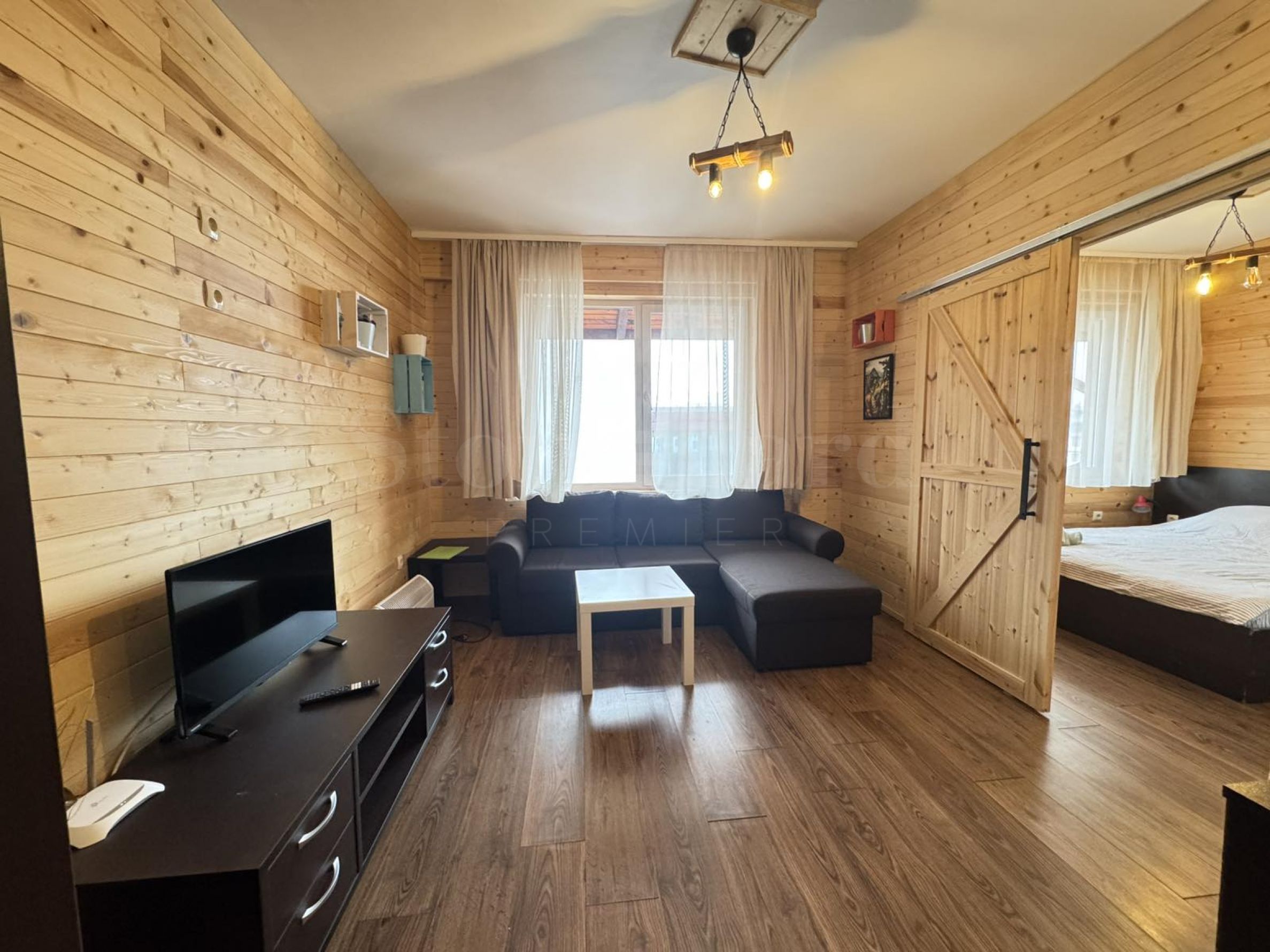 Помещението е оформено с естествена дървена ламперия – типичен елемент за планинския стил в Банско, който носи топлина, комфорт и усещане за традиция.
