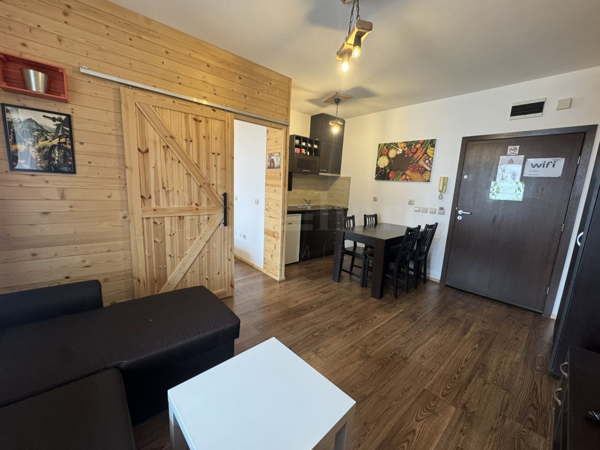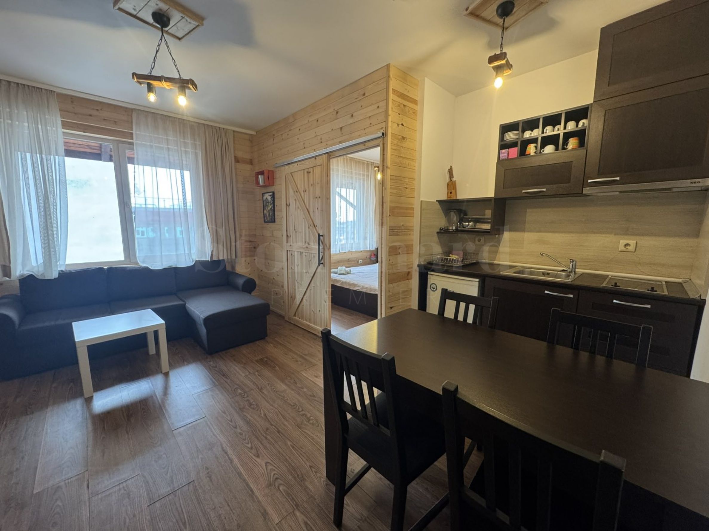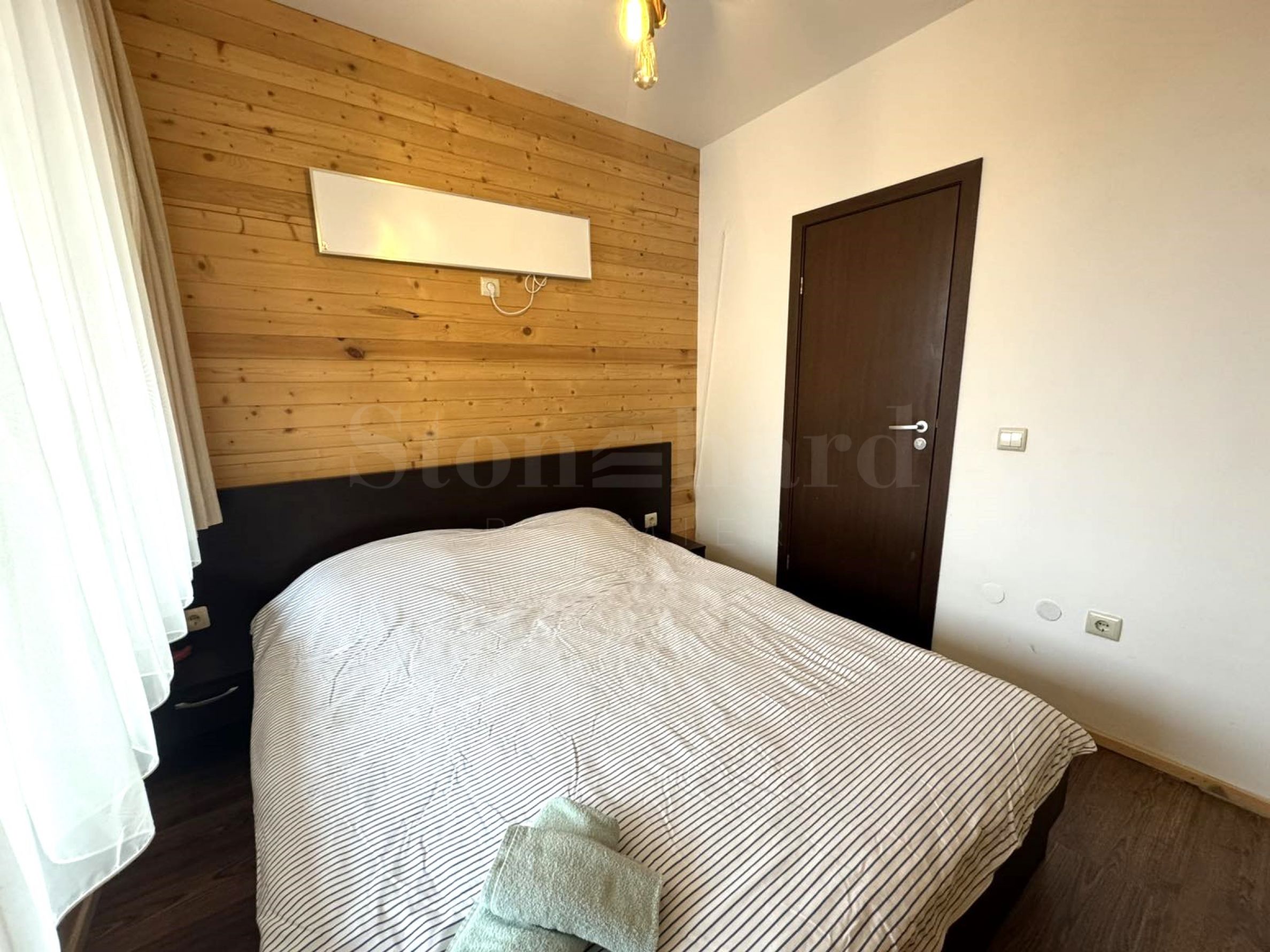 Помещението е оформено с естествена дървена ламперия – типичен елемент за планинския стил в Банско, който носи топлина, комфорт и усещане за традиция.