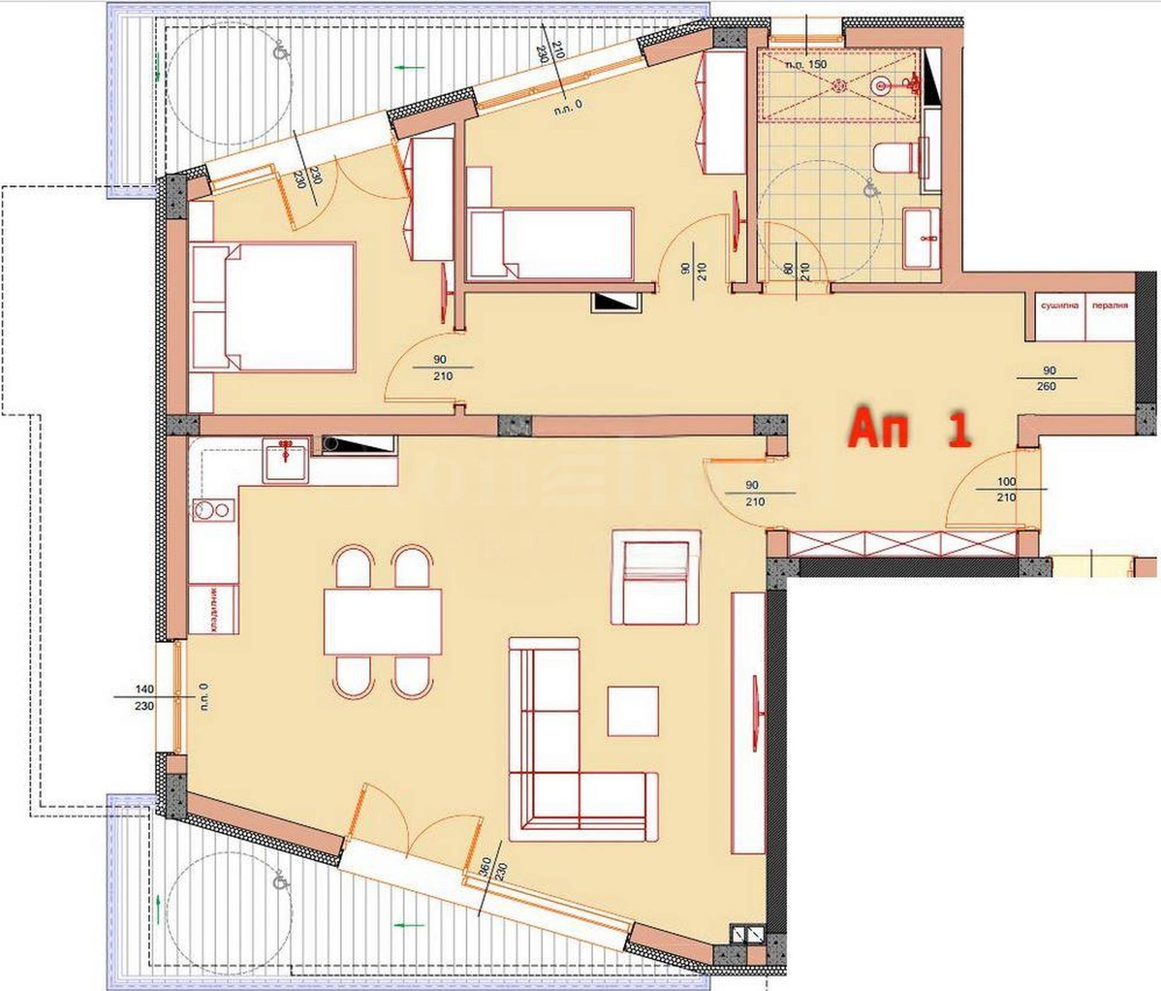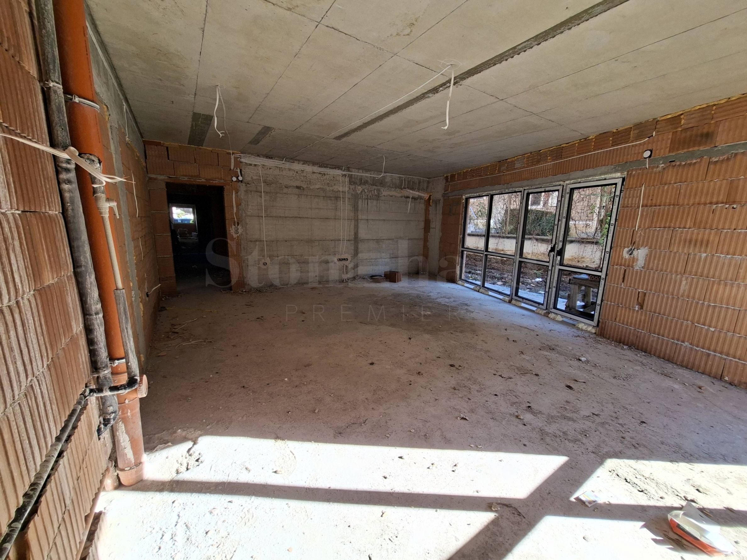 • вътрешни стени: тухлена зидария, мазилка, фина шпакловка и бял латекс.