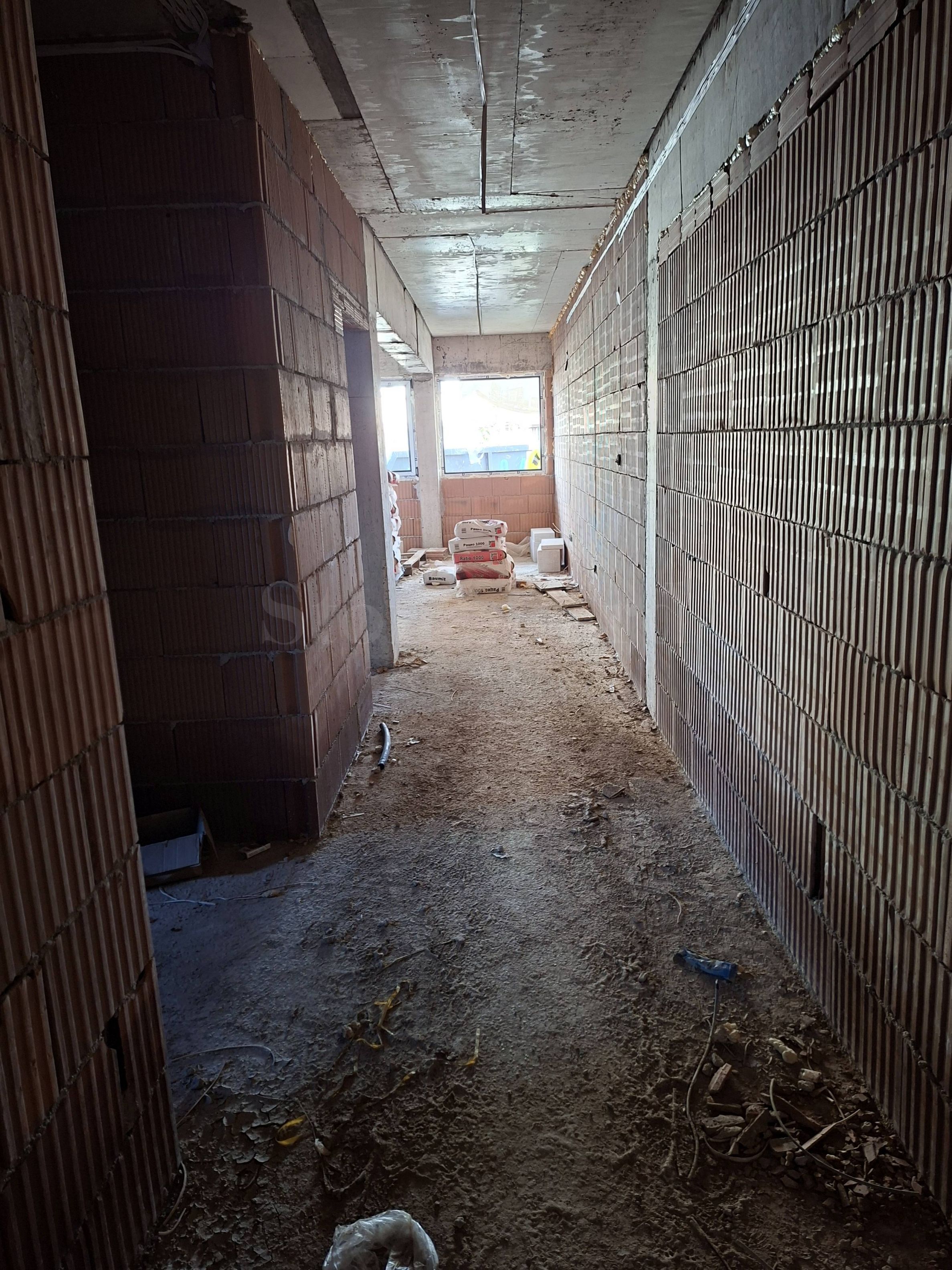 • вътрешни стени: тухлена зидария, мазилка, фина шпакловка и бял латекс.