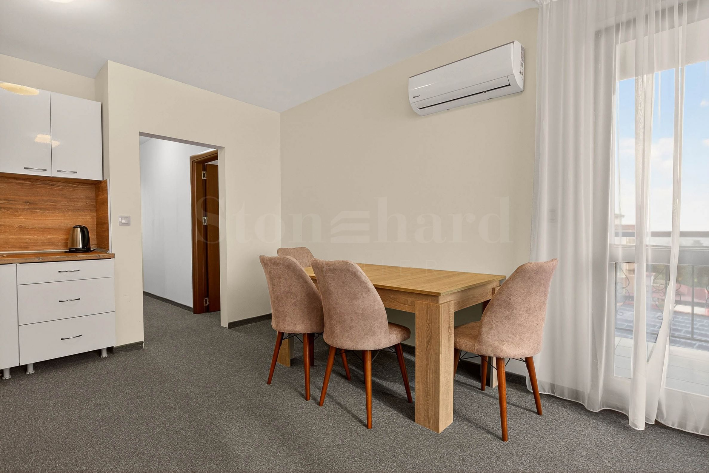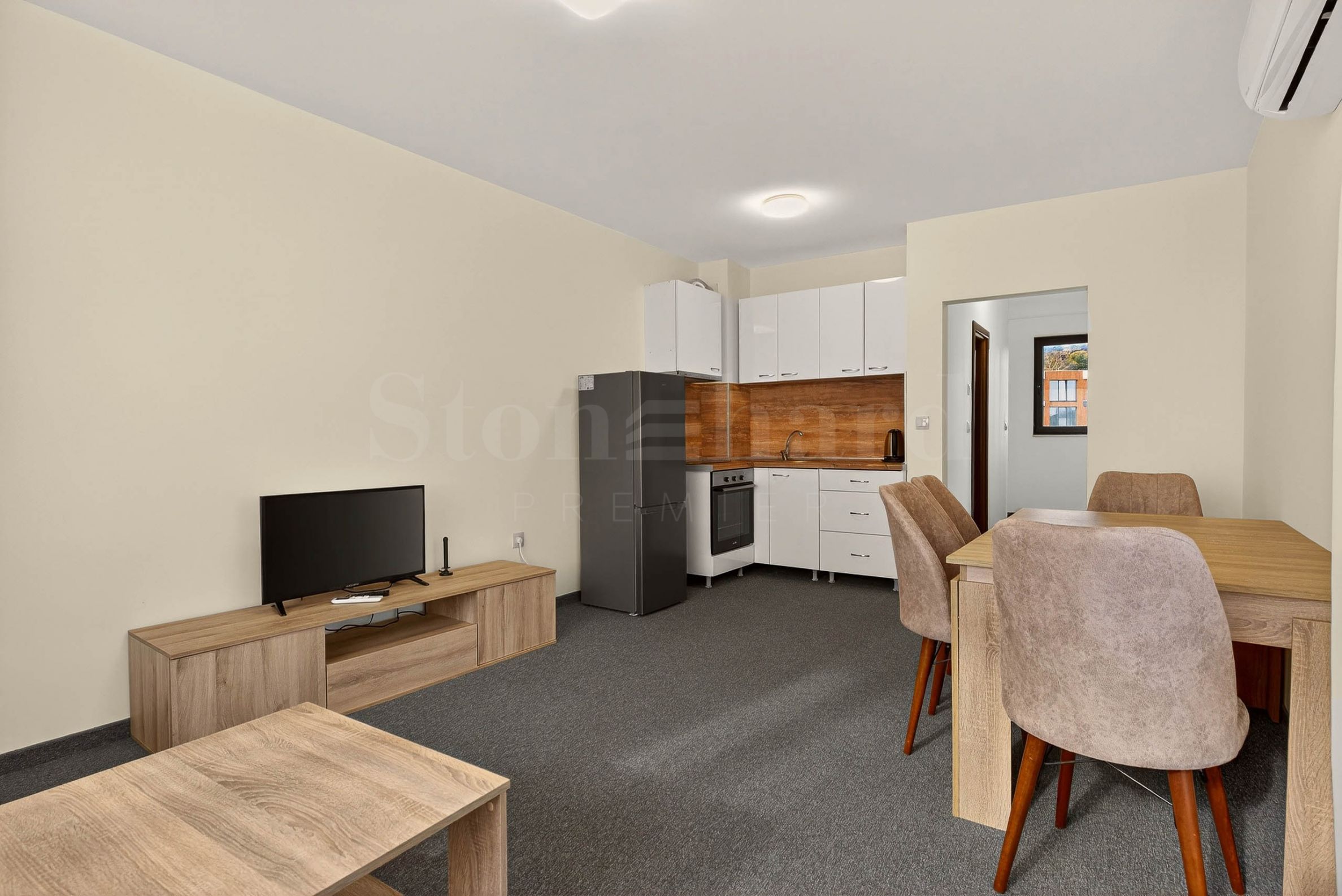 Апартаментът се продава във вида от снимките, напълно обзаведен и оборудван с всичко необходимо за живеене като мебели и ел. уреди. В комплекса има още варианти на двустайни и тристайни апартаменти с възможност за закупуване по БДС или завършени "до ключ".
