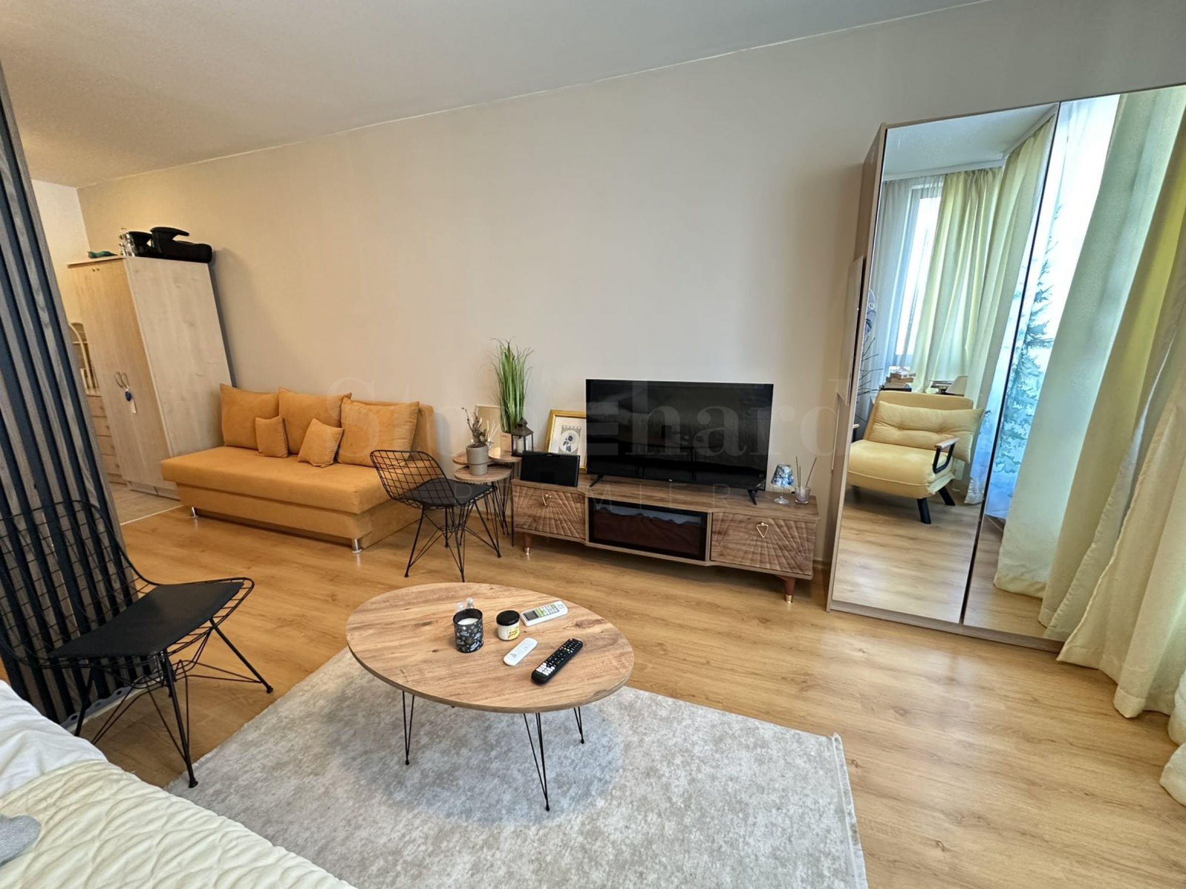 •Дневната и кухненският кът са визуално отделени чрез декоративна стена, която придава стил и ясно разграничение между зоните.
