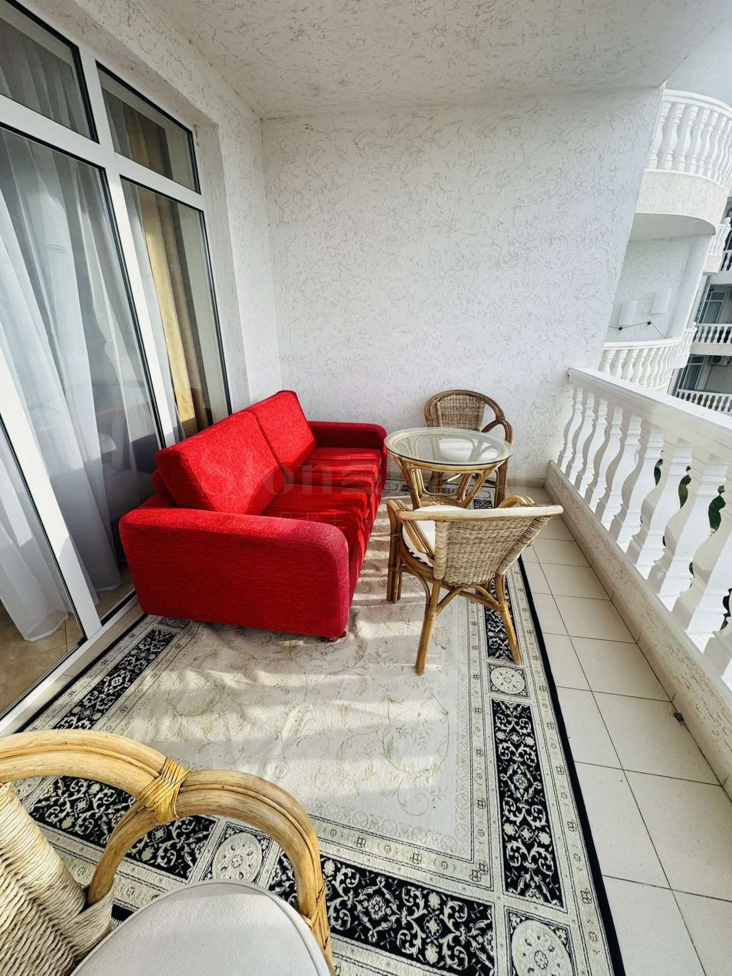 Имотът е с обща площ от 93 кв.м, ситуиран на 4-ти етаж с гледка към морето и басейна.