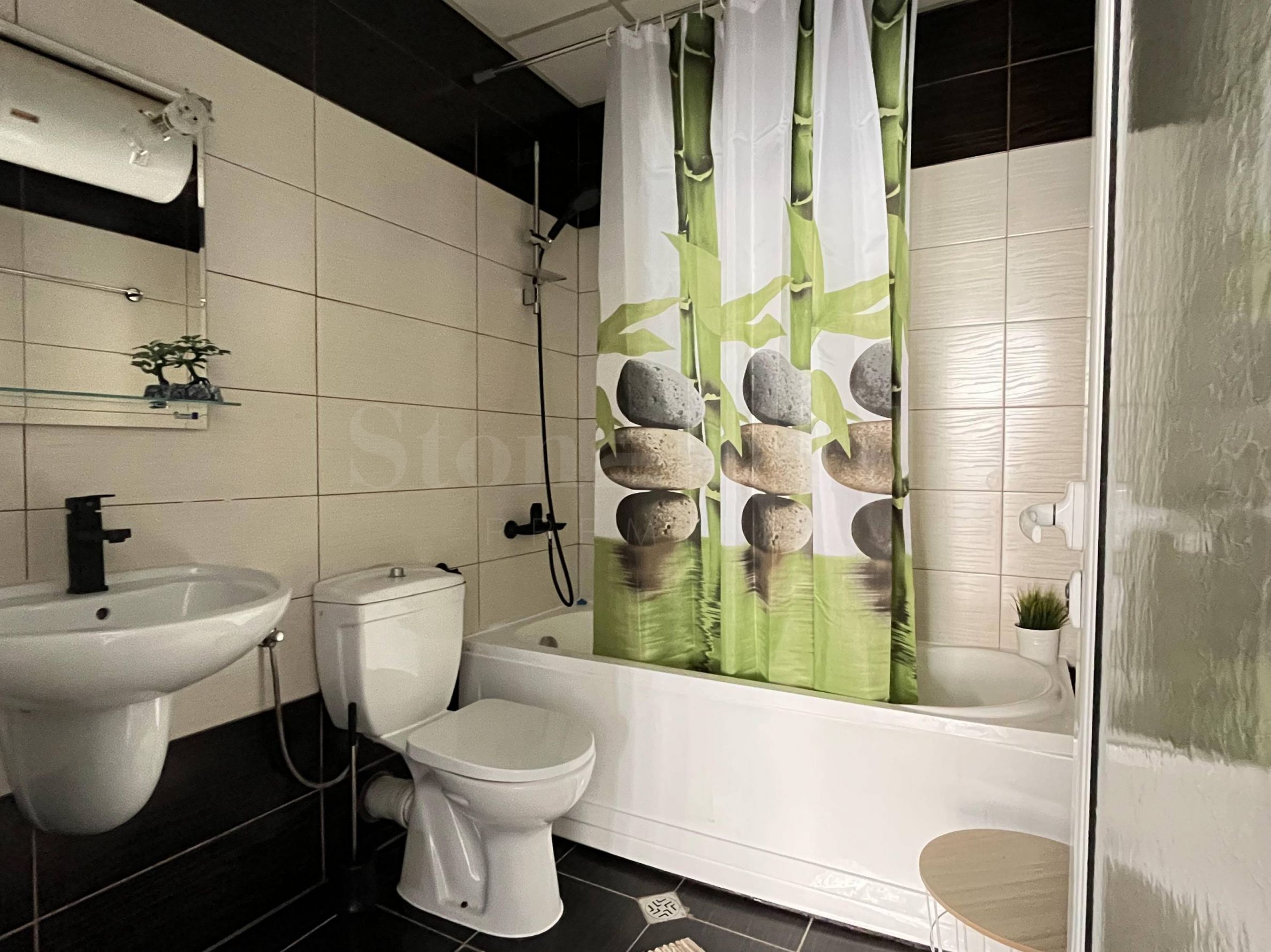 Жилището е след основен ремонт, комфортно обзаведено с чисто нови мебели и техника. Настилките са от гранитогрес в дневната и спалнята, стените са боядисани с латекс, банята е с теракот и санитарен фаянс на Ideal Standard. Отоплението е посредством нов инверторен климатик.