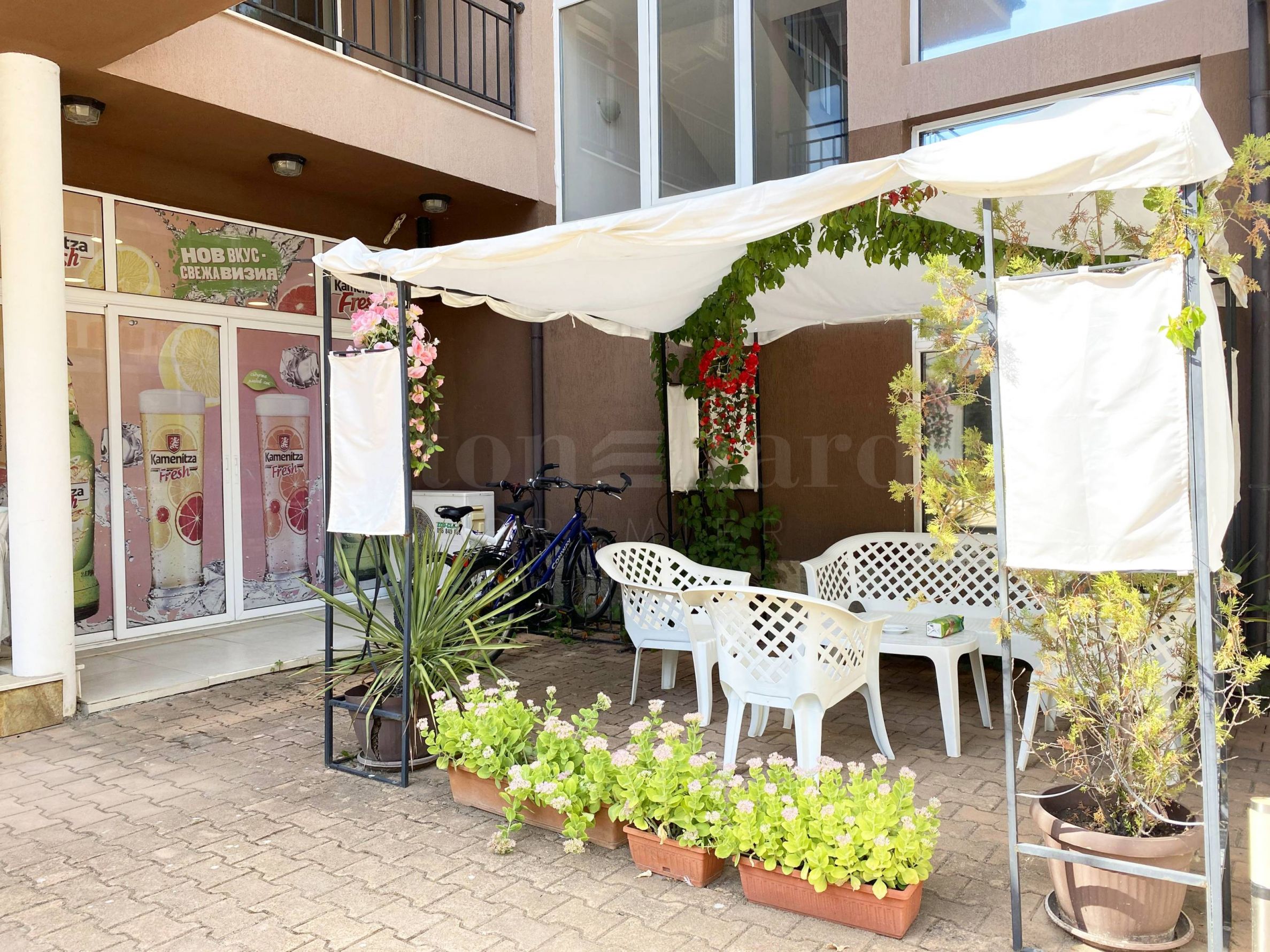 Районът е спокоен, с бърз достъп до плажа. В сградата има супермаркет, на територията - басейн, а в близост кафене, ресторанти, автобусна спирка.