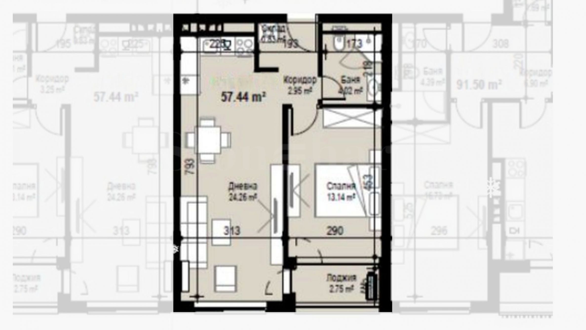 • Застроена площ: 57,44 кв.м. + общи части 10,89 кв.м;