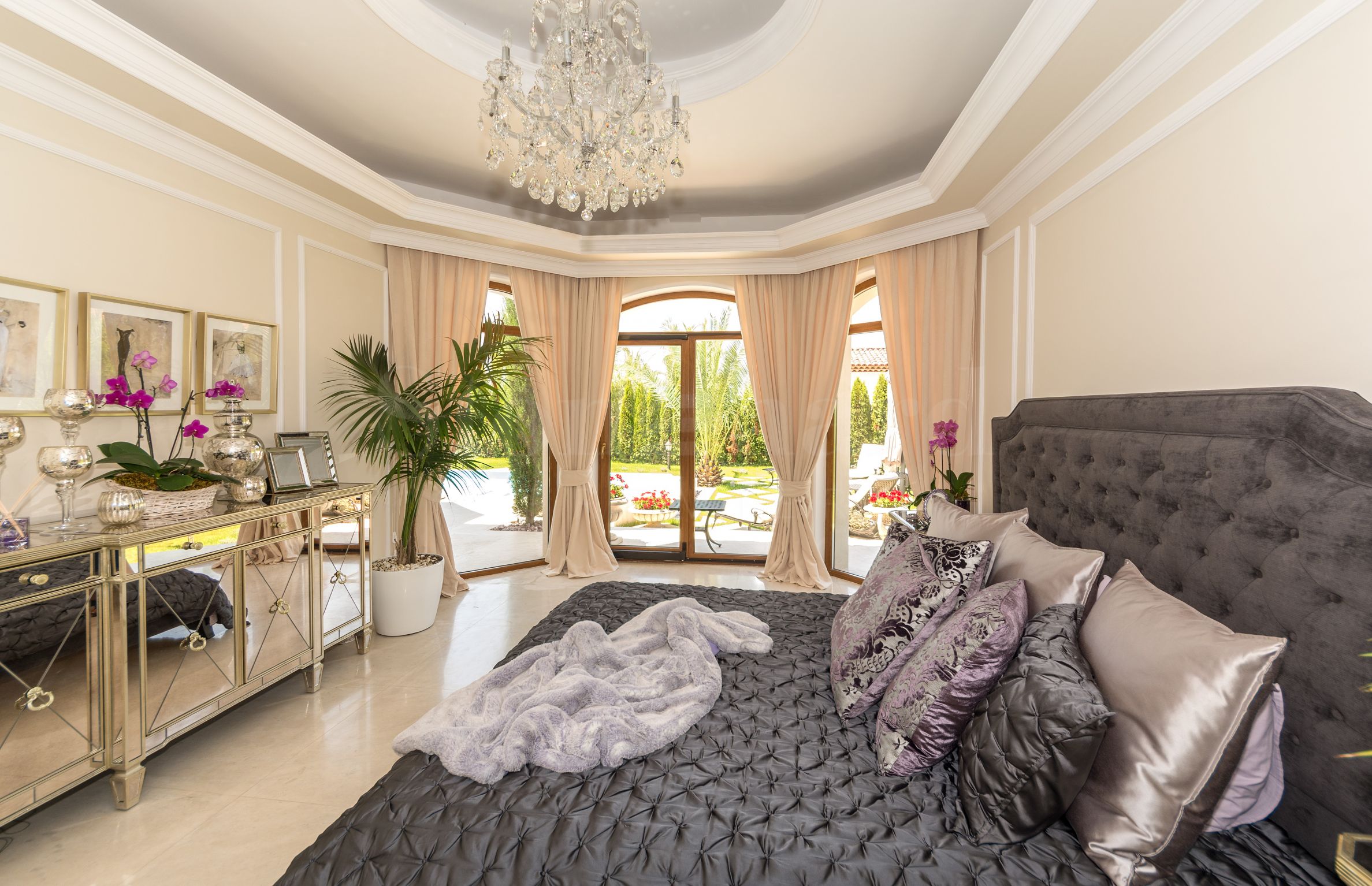 След представителния вход се разкрива просторен хол с open space концепция, обединяваща дневна, кухня и трапезария с обособени зони за отдих и камина. Имотът разполага с три просторни спални, всяка със собствена баня и гардеробно пространство, осигуряващи допълнителен комфорт и уединение.