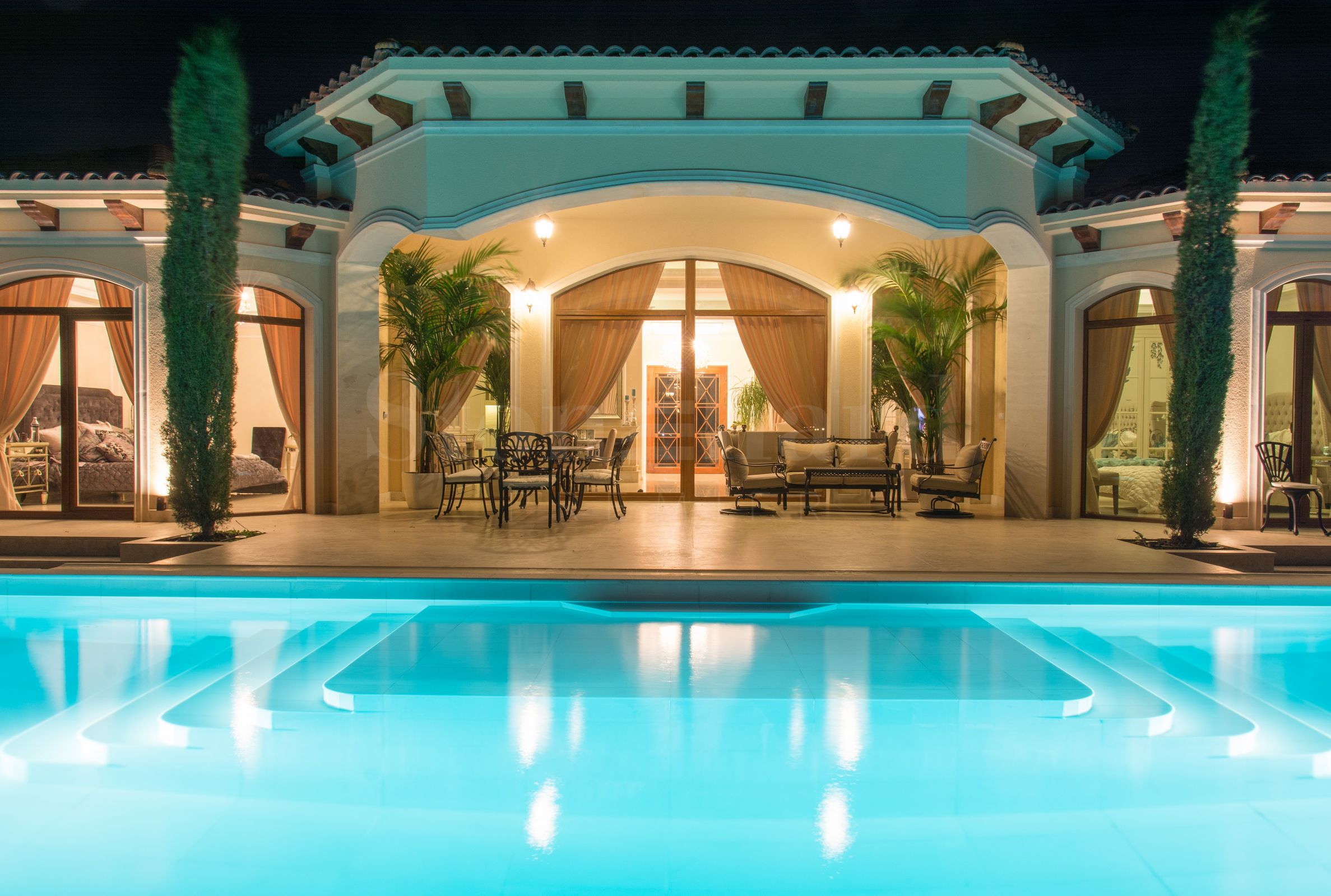 Голямата южна витрина отваря пространството към верандата и оформя естествен преход между интериора и екстериора – идеално място за релакс и приятни вечери. От верандата има директен достъп до впечатляващ басейн с площ 59 кв.м, разположен централно в градината и облицован с естествен мрамор Pyrgos Light.