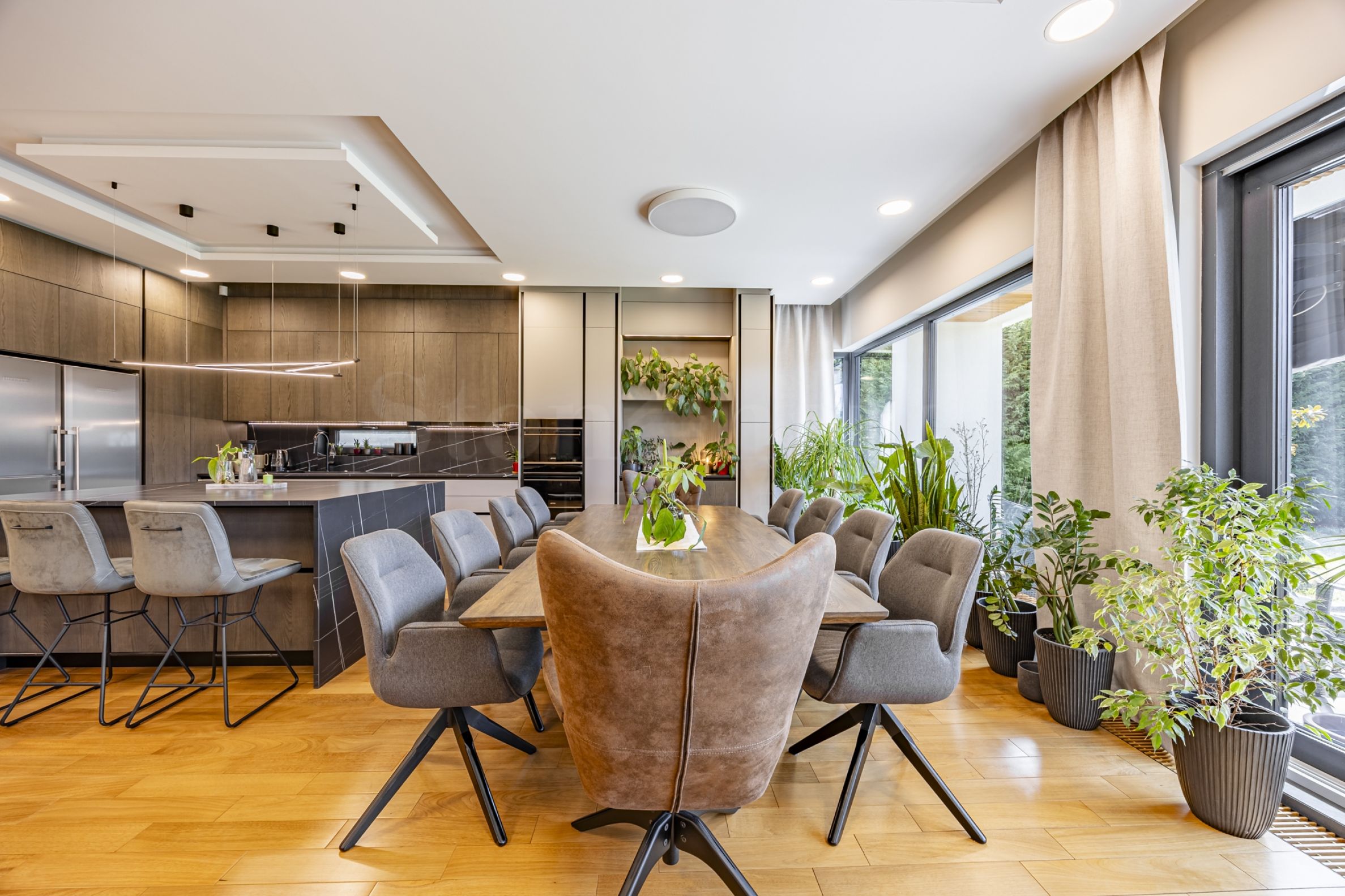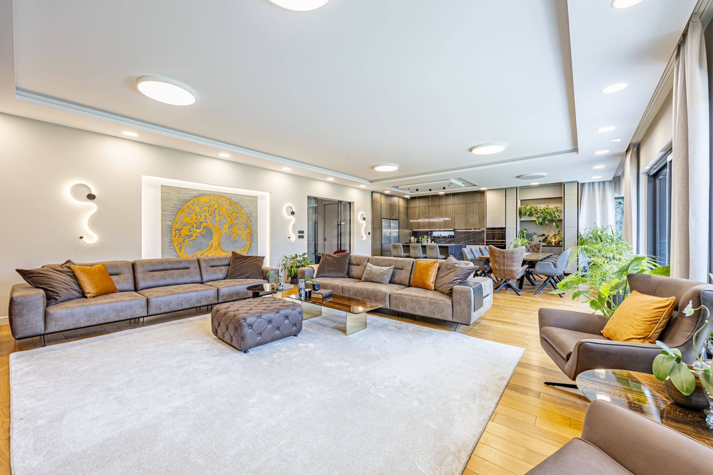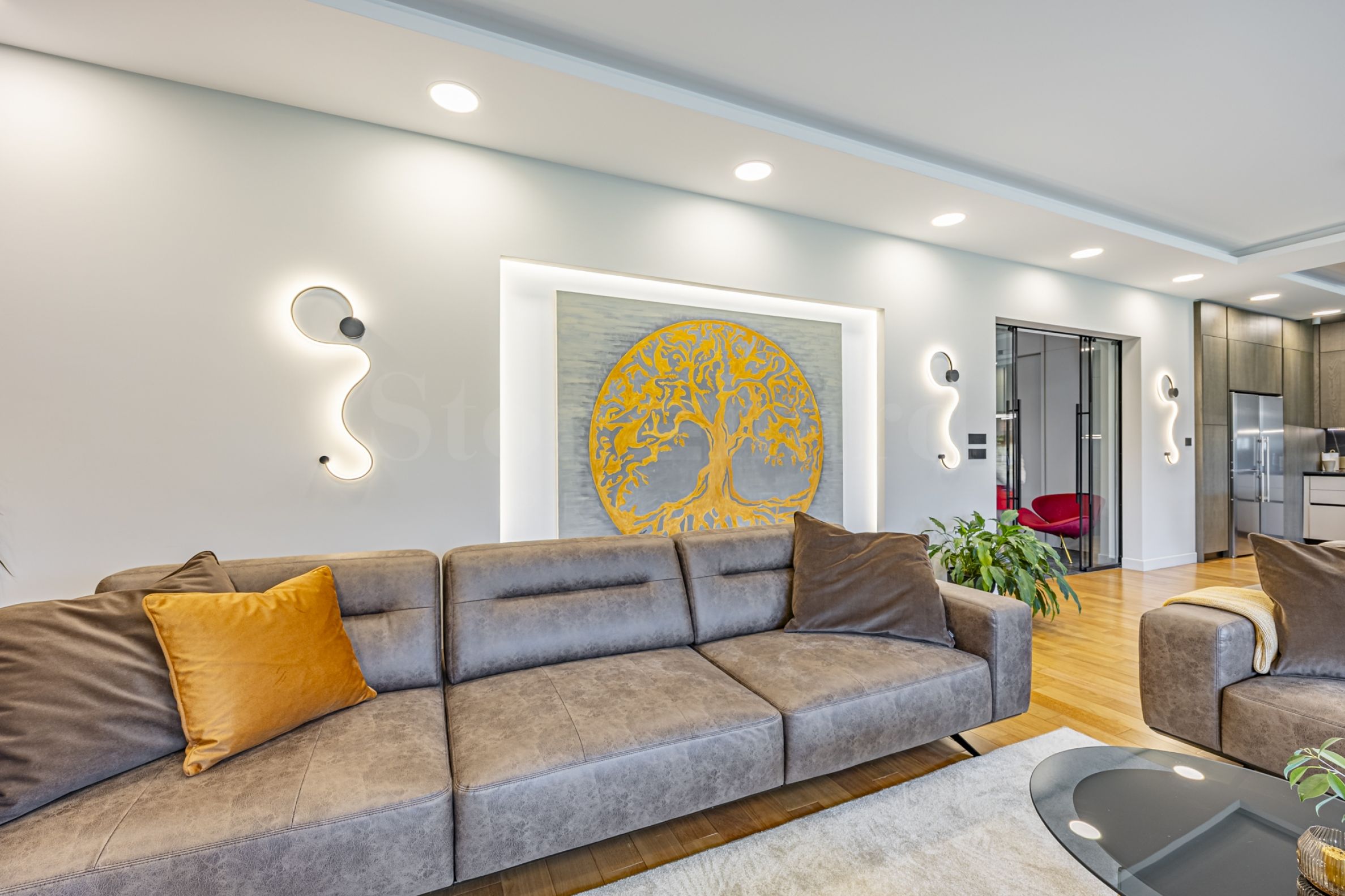 • Основното пространство е заето от просторна дневна зона с камина, трапезария и модерна кухня. Кухнята е оборудвана с висок клас уреди на Smeg и двоен хладилник Liebherr, съчетавайки стил и функционалност.