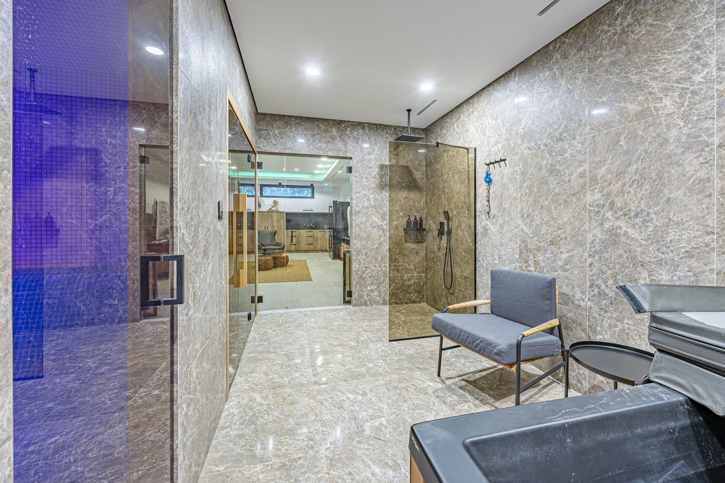 Подземният етаж е проектиран като пространство за пълноценна почивка и възстановяване - частен СПА център в рамките на дома.