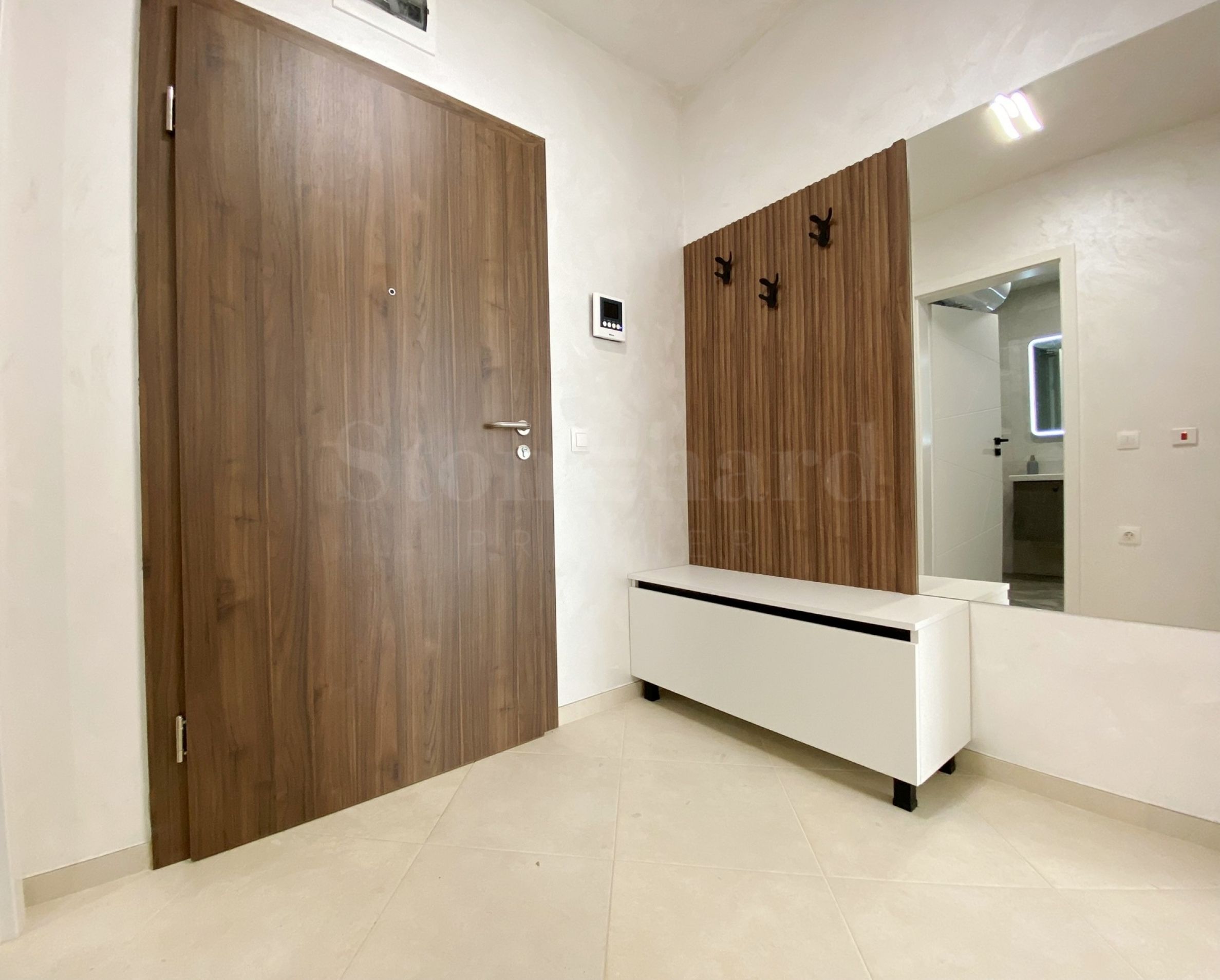 Апартаментът е напълно обзаведен и оборудван с нови мебели и ел. уреди в гаранция, включително съдомиялна. Отоплението и охлаждането са решени с инверторни климатици във всяка стая.